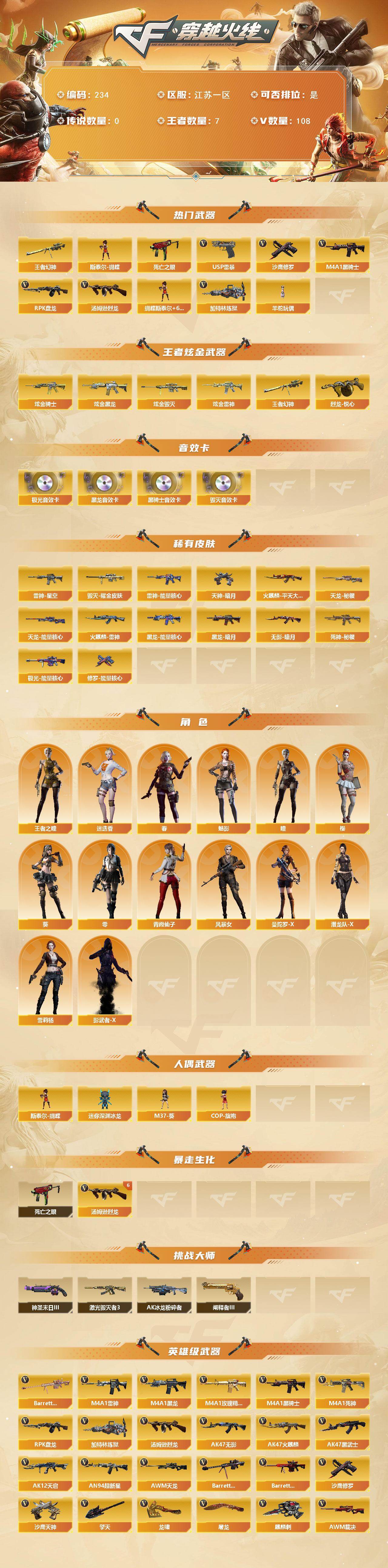 江苏一区-108v-7王者-6炫金 【热门武器】:王者幻神,死亡之眼3,m4a1-黑骑士4,汤姆逊-烈龙8,rpk-盘龙,加特林-炼狱2,斯泰尔-蝴蝶,羊驼玩偶,usp-雷暴,沙鹰-修罗9 【王者炫金武器】:王者幻神,烈龙-悦心,炫金骑士2,炫金黑龙,炫金雷神2,炫金毁灭 【音效卡】:m4a1-黑龙音效卡,m4a1-黑骑士音效卡,barrett-毁灭音效卡,barrett-极光音