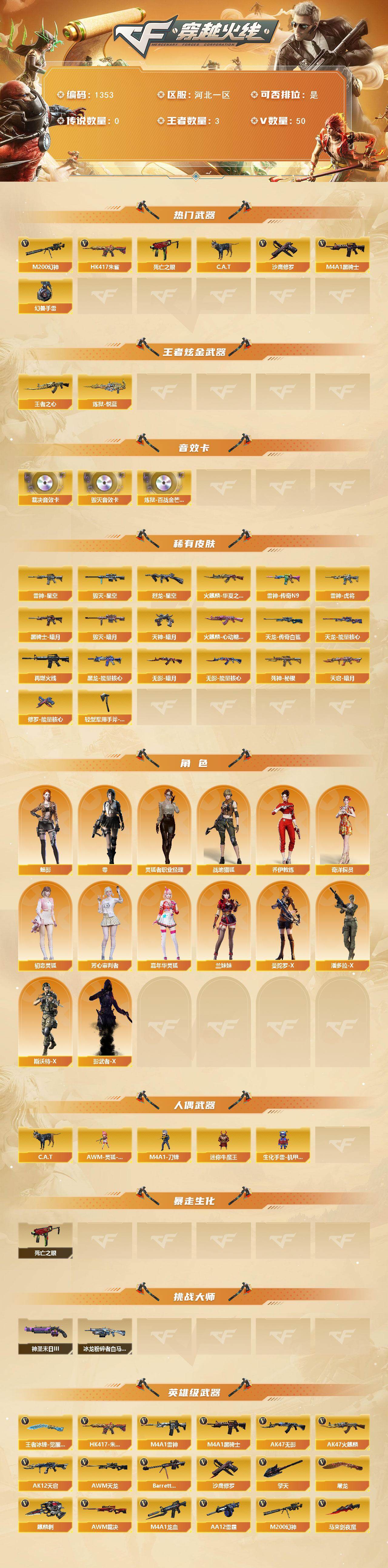 河北一区-46v-2王者-【幻兽套-手蕾套】 【热门武器】:hk417-朱雀,m200-幻神,死亡之眼,c.a.t,m4a1-黑骑士,沙鹰-修罗3,高爆手蕾-幻兽 【王者炫金武器】:王者之心,炼狱-悦蓝 【音效卡】:barrett-毁灭音效卡,awm-裁决音效卡,炼狱-百战金芒-庆典舞曲音效卡 【皮肤】:烈龙-星空,雷神-星空,雷神-虎将,雷神-传奇n9,m4a1-再燃火线,火麒麟-华夏之心