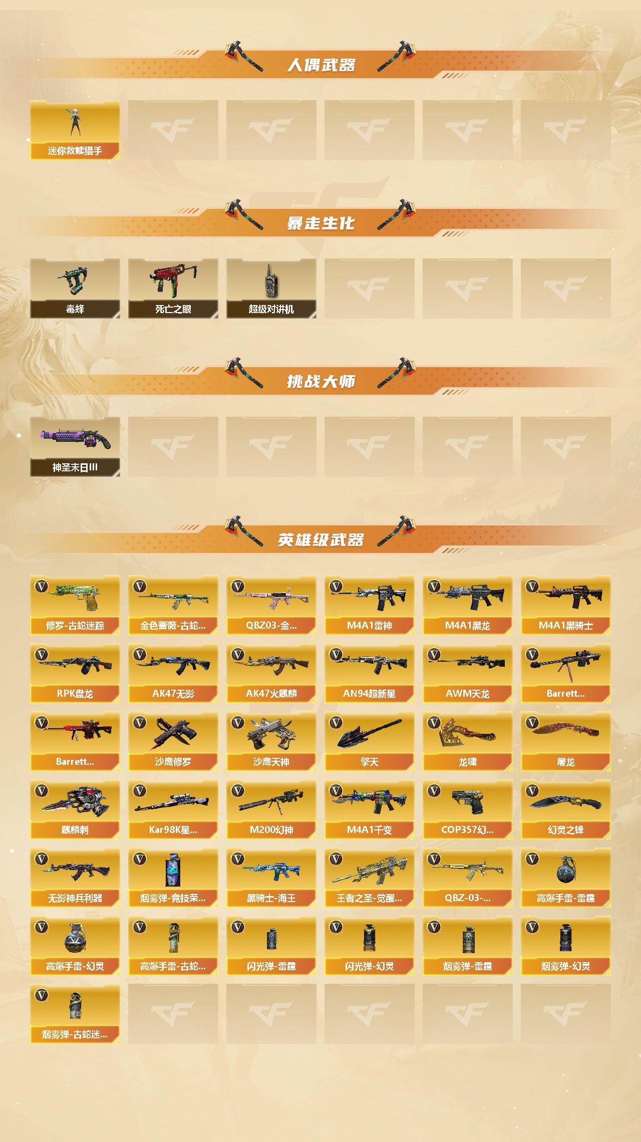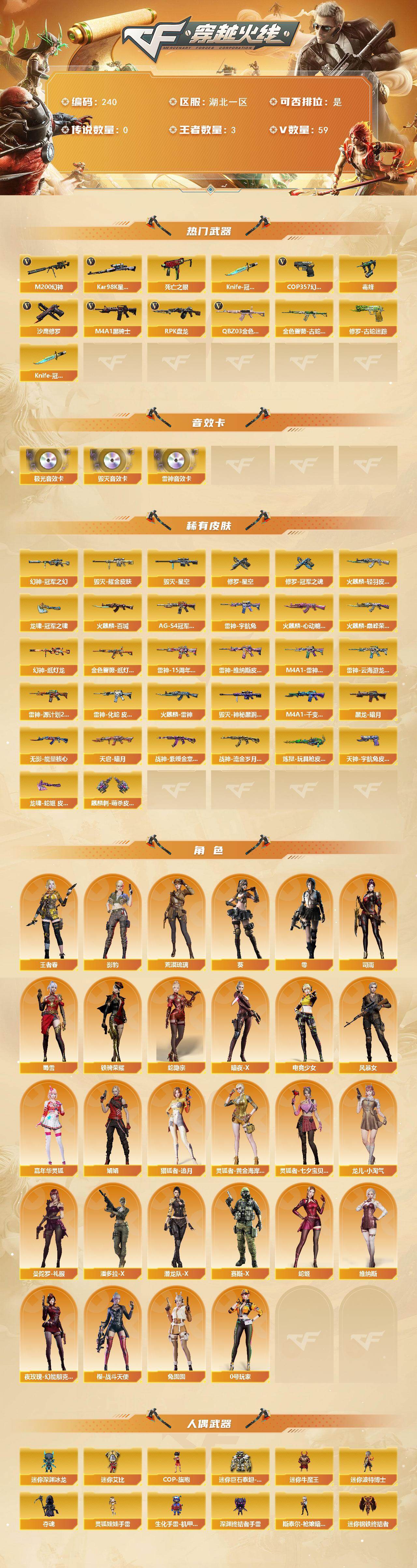湖北一区-59v-3王者-0炫金 【热门武器】:q03-金色蔷薇,m200-幻神,金色蔷薇-古蛇迷踪,修罗-古蛇迷踪,死亡之眼,kar98k-星神,毒蜂,m4a1-黑骑士,rpk-盘龙,cop 357-幻灵,沙鹰-修罗3,knife-冠军之刃2 【音效卡】:m4a1-雷神音效卡,barrett-毁灭音效卡,barrett-极光音效卡 【皮肤】:幻神-冠军之幻,幻神-纸灯龙皮肤,金色蔷薇