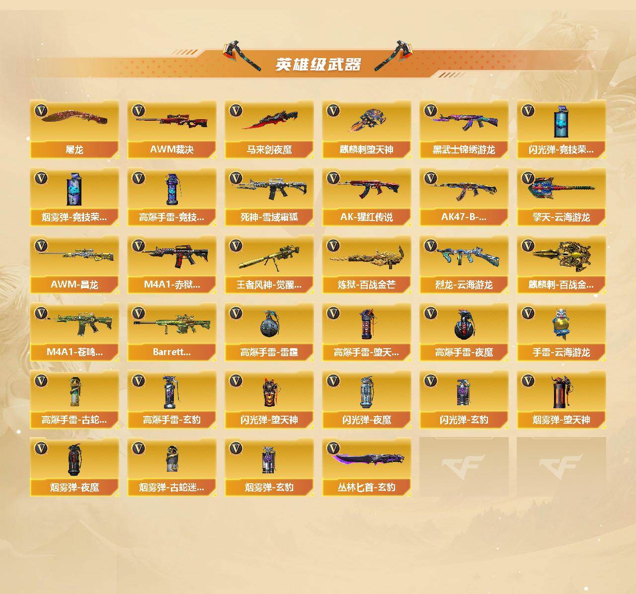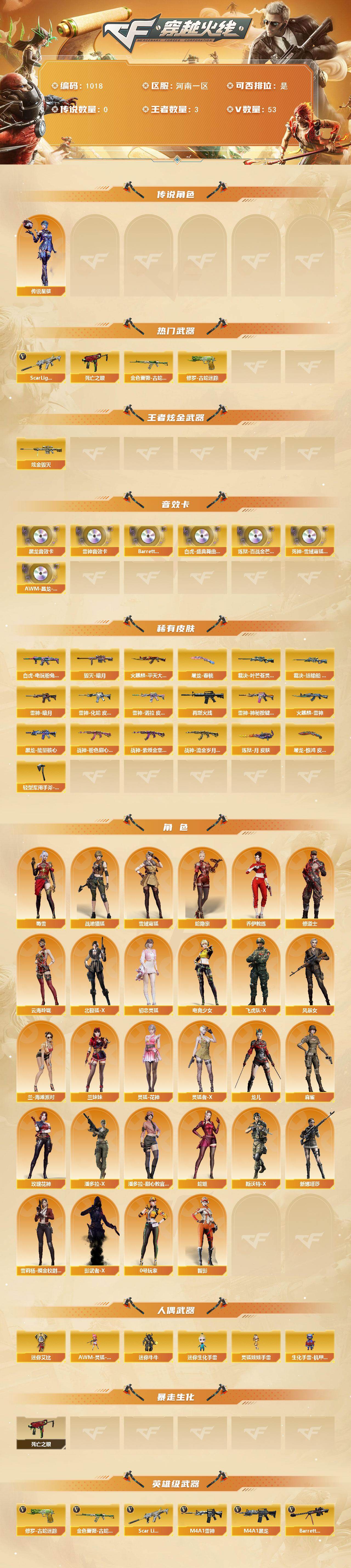 河南一区-53v-3王者-1炫金 【传说角色】:传说星骇 【热门武器】:scar light-白虎,金色蔷薇-古蛇迷踪,修罗-古蛇迷踪,死亡之眼 【王者炫金武器】:炫金毁灭 【音效卡】:m4a1-雷神音效卡,m4a1-黑龙音效卡,barrett-碧霄极光音效卡2,白虎-盛典舞曲音效卡,炼狱-百战金芒-庆典舞曲音效卡,死神-雪域霜狐-怀旧音效卡,awm-昌龙-怀旧音效卡 【皮肤】:白虎-电玩粉