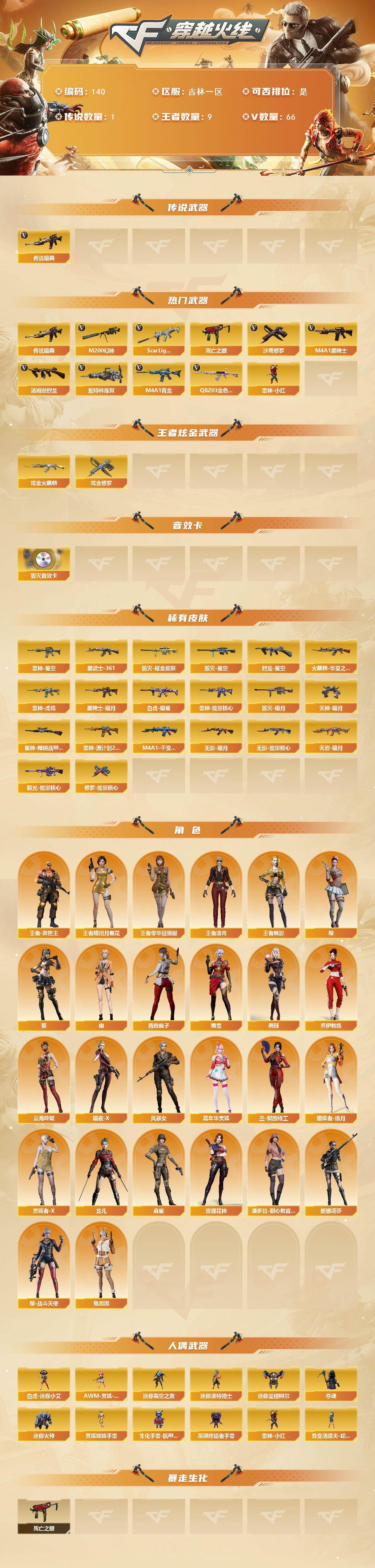 吉林一区-66v-9王者-2炫金 【传说武器】:传说暗裔 【热门武器】:传说暗裔,q03-金色蔷薇,scar light-白虎,m4a1-青龙,m200-幻神,死亡之眼,m4a1-黑骑士3,汤姆逊-烈龙2,加特林-炼狱,雷神-小红,沙鹰-修罗 【王者炫金武器】:炫金火麒麟,炫金修罗 【音效卡】:barrett-毁灭音效卡 【皮肤】:scar light-白虎-暗星,星神-黯钢战甲 皮肤