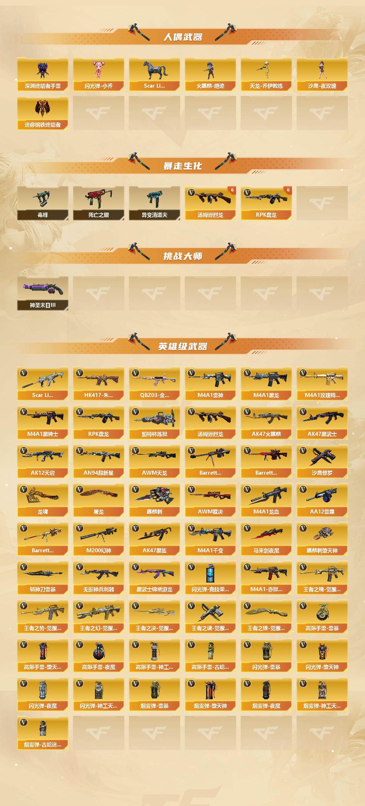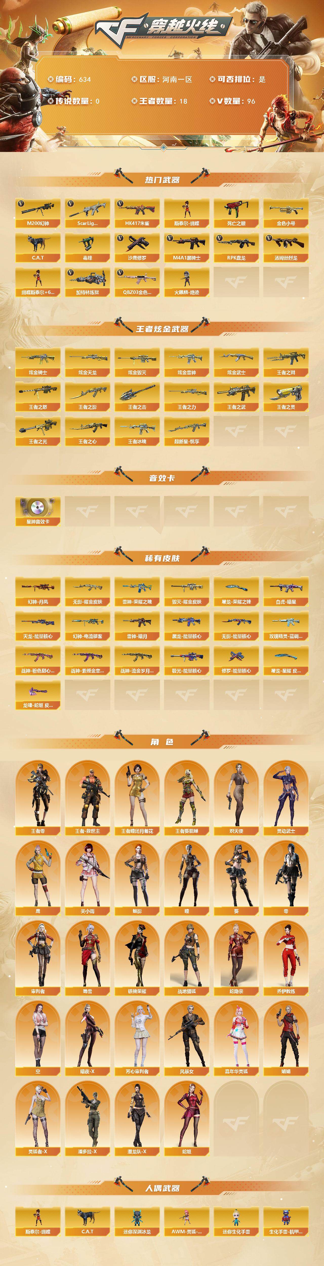 河南一区-96v-18王者-8炫金 【热门武器】:q03-金色蔷薇,scar light-白虎,hk417-朱雀,m200-幻神,死亡之眼,金色小号,c.a.t,毒蜂,m4a1-黑骑士,汤姆逊-烈龙6,rpk-盘龙6,加特林-炼狱,斯泰尔-蝴蝶,火麒麟-绝迹,沙鹰-修罗6 【王者炫金武器】:王者冰魄,王者之戮,超新星-悦享,王者之武,王者之影,王者之心,王者之光,王者之怒,王者之力,