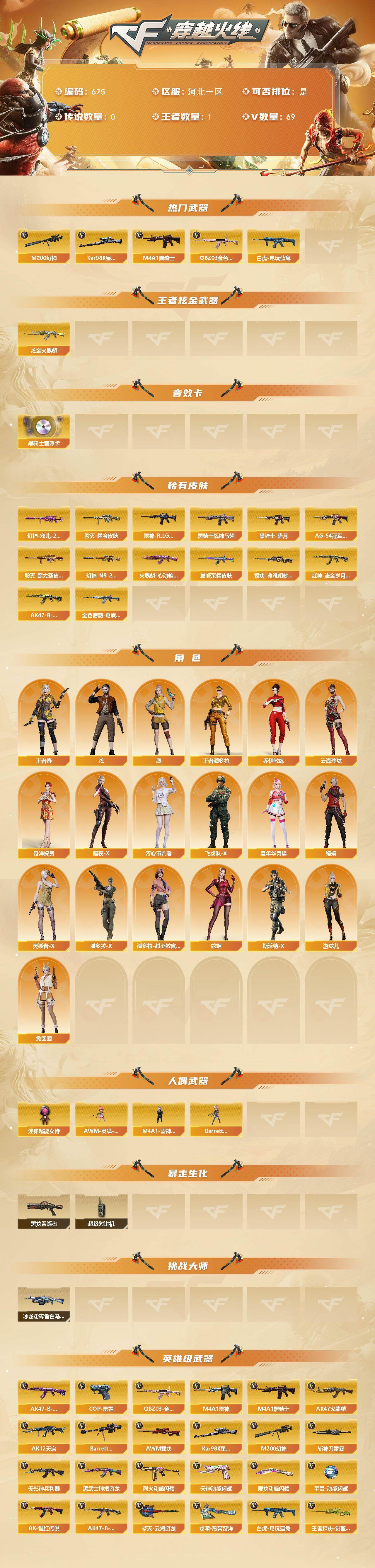 河北一区-69v-1王者-1炫金 【热门武器】:q03-金色蔷薇,m200-幻神2,白虎-电玩蓝兔,kar98k-星神,m4a1-黑骑士 【王者炫金武器】:炫金火麒麟 【音效卡】:m4a1-黑骑士音效卡 【皮肤】:幻神-宠儿-2021mvp,m200-幻神-n9-2022mvp,q03-巅峰荣耀皮肤,金色蔷薇-电竞之星 皮肤,裁决-典雅胡桃 皮肤,雷神-r.lgd-cfpls18冠军