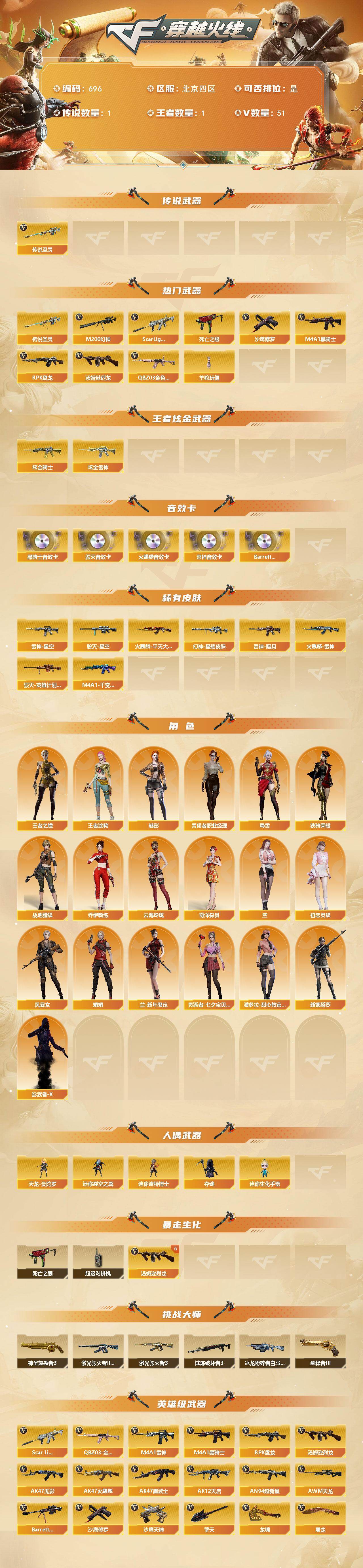北京四区-51v-1王者-2炫金 【传说武器】:传说圣灵 【热门武器】:传说圣灵,q03-金色蔷薇2,scar light-白虎,m200-幻神,死亡之眼,m4a1-黑骑士,汤姆逊-烈龙6,rpk-盘龙,羊驼玩偶2,沙鹰-修罗3 【王者炫金武器】:炫金骑士,炫金雷神 【音效卡】:ak47-火麒麟音效卡,m4a1-雷神音效卡,m4a1-黑骑士音效卡,barrett-毁灭音效卡,bar