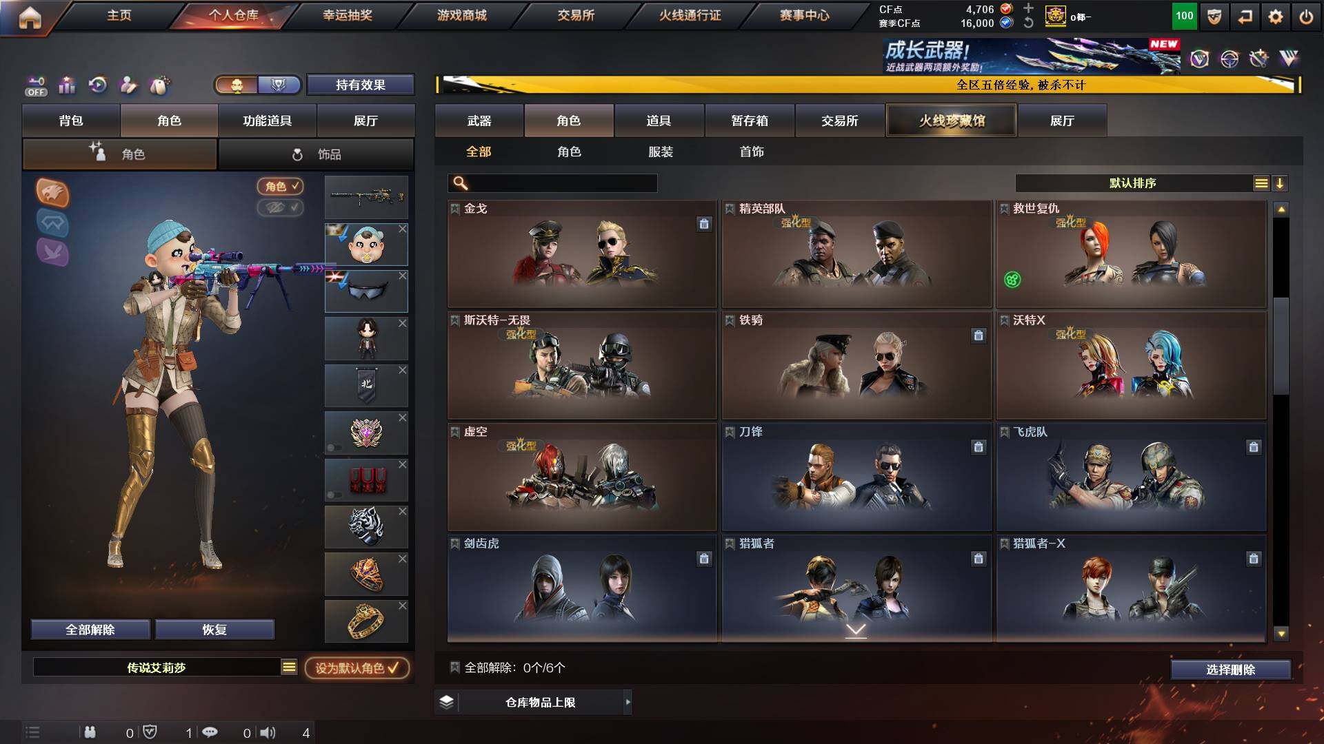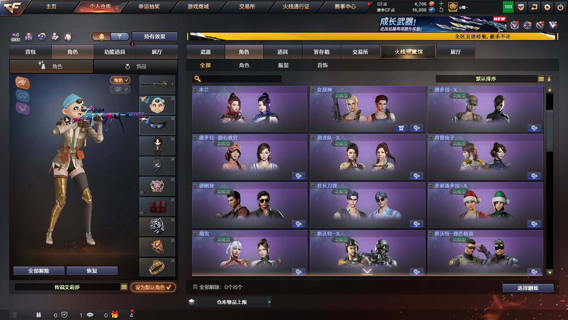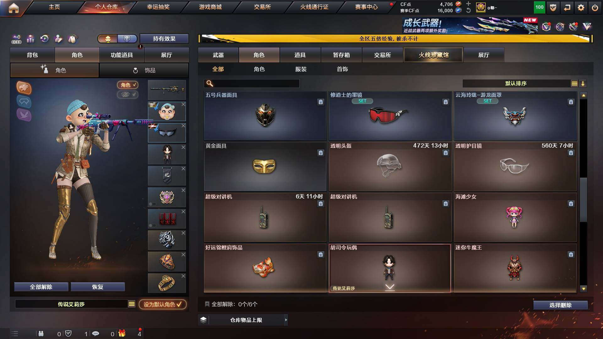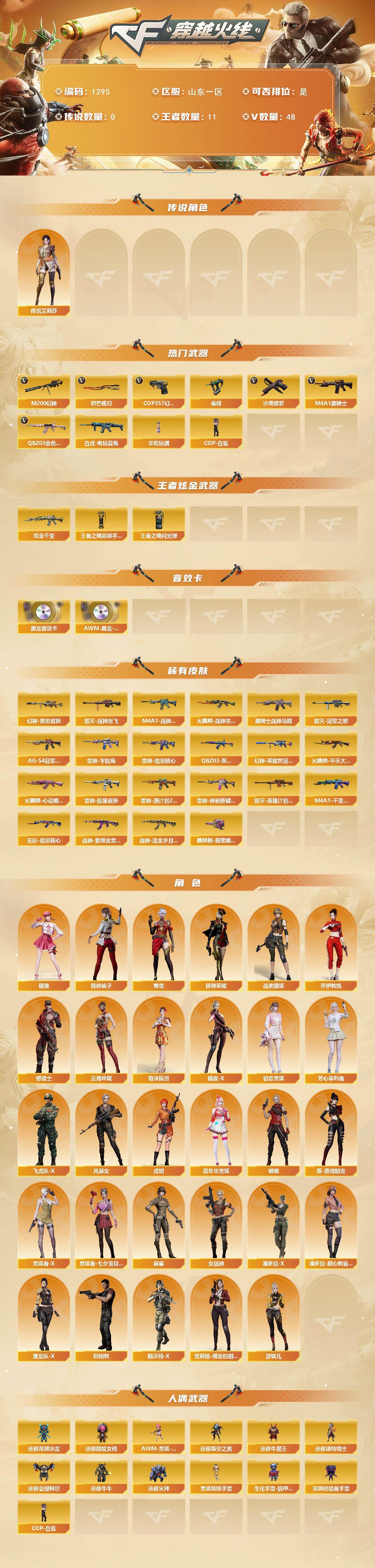 山东一区-48v-11王者-1炫金 【传说角色】:传说艾莉莎 【热门武器】:q03-金色蔷薇,m200-幻神,白虎-电玩蓝兔,毒蜂,m4a1-黑骑士3,羊驼玩偶,cop-白鲨,cop 357-幻灵,沙鹰-修罗3,炽芒蝶刃 【王者炫金武器】:炫金千变,王者之魄高爆手蕾2,王者之魄闪光丹2 【音效卡】:m4a1-黑龙音效卡,awm-昌龙-怀旧音效卡 【皮肤】:m200-幻神-黄忠皮肤,