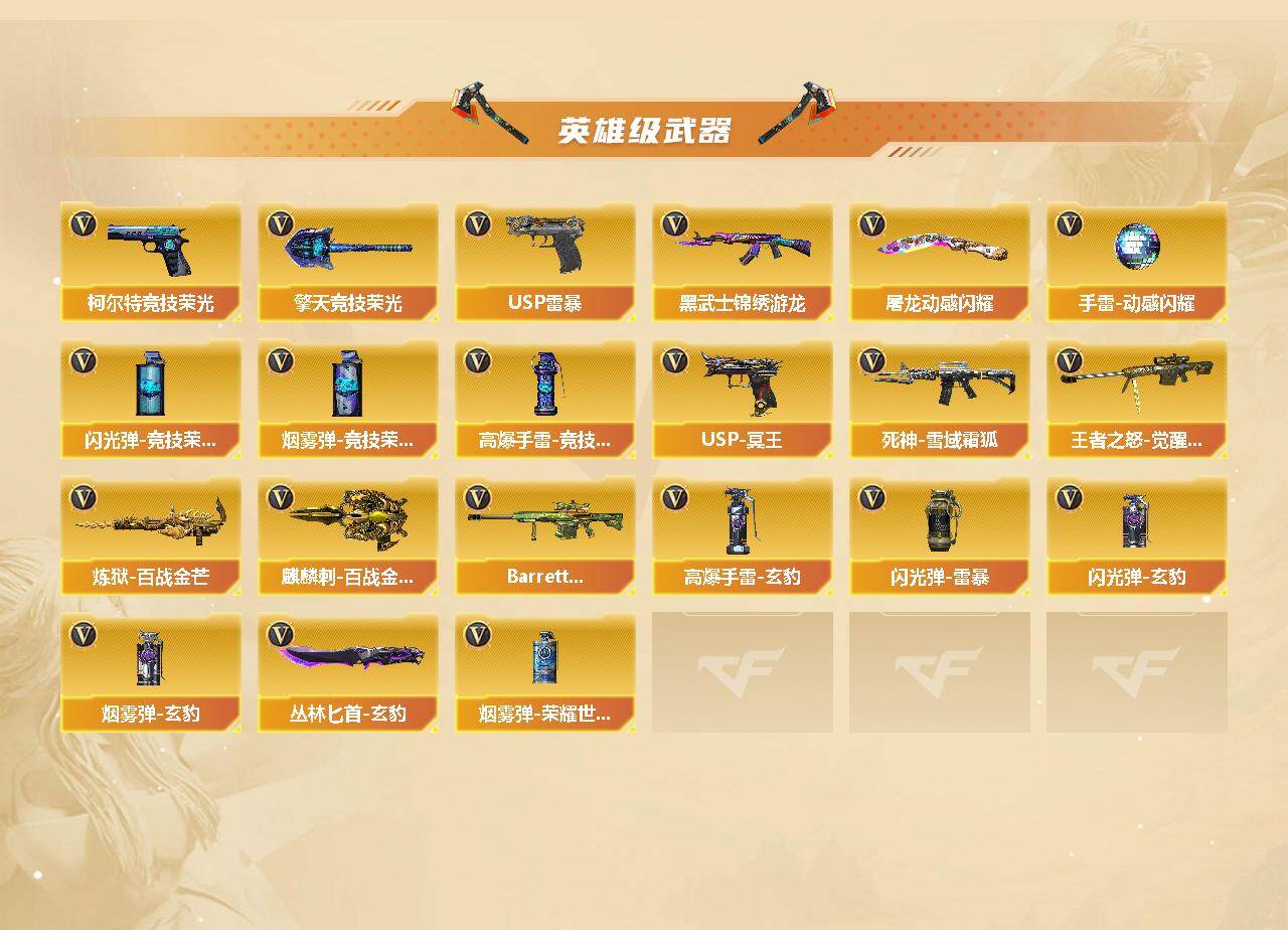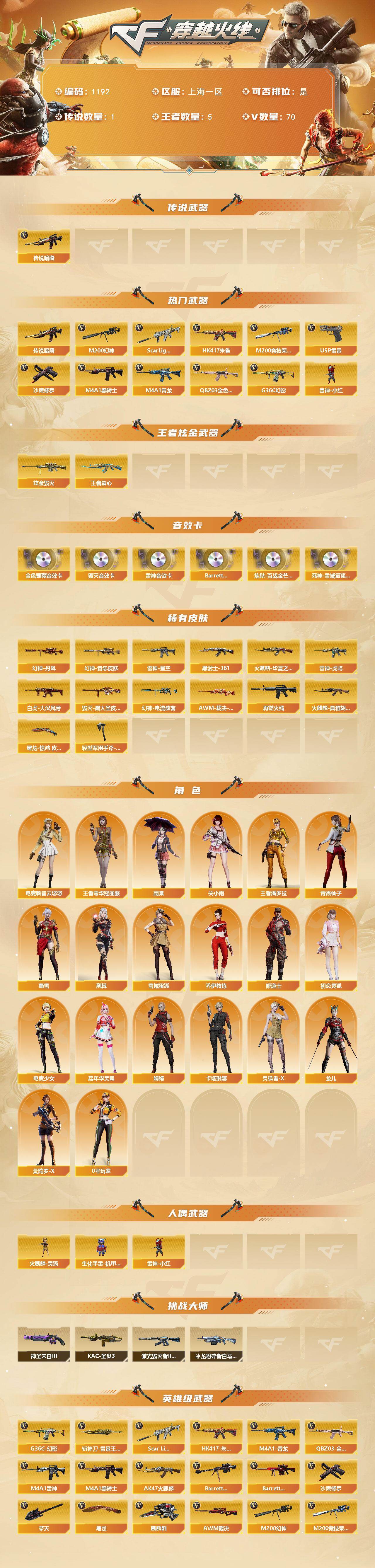 上海一区-70v-5王者-1炫金 【传说武器】:传说暗裔 【热门武器】:传说暗裔,g36c-幻影,q03-金色蔷薇,scar light-白虎,hk417-朱雀,m4a1-青龙,m200-幻神,m200-竞技荣光,m4a1-黑骑士,雷神-小红,usp-雷暴,沙鹰-修罗5 【王者炫金武器】:王者霜心,炫金毁灭 【音效卡】:m4a1-雷神音效卡,barrett-毁灭音效卡,q03-金色蔷