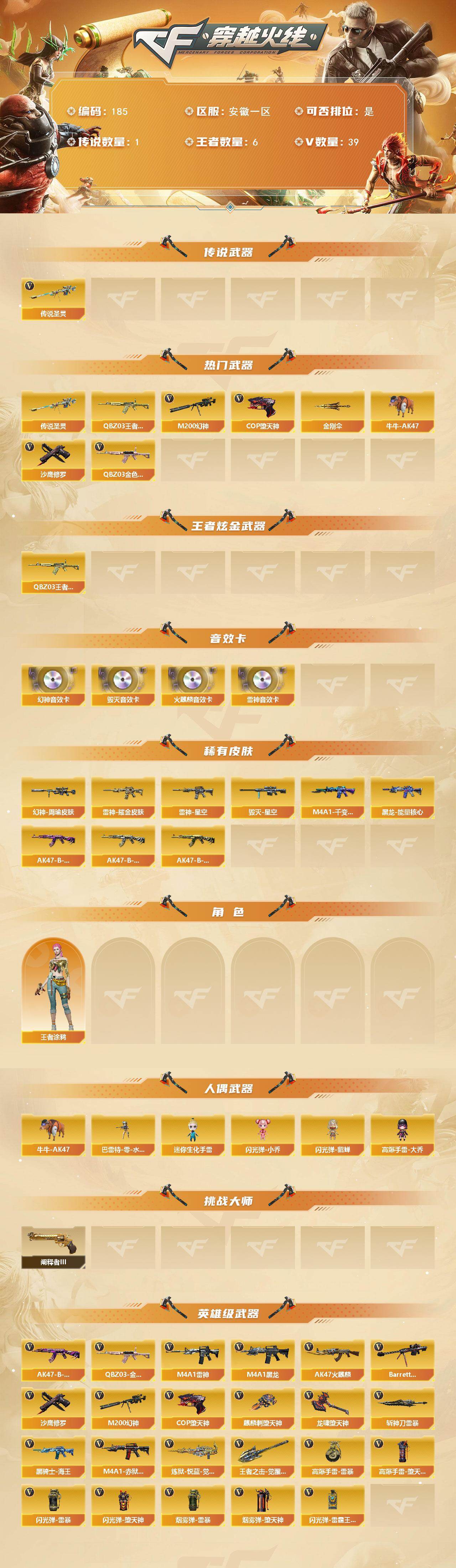 安徽一区-39v-6王者-0炫金 【传说武器】:传说圣灵 【热门武器】:传说圣灵,q03-金色蔷薇,m200-幻神,q-03-王者蔷薇,牛牛-ak47,cop-堕天神,沙鹰-修罗3,金刚伞 【王者炫金武器】:q-03-王者蔷薇 【音效卡】:m200-幻神音效卡,ak47-火麒麟音效卡,m4a1-雷神音效卡,barrett-毁灭音效卡 【皮肤】:幻神-周瑜皮肤,雷神-星空,雷神-耀