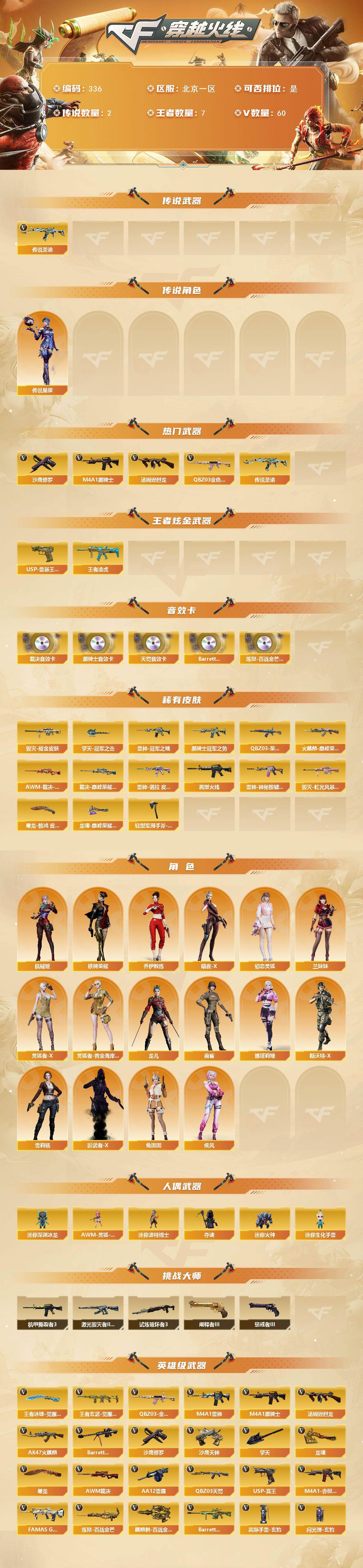 北京一区-60v-7王者-0炫金 【传说武器】:传说圣谕 【传说角色】:传说星骇 【热门武器】:传说圣谕,q03-金色蔷薇,m4a1-黑骑士,汤姆逊-烈龙3,沙鹰-修罗 【王者炫金武器】:王者凌虎,usp-雷暴王者 【音效卡】:m4a1-黑骑士音效卡,awm-裁决音效卡,q03-天罚音效卡,barrett-碧霄极光音效卡,炼狱-百战金芒-庆典舞曲音效卡 【皮肤】:q03-荣耀世冠