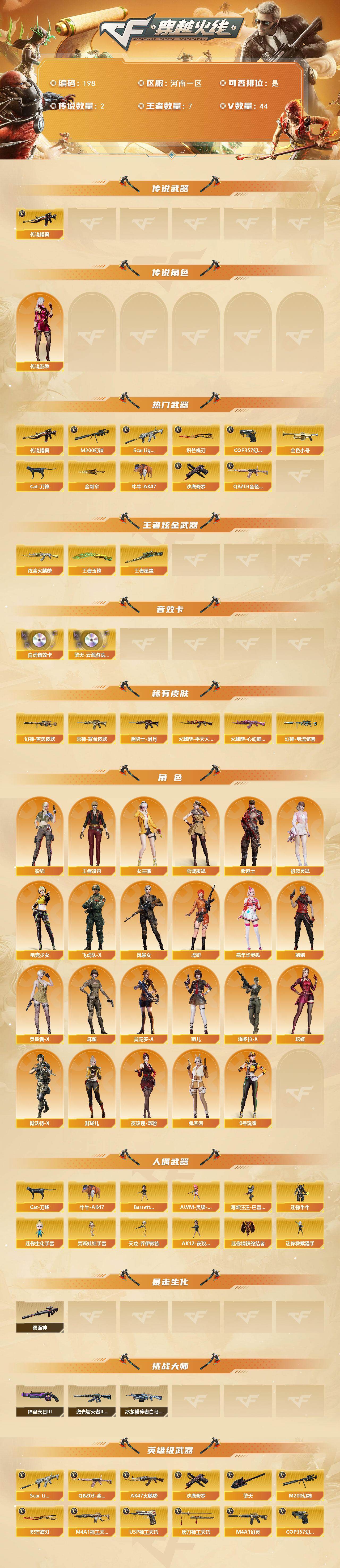 河南一区-44v-5王者-1炫金 【传说武器】:传说暗裔 【传说角色】:传说影煞 【热门武器】:传说暗裔,q03-金色蔷薇,scar light-白虎,m200-幻神,金色小号,cat-刀锋,牛牛-ak47,cop 357-幻灵3,沙鹰-修罗2,炽芒蝶刃,金刚伞 【王者炫金武器】:王者星霆,王者玉锋,炫金火麒麟 【音效卡】:擎天-云海游龙音效卡,scar light-白虎音效卡 【皮肤