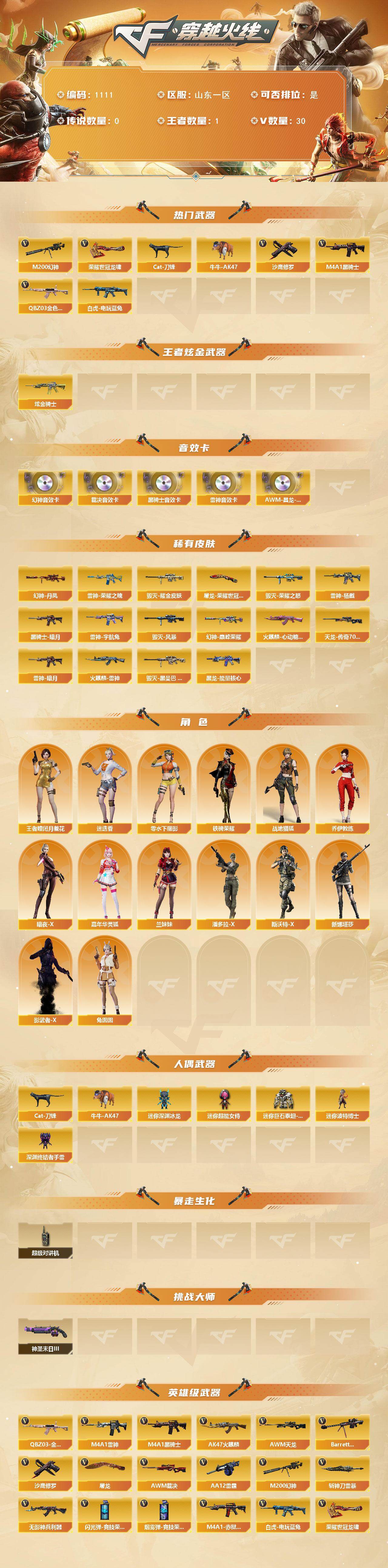 山东一区-30v-1王者-1炫金 【热门武器】:q03-金色蔷薇,m200-幻神,白虎-电玩蓝兔,cat-刀锋,牛牛-ak47,m4a1-黑骑士,沙鹰-修罗5,荣耀世冠-龙啸 【王者炫金武器】:炫金骑士 【音效卡】:m200-幻神音效卡,m4a1-雷神音效卡,m4a1-黑骑士音效卡,awm-裁决音效卡,awm-昌龙-怀旧音效卡 【皮肤】:幻神-丹凤,幻神-巅峰荣耀,雷神-暗月,雷神-荣耀