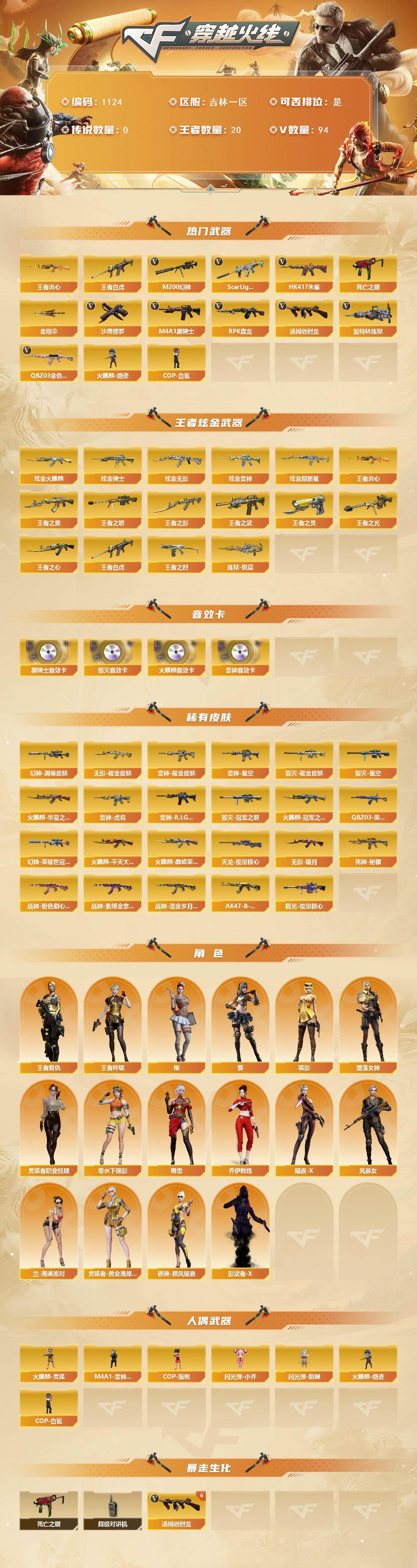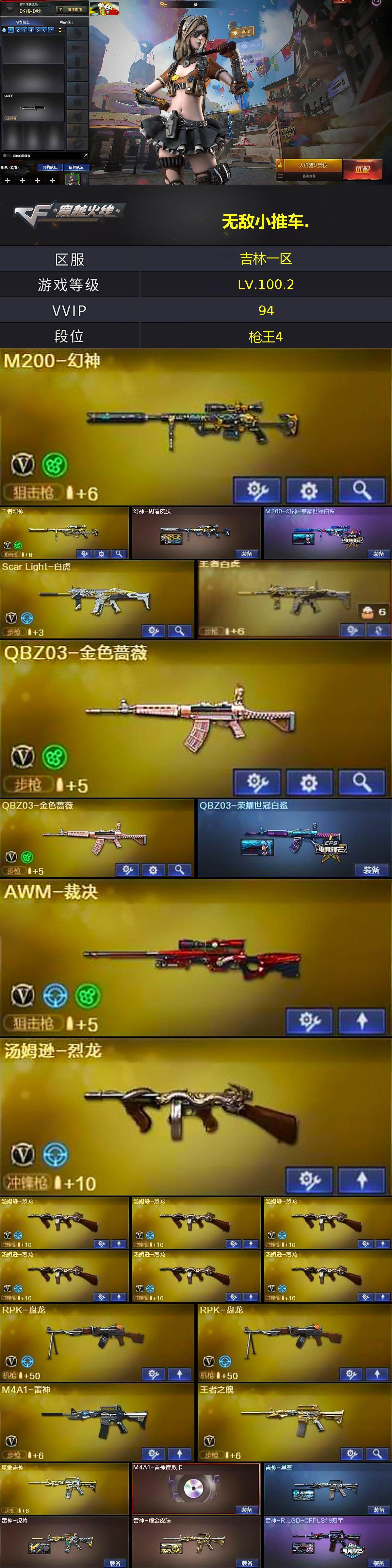 吉林一区-94v-20王者-5炫金 【热门武器】:王者白虎,q03-金色蔷薇2,scar light-白虎,hk417-朱雀,m200-幻神,死亡之眼,王者炎心,m4a1-黑骑士,汤姆逊-烈龙7,rpk-盘龙2,加特林-炼狱,火麒麟-绝迹,cop-白鲨,沙鹰-修罗6,金刚伞 【王者炫金武器】:王者炎心,王者之翼2,王者之武,王者之影,王者之心,王者白虎,王者之烈,王者之光,王者之