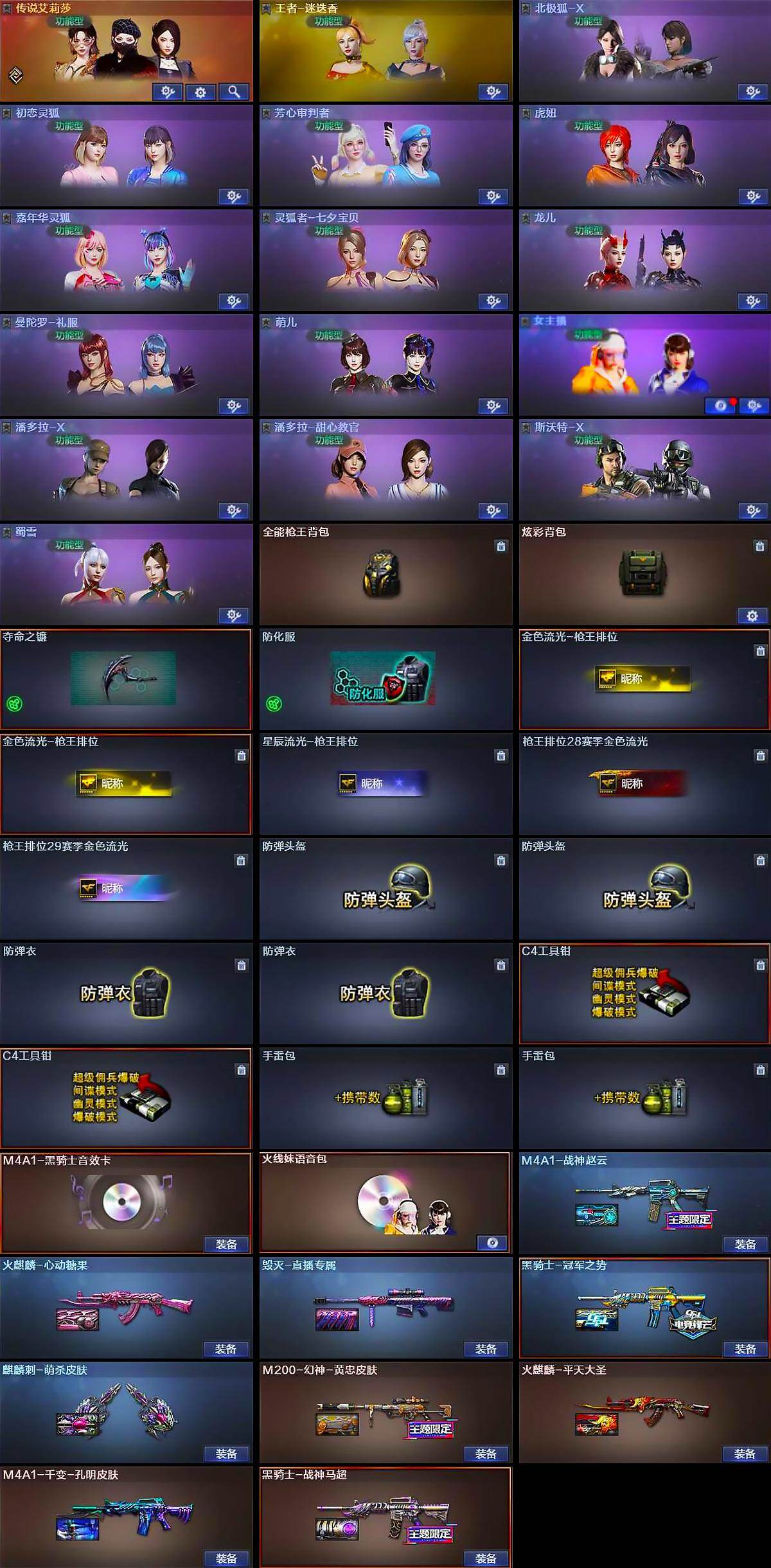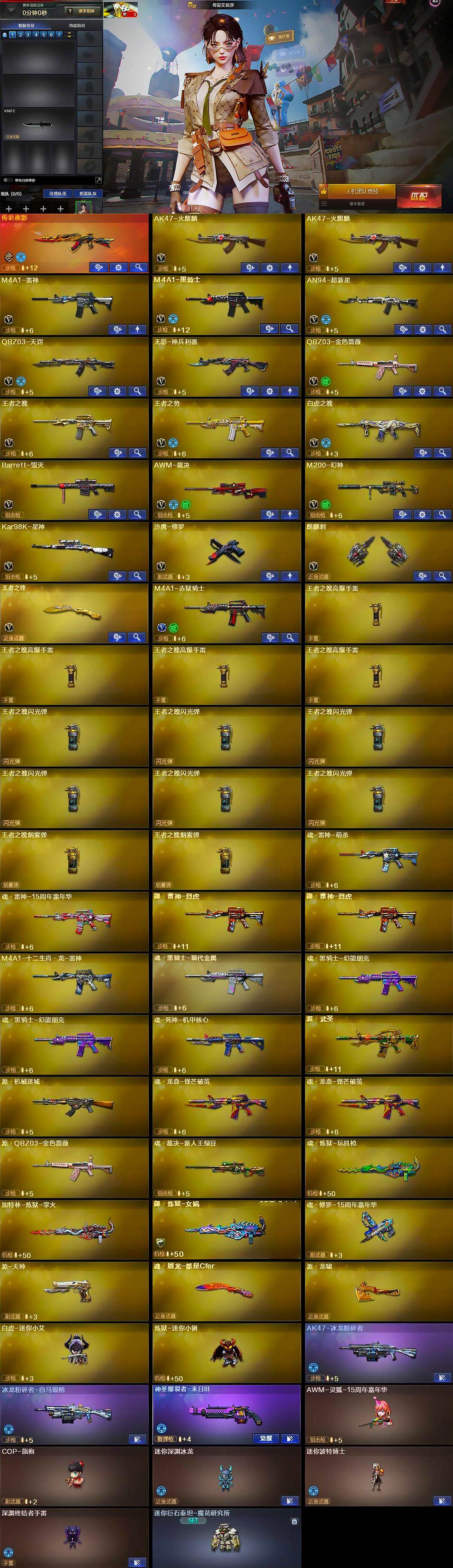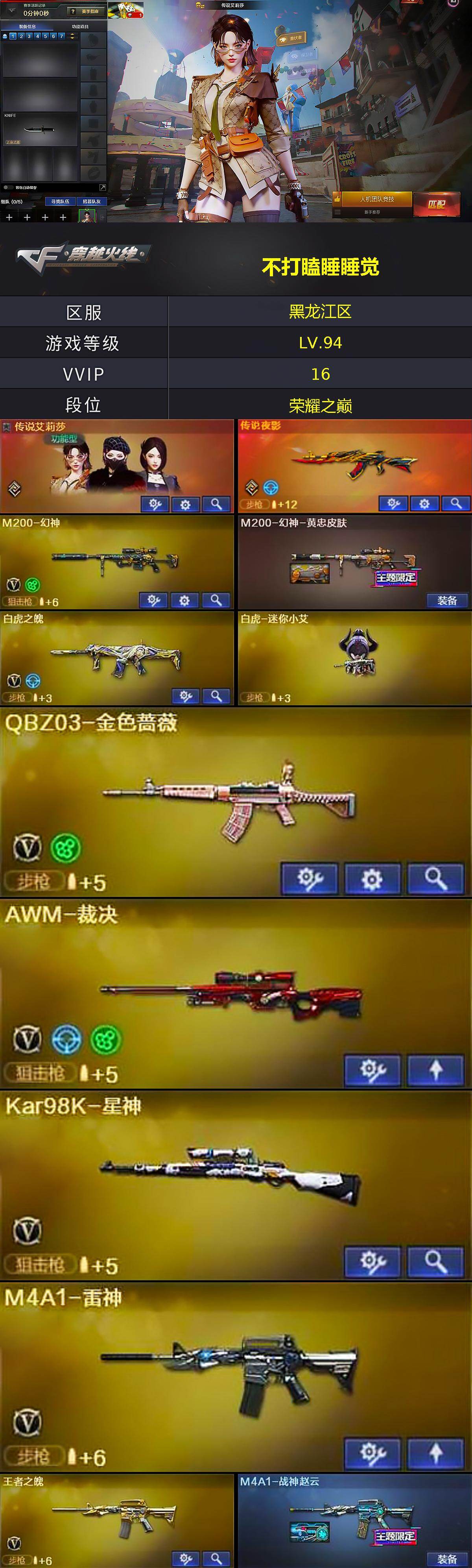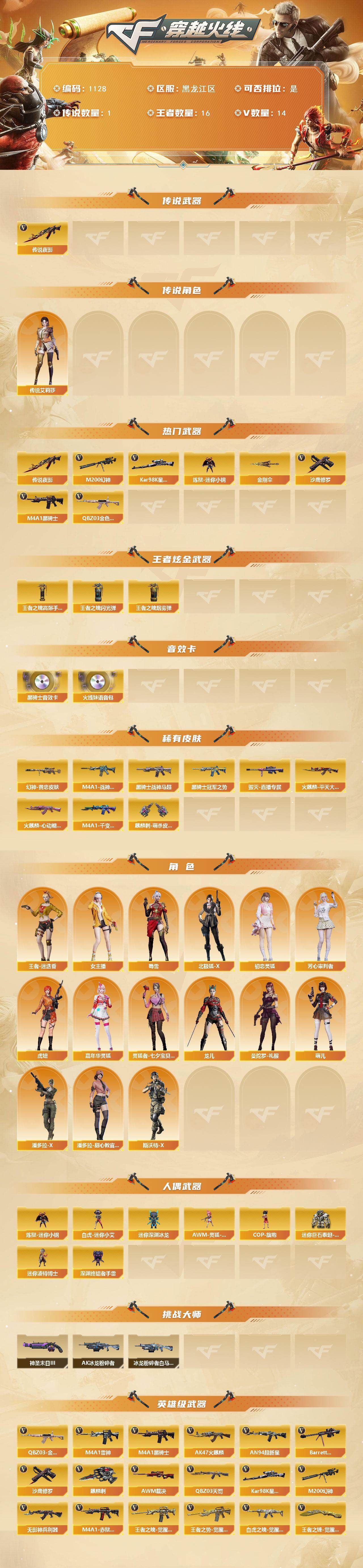 黑龙江区-14v-16王者-0炫金 【传说武器】:传说夜影 【传说角色】:传说艾莉莎 【热门武器】:传说夜影,q03-金色蔷薇,m200-幻神,kar98k-星神,炼狱-迷你小钢,m4a1-黑骑士,沙鹰-修罗,金刚伞 【王者炫金武器】:王者之魄高爆手蕾4,王者之魄闪光丹6,王者之魄盐雾蛋2 【音效卡】:m4a1-黑骑士音效卡,火线妹语音包 【皮肤】:m200-幻神-黄忠皮肤,m4a1