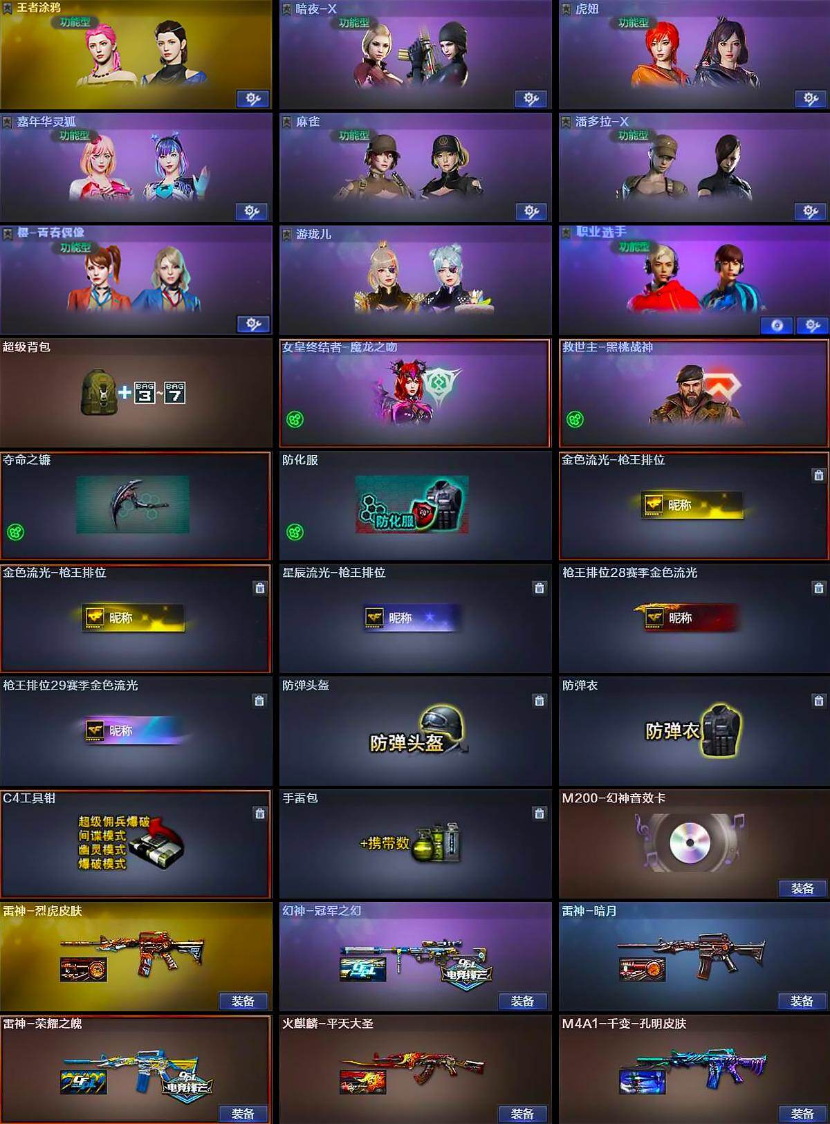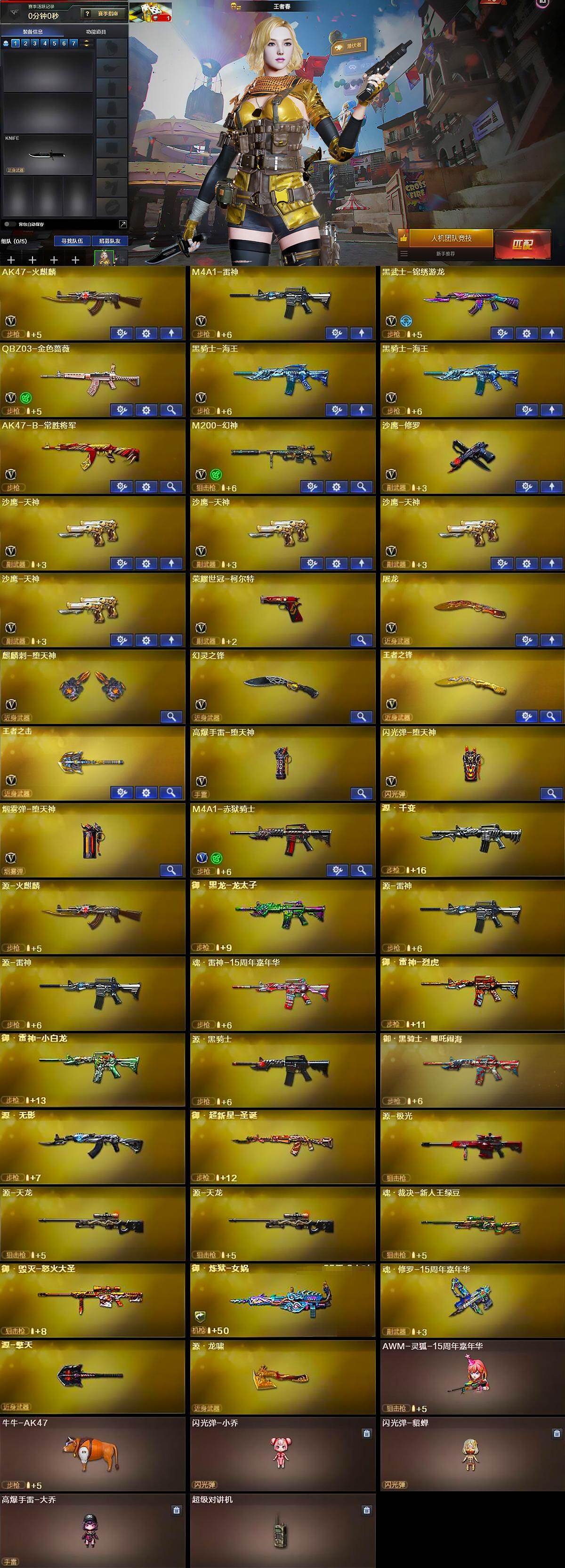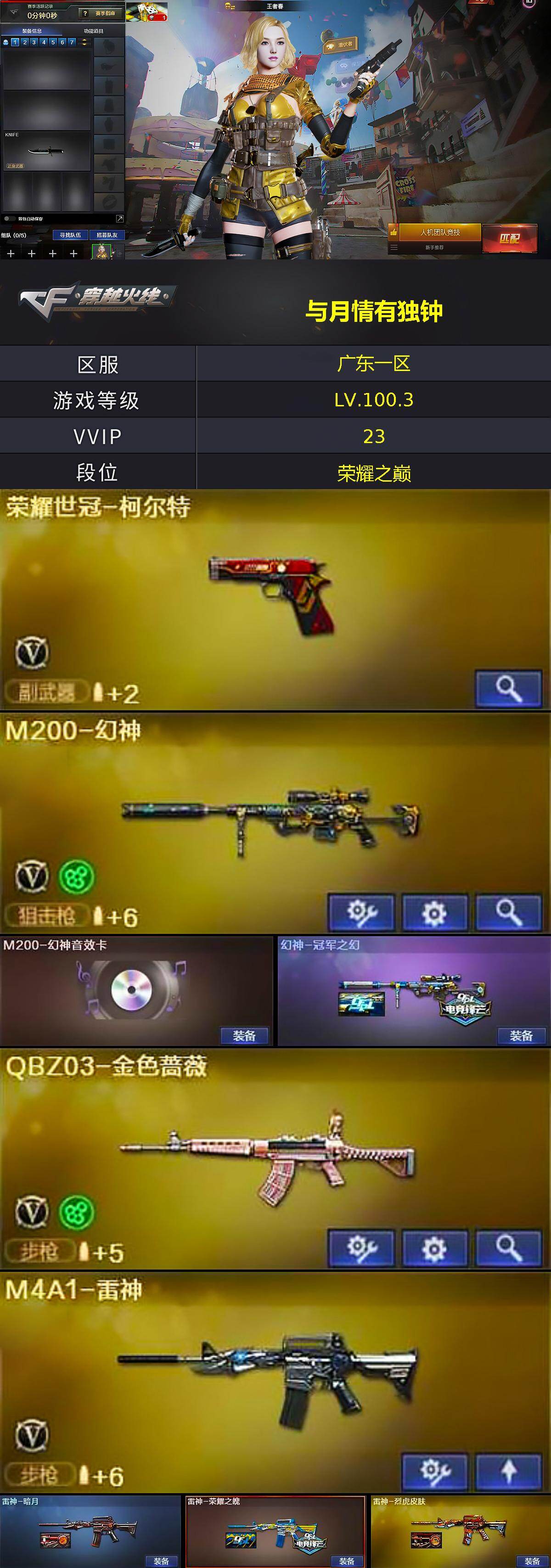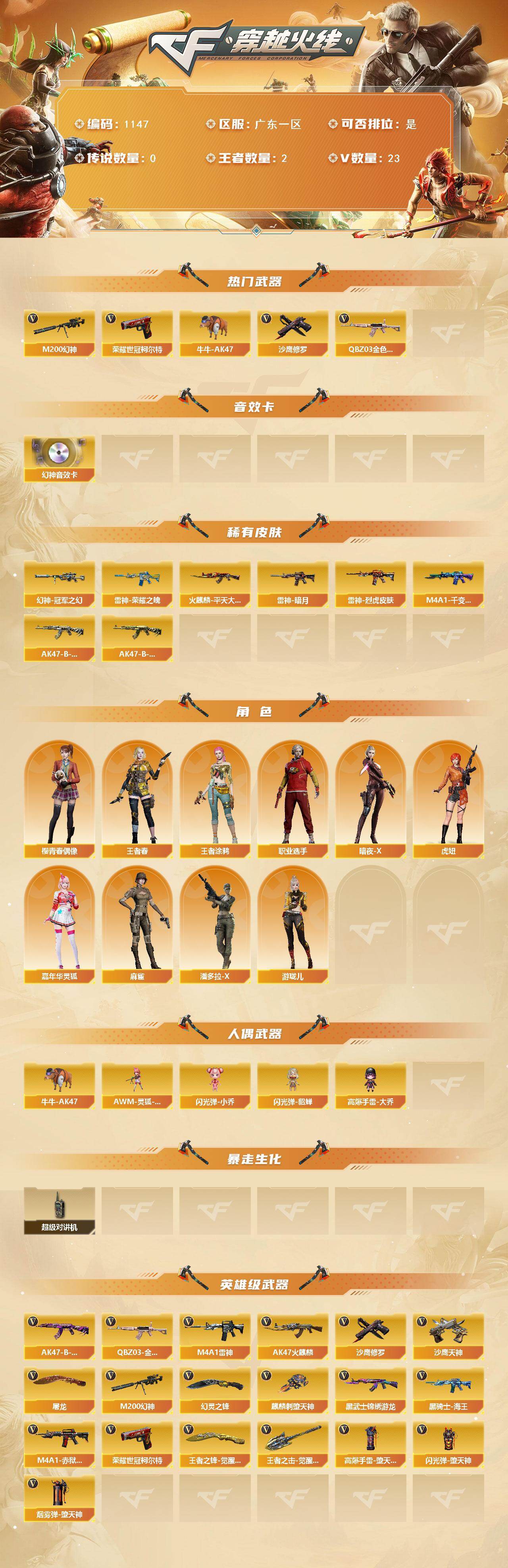广东一区-23v-2王者-0炫金 【热门武器】:q03-金色蔷薇,m200-幻神,荣耀世冠-柯尔特,牛牛-ak47,沙鹰-修罗 【音效卡】:m200-幻神音效卡 【皮肤】:幻神-冠军之幻,雷神-暗月,雷神-荣耀之魄,雷神-烈虎皮肤,火麒麟-平天大圣,m4a1-千变-孔明皮肤,ak47-b-常胜将军-刘备,ak47-b-常胜将军-孙权 【角色】:王者春,王者涂鸦,暗夜-x,虎妞,嘉年华灵狐,