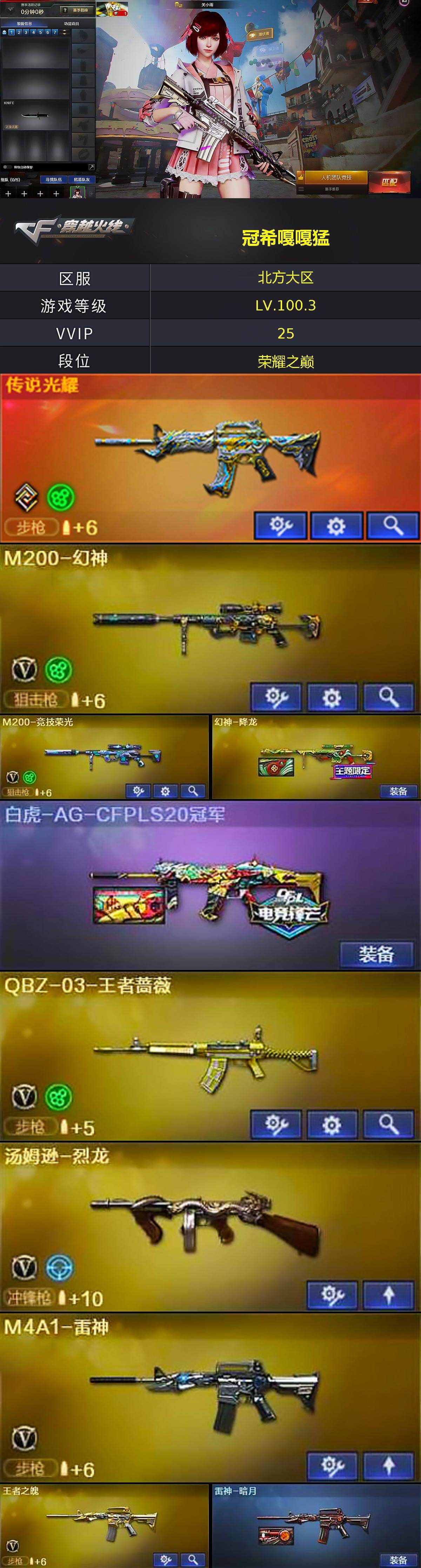 北方大区-24v-2王者-0炫金 【传说武器】:传说光耀 【热门武器】:传说光耀,m200-幻神,m200-竞技荣光,死亡之眼,m4a1-黑骑士,汤姆逊-烈龙,羊驼玩偶,沙鹰-修罗 【皮肤】:幻神-降龙,白虎-ag-cfpls20冠军,雷神-暗月,火麒麟-平天大圣,毁灭耀金皮肤,黑骑士-暗月,黑骑士耀金皮肤,无影-能量核心,天启-暗月,修罗-能量核心,天神-暗月 【角色】:关小雨,狐影,暗夜-