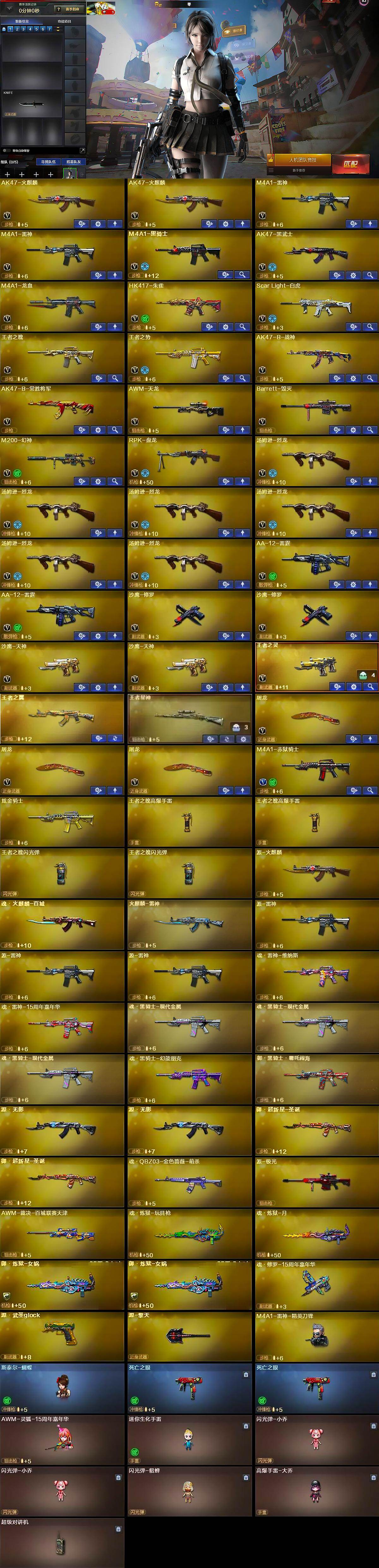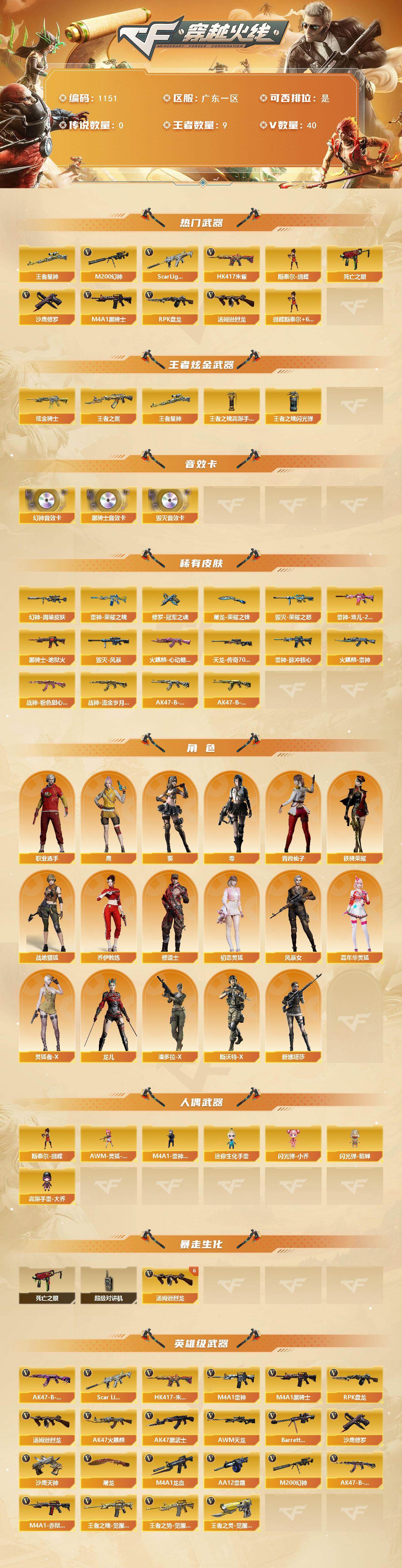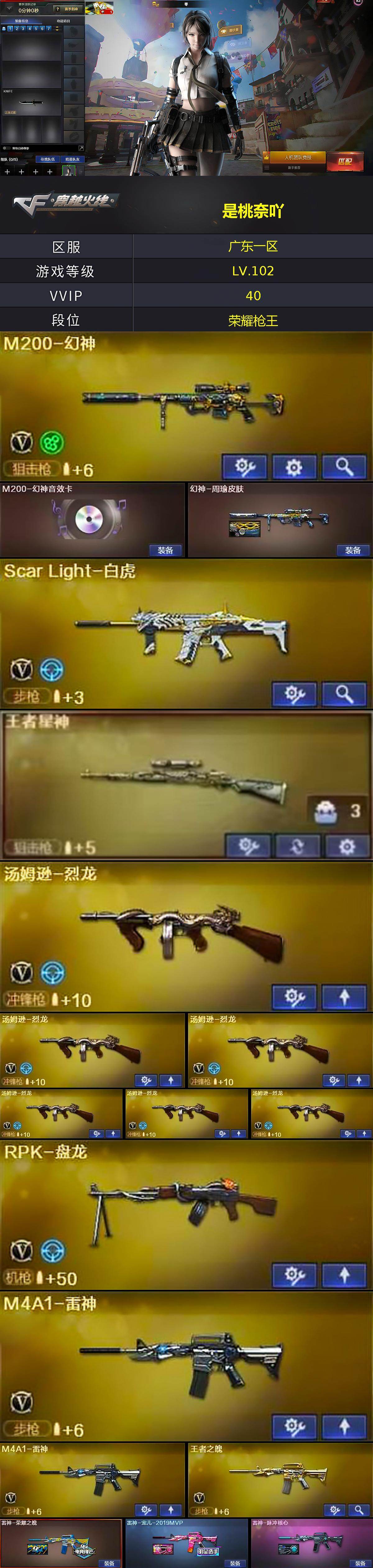 广东一区-40v-9王者-1炫金 【热门武器】:王者星神,scar light-白虎,hk417-朱雀,m200-幻神,死亡之眼2,m4a1-黑骑士,汤姆逊-烈龙6,rpk-盘龙,斯泰尔-蝴蝶,沙鹰-修罗2 【王者炫金武器】:王者之翼,王者星神,炫金骑士,王者之魄高爆手蕾2,王者之魄闪光丹2 【音效卡】:m200-幻神音效卡,m4a1-黑骑士音效卡,barrett-毁灭音效卡 【皮肤