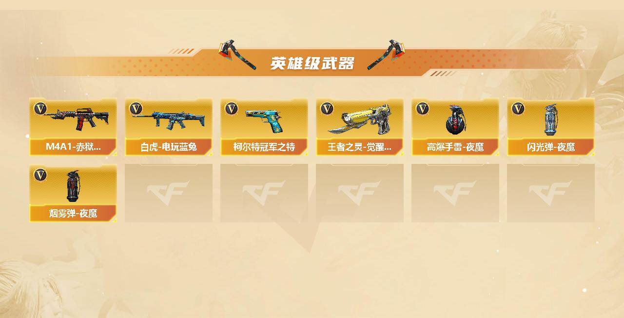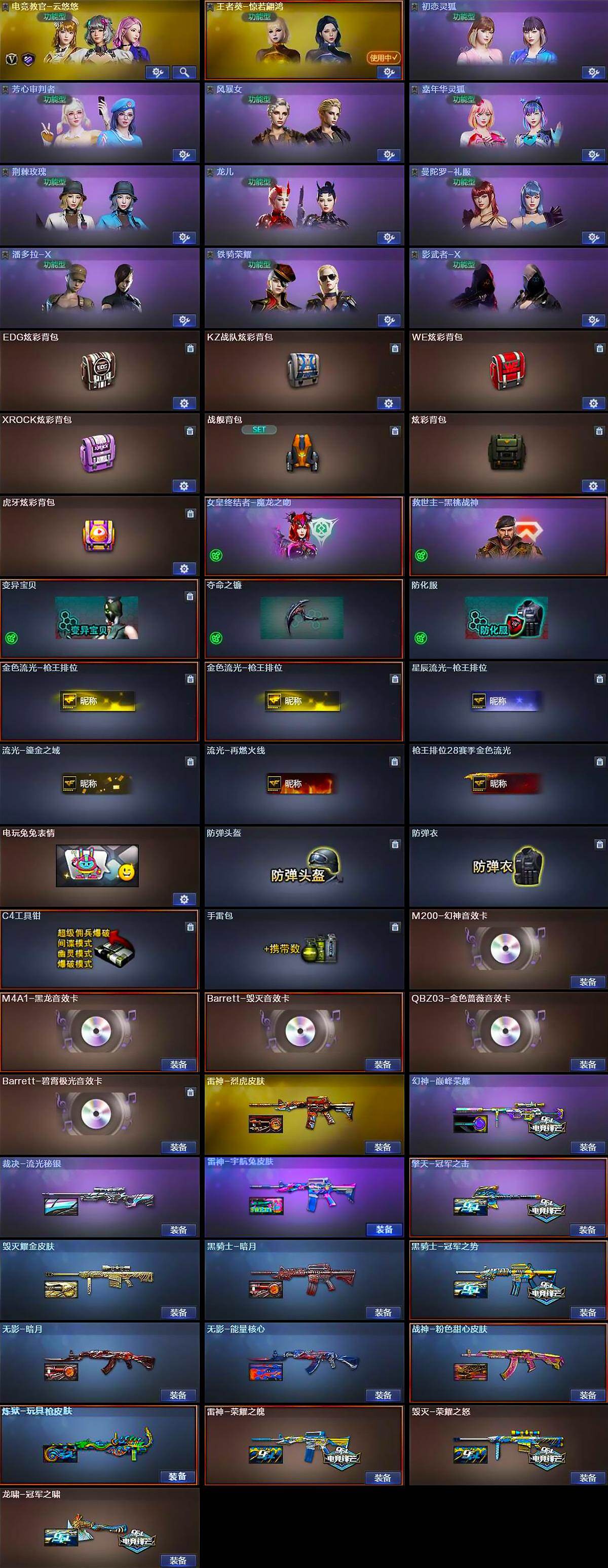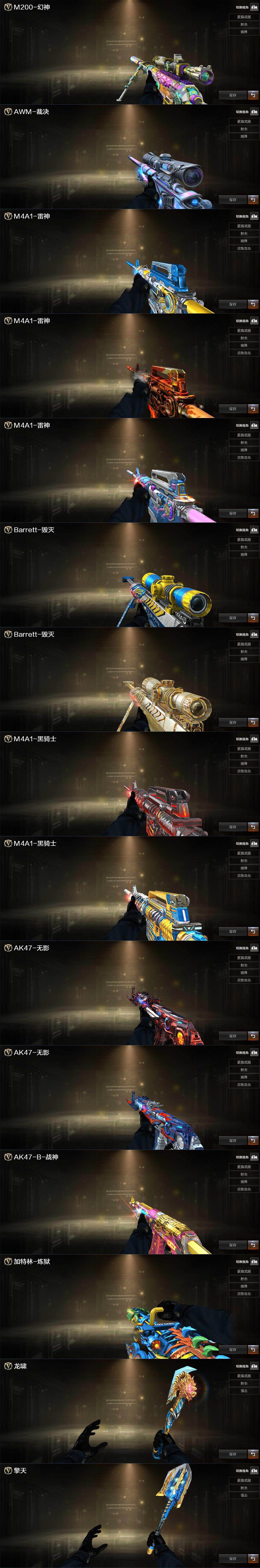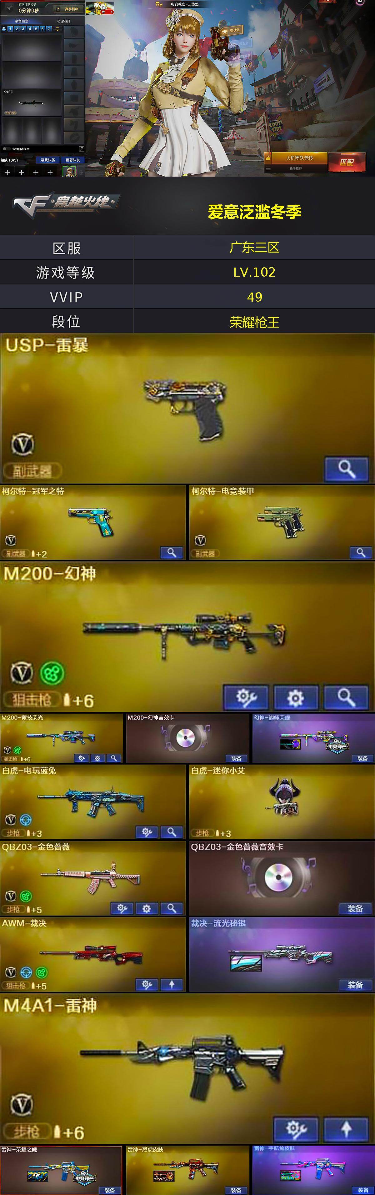 广东三区-49v-2王者-0炫金 【热门武器】:q03-金色蔷薇,m200-幻神,m200-竞技荣光,死亡之眼,白虎-电玩蓝兔,柯尔特-冠军之特,m4a1-黑骑士,加特林-炼狱,usp-雷暴,沙鹰-修罗3 【音效卡】:m200-幻神音效卡,m4a1-黑龙音效卡,barrett-毁灭音效卡,barrett-碧霄极光音效卡 【皮肤】:幻神-巅峰荣耀,裁决-流光秘银,雷神-荣耀之魄,雷神-烈虎