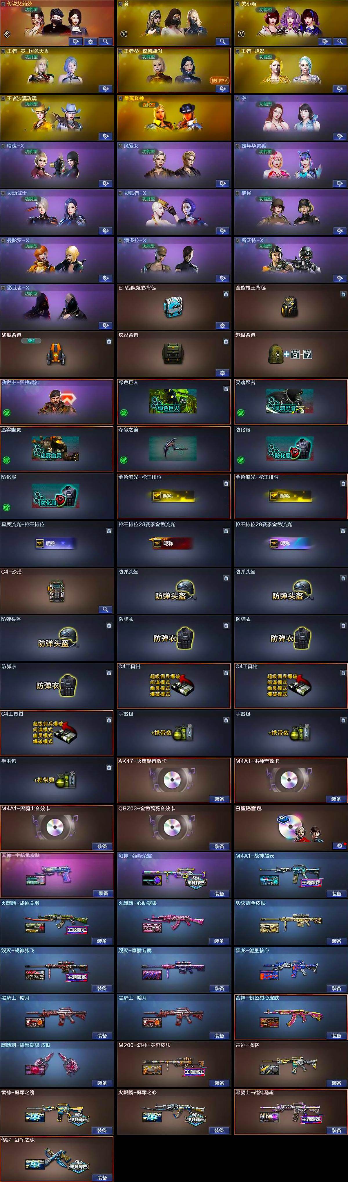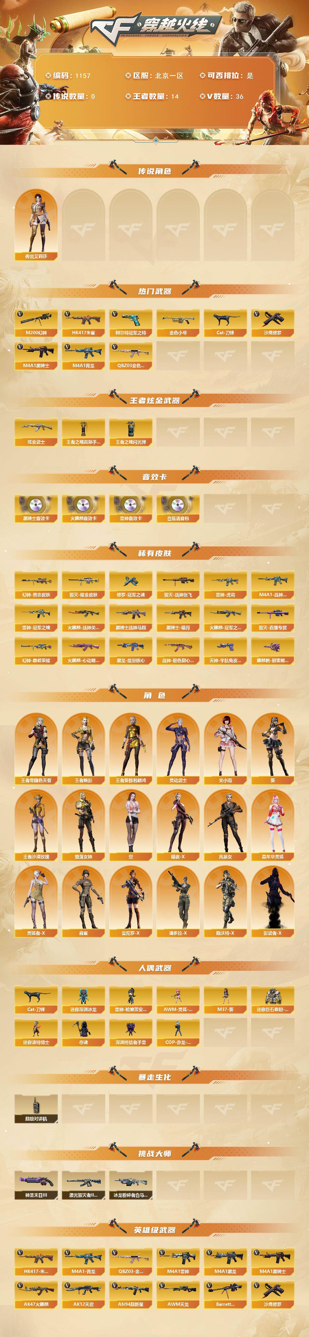 北京一区-36v-14王者-1炫金 【传说角色】:传说艾莉莎 【热门武器】:q03-金色蔷薇,hk417-朱雀,m4a1-青龙,m200-幻神,柯尔特-冠军之特,金色小号,cat-刀锋,m4a1-黑骑士,沙鹰-修罗 【王者炫金武器】:炫金武士,王者之魄高爆手蕾4,王者之魄闪光丹3 【音效卡】:ak47-火麒麟音效卡,m4a1-雷神音效卡,m4a1-黑骑士音效卡,白鲨语音包 【皮肤】:m