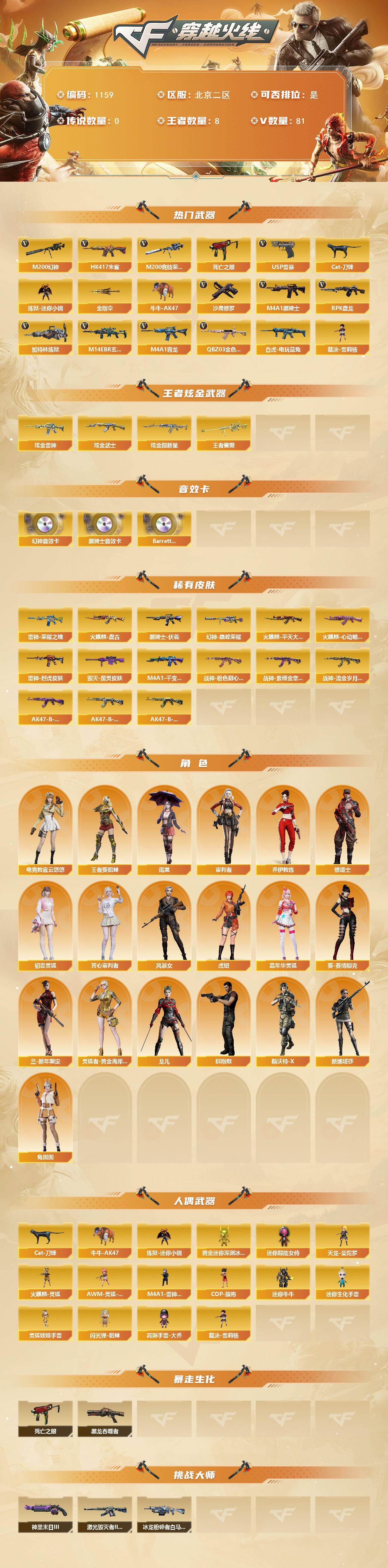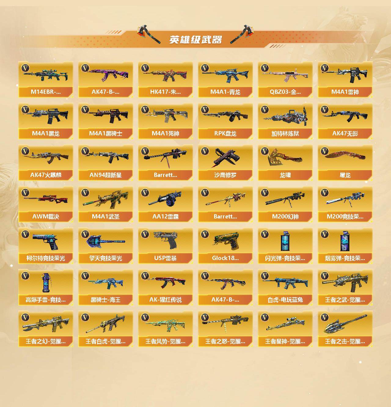 北京二区-81v-8王者-4炫金 【热门武器】:q03-金色蔷薇,m14ebr-玄武,hk417-朱雀,m4a1-青龙,m200-幻神,m200-竞技荣光,死亡之眼,白虎-电玩蓝兔,cat-刀锋,炼狱-迷你小钢,牛牛-ak47,m4a1-黑骑士,rpk-盘龙,加特林-炼狱,裁决-雪莉杨,usp-雷暴,沙鹰-修罗,金刚伞 【王者炫金武器】:王者蔷薇,炫金雷神,炫金武士2,炫金超新星 【音效
