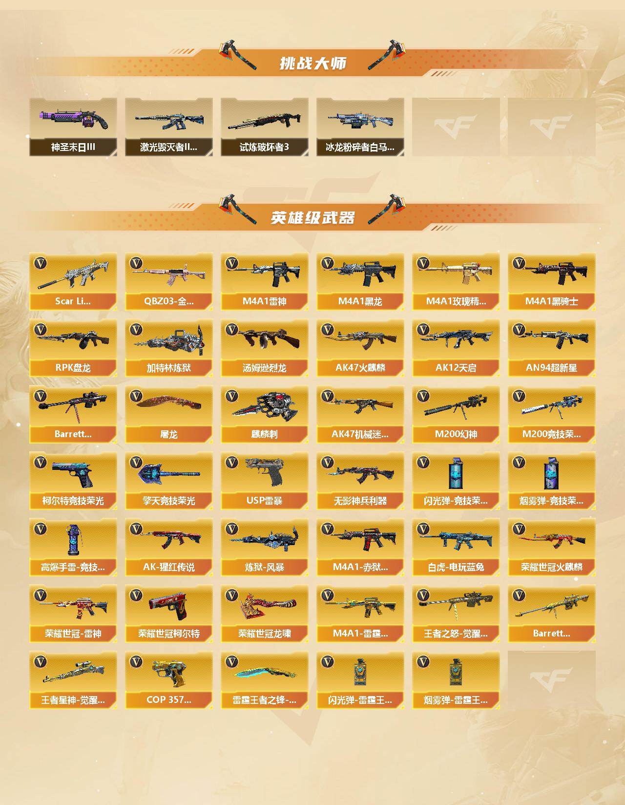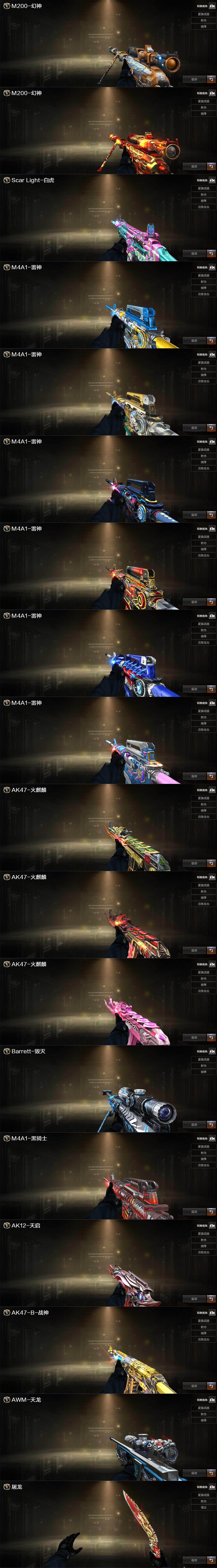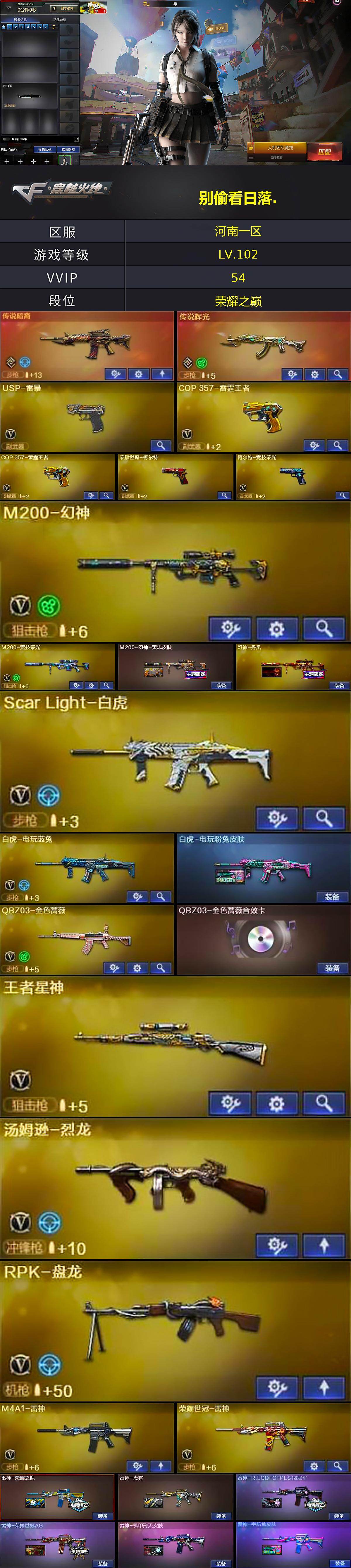 河南一区-52v-16王者-0炫金 【传说武器】:传说暗裔,传说辉光 【热门武器】:传说暗裔,传说辉光,q03-金色蔷薇,scar light-白虎,m200-幻神,m200-竞技荣光,荣耀世冠-火麒麟,荣耀世冠-雷神,白虎-电玩蓝兔,荣耀世冠-柯尔特,m4a1-黑骑士,汤姆逊-烈龙,rpk-盘龙,加特林-炼狱,usp-雷暴,荣耀世冠-龙啸 【王者炫金武器】:王者青龙,王者凤吟 【音效卡】