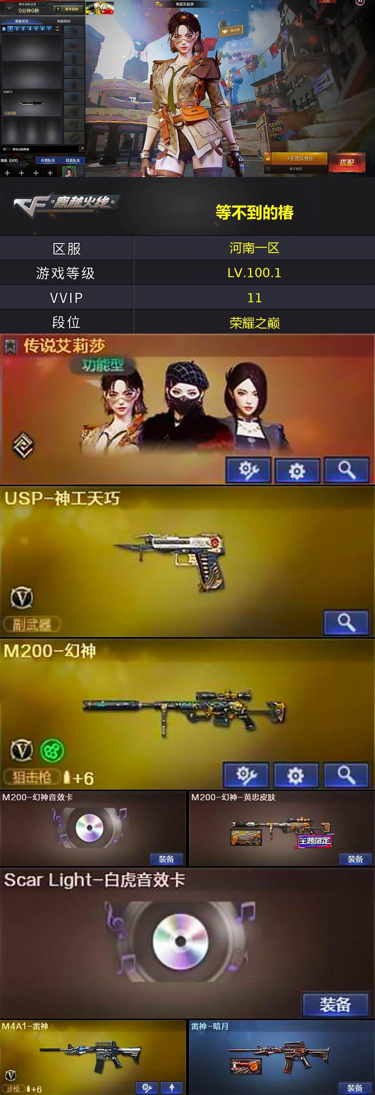 河南一区-8v-0王者-0炫金 【传说角色】:传说艾莉莎 【热门武器】:m200-幻神 【音效卡】:m200-幻神音效卡,scar light-白虎音效卡 【皮肤】:m200-幻神-黄忠皮肤,雷神-暗月,火麒麟-百城,火麒麟-心动糖果 【角色】:风暴女,虎妞,嘉年华灵狐,娟娟,灵狐-花神,龙儿,麻雀,曼陀罗-x,曼陀罗-礼服,潘多拉-x,斯沃特-x,雪莉杨-摸金校尉 【人偶武器】:awm-灵狐