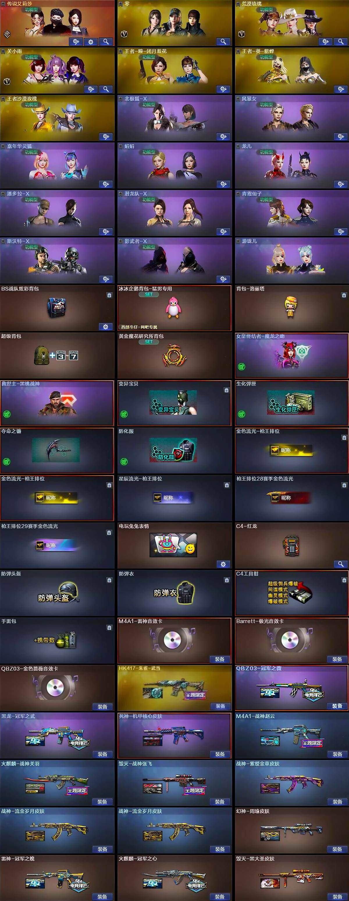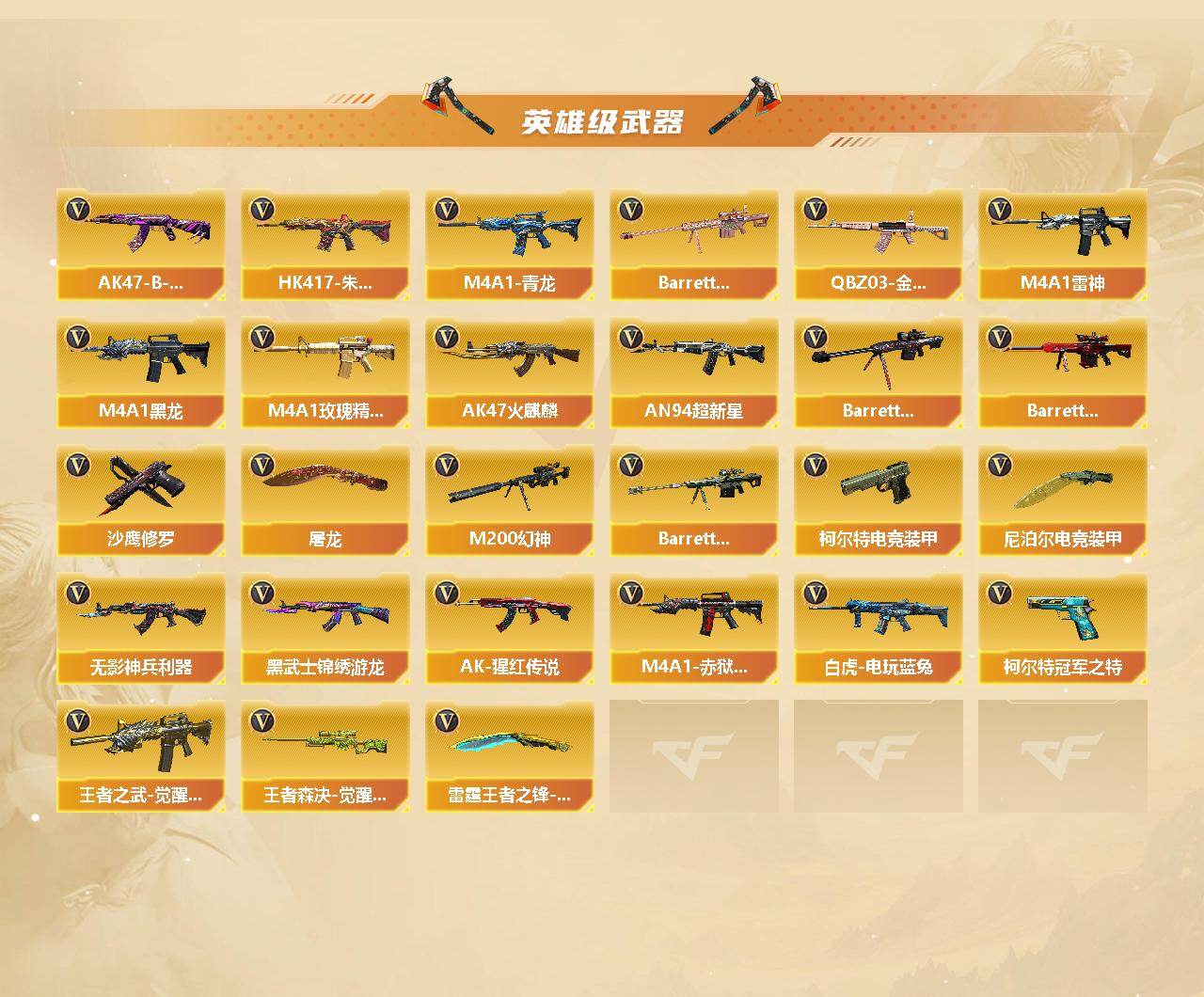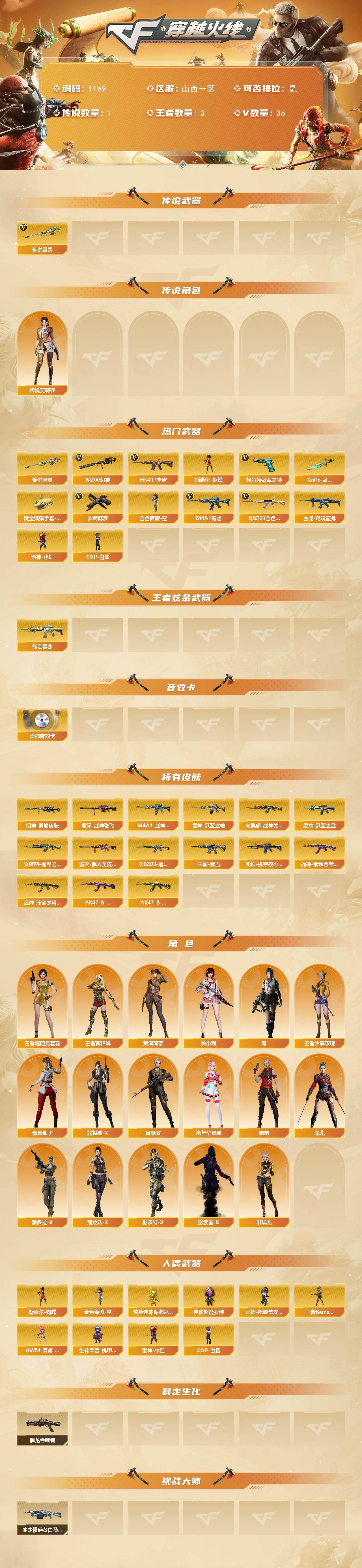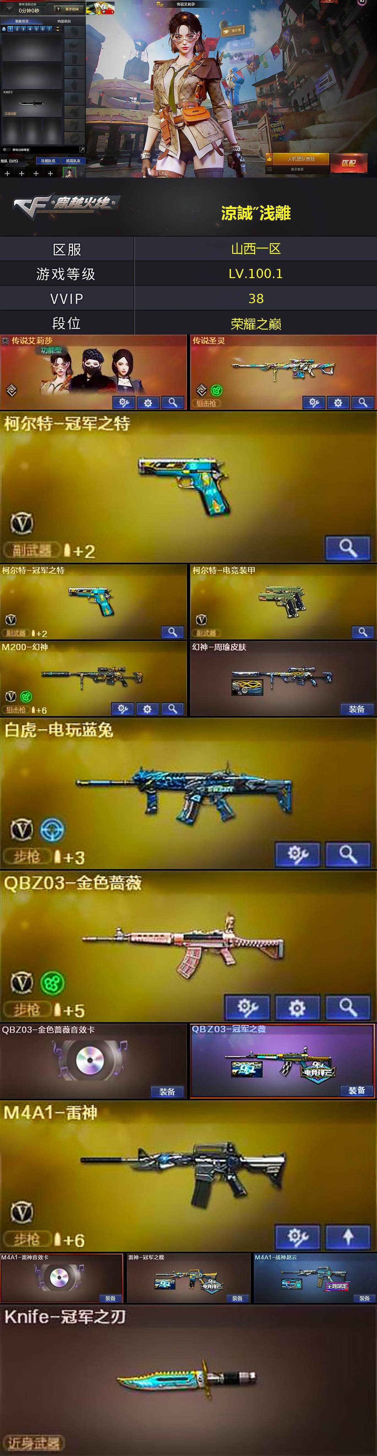 山西一区-36v-3王者-1炫金 【传说武器】:传说圣灵 【传说角色】:传说艾莉莎 【热门武器】:传说圣灵,q03-金色蔷薇,hk417-朱雀,m4a1-青龙,m200-幻神,白虎-电玩蓝兔,柯尔特-冠军之特2,金色蔷薇-空,斯泰尔-蝴蝶,雷神-小红,cop-白鲨,沙鹰-修罗3,knife-冠军之刃,黄金猫猫手套-白鲨 【王者炫金武器】:炫金黑龙 【音效卡】:m4a1-雷神音效卡 【皮