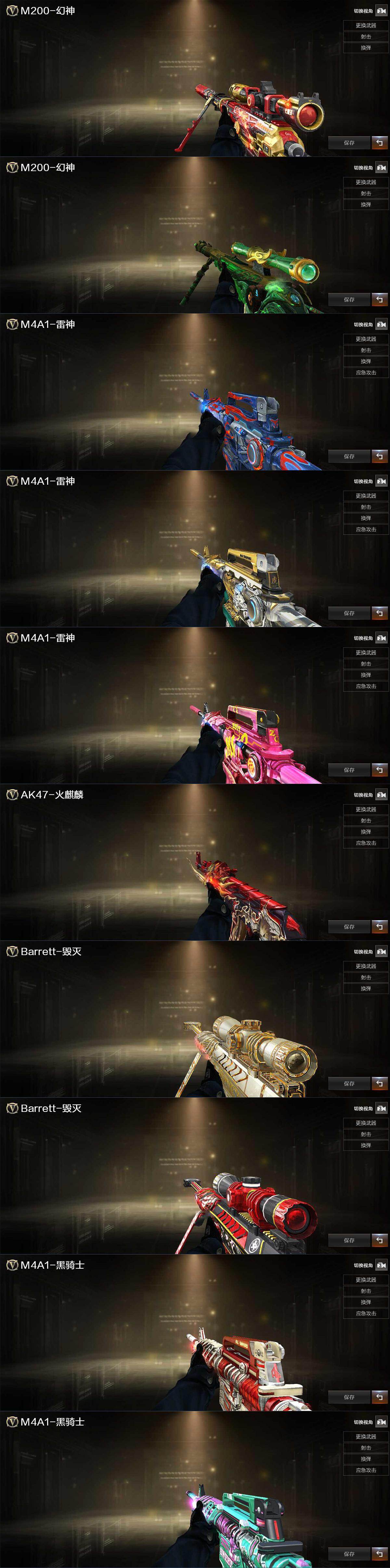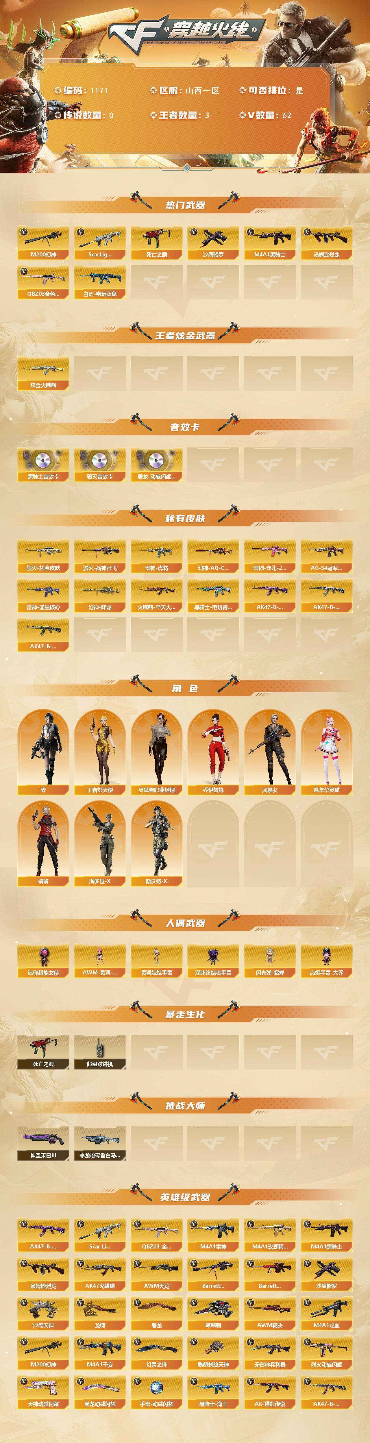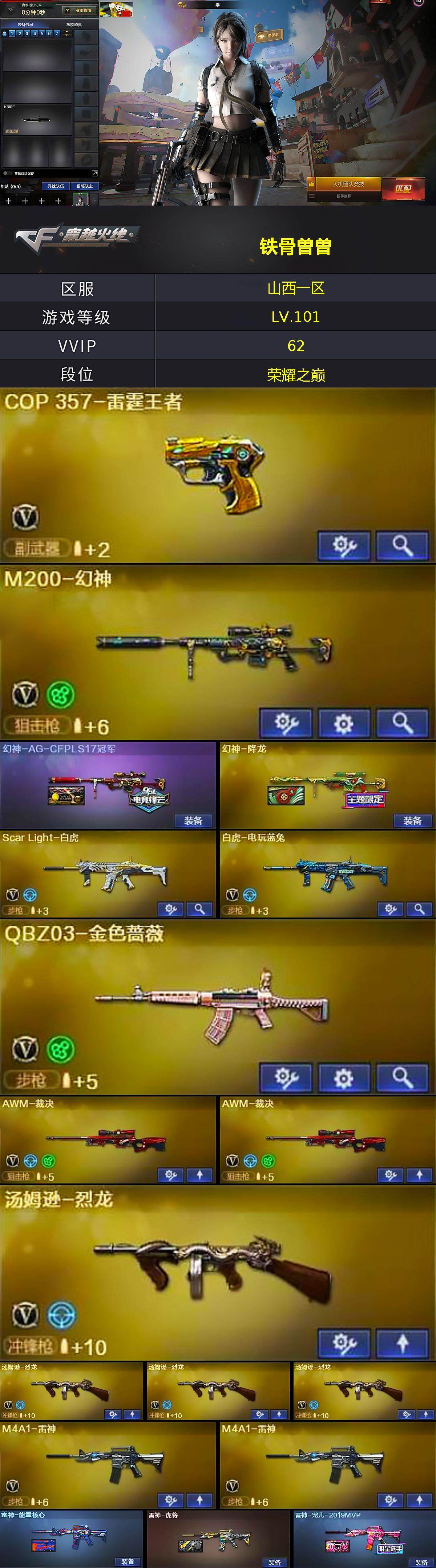山西一区-62v-3王者-1炫金 【热门武器】:q03-金色蔷薇,scar light-白虎,m200-幻神,死亡之眼4,白虎-电玩蓝兔,m4a1-黑骑士,汤姆逊-烈龙4,沙鹰-修罗3 【王者炫金武器】:炫金火麒麟 【音效卡】:屠龙-动感闪耀 音效卡,m4a1-黑骑士音效卡,barrett-毁灭音效卡 【皮肤】:幻神-ag-cfpls17冠军,幻神-降龙,雷神-能量核心,雷神-虎将,