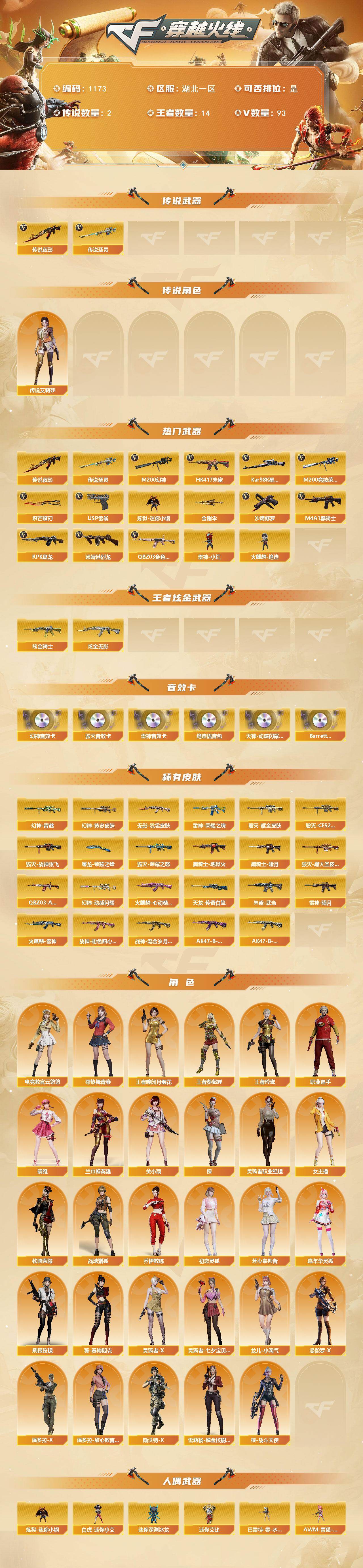 湖北一区-93v-14王者-2炫金 【传说武器】:传说夜影,传说圣灵 【传说角色】:传说艾莉莎 【热门武器】:传说圣灵,传说夜影,q03-金色蔷薇,hk417-朱雀,m200-幻神,m200-竞技荣光,kar98k-星神,炼狱-迷你小钢,m4a1-黑骑士,汤姆逊-烈龙6,rpk-盘龙6,雷神-小红,火麒麟-绝迹,usp-雷暴,沙鹰-修罗2,炽芒蝶刃,金刚伞 【王者炫金武器】:炫金骑士