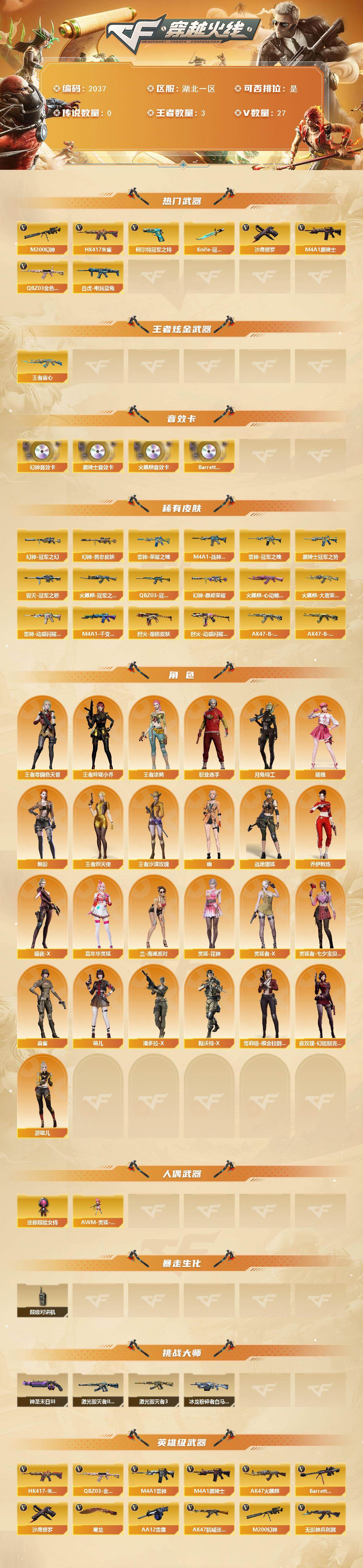 【2037】特28154可排位-可二次【湖北一区/27v/vip1】【纯白无封号/幻神三件套3皮肤/2把冠军之特2把冠军小刀/5四防角色/q三件套/火麒麟三件套/黑骑士三件套】【m200-幻神/m200-幻神音效卡/幻神-巅峰荣耀/幻神-冠军之幻/m200-幻神-黄忠皮肤】【knife-冠军之刃2】【柯尔特-冠军之特2】【q03-金色蔷薇/q03-金色蔷薇音效卡/q03-冠军之薇】【王者之决/王者之锋】【m4a1-雷神/雷神-荣耀之魄/雷神-冠军之魄/m4a1-战神赵云】【barrett-毁灭/毁灭-冠军之怒】【ak47-火麒麟2/ak47-火麒麟音效卡/火麒麟-冠军之心/火麒麟-cfstar/火麒麟-大唐荣光/火麒麟-心动糖果】【m4a1-黑骑士/m4a1-黑骑士音效卡/黑骑士-冠军之势】【hk417-朱雀】【烈火-动感闪耀 皮肤】【无影-神兵利器】【黑武士-锦绣游龙】【天龙-cfstar】【m4a1-千变-孔明皮肤】【沙鹰-修罗/修罗-cfstar】【天神-动感闪耀】【擎天-惨叫迹】【屠龙/屠龙-动感闪耀】【王者沙漠玫瑰/职业选手/王者涂鸦/晴雅/王者炽天使/王者涂鸦/王者玲珑-小乔/王者-零-国色天香/魅影/暗夜-x/兰-海滩派对/月兔特工/幽/木兰/乔伊教练/灵狐-花神/萌儿/麻雀/妲己/潘多拉-x/斯沃特-x/救世主-x/堕天使】【白虎-电玩蓝兔】【aa-12-雷霆/ak47-机械迷城】【barrett-暗月传说】【colt1911-小故障/colt 1911-大黄蜂2/新usp-呛王排位奖励4】【神圣爆裂者-末日iii/激光毁灭者iii-白马银呛/激光毁灭者iii/冰龙粉碎者-白马银呛】【运动护目镜/超级对讲机/防弹头盔/防弹衣/c4工具钳/手蕾包/防化服】截图展示段位不代表实际段位,如赛季更新等不/拒因素发生变化、时限道具不保证所剩时间
