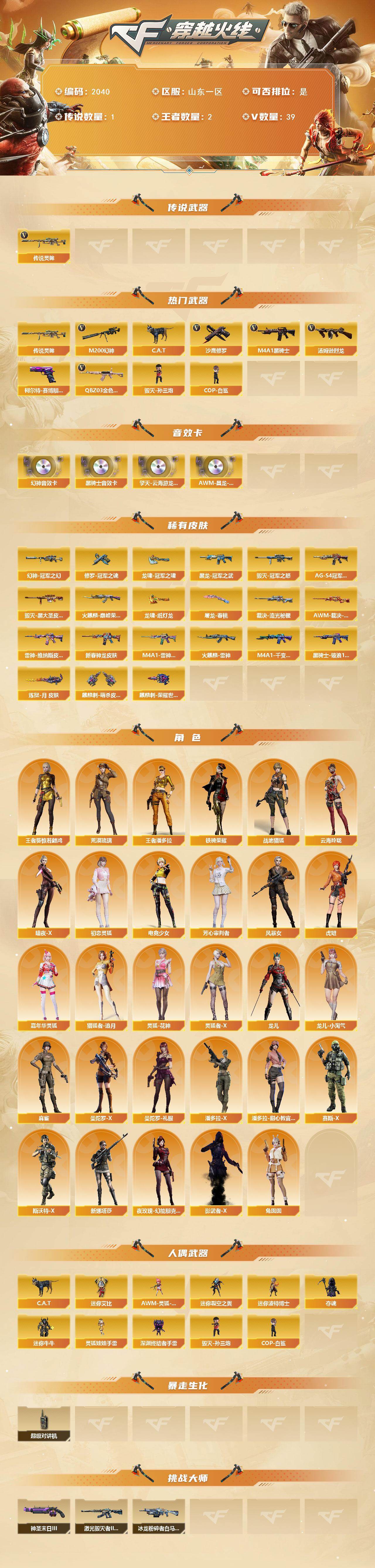 【2040】特31896可排位-可二次【山东一区/38v/vip6/1传说】【纯白无封号/传说灵眸/幻神三件套/裁决带3皮肤/6修罗/5烈龙/3四防角色/黑骑士三件套】【m200-幻神/m200-幻神音效卡/幻神-冠军之幻】【awm-裁决/裁决-流光秘银/凤灵皮肤/百城皮肤】【柯尔特-赛博朋克】【q03-金色蔷薇】【m4a1-雷神/m4a1-雷神-巅峰荣耀皮肤/雷神-维纳斯皮肤】【barrett-毁灭/毁灭-冠军之怒】【ak47-火麒麟/火麒麟-巅峰荣耀/火麒麟-cfstar2/火麒麟-雷神】【m4a1-黑骑士/m4a1-黑骑士音效卡/黑骑士-ag-s4冠军典藏】【荒漠琉璃】【m4a1-黑龙/黑龙-冠军之武】【天龙-cfstar】【m4a1-死神/m4a1-千变-孔明皮肤】【汤姆逊-烈龙4/烈龙-云海游龙】【炼狱-月 皮肤】【沙鹰-修罗6/修罗-cfstar2/修罗-冠军之魂】【麒麟刺/麒麟刺-荣耀世冠白鲨/麒麟刺-萌杀皮肤】【擎天-云海游龙音效卡/擎天-云海游龙】【屠龙2/屠龙-春桃 皮肤】【龙啸2/龙啸-冠军之啸/龙啸-纸灯龙皮肤/龙啸-烈火龙威】【王者潘多拉/王者葵-惊若翩鸿/龙儿/龙儿-小淘气/暗夜-x/木兰/云海玲珑/兔囡囡/灵狐-花神/麻雀/紫霞/潘多拉-x/斯沃特-x/影武者-x/铁骑荣耀/新娜塔莎/幻影/堕天使/复仇者】【m4a1-龙血】【aa-12-雷霆】【an94-超新星】【colt1911-小故障/usp-邪皇龙甲兽/colt 1911-大黄蜂3/cop 357-青龙/新usp-呛王排位奖励6】【神圣爆裂者-末日iii/激光毁灭者iii-白马银呛2/冰龙粉碎者-白马银呛】【斯泰尔-巧克力】【c.a.t/cop-白鲨/毁灭-孙三炮/迷你裂空之翼2/夺魂】【王者之心】【手蕾-云海游龙】【高爆手蕾-雷霆王者】【高爆手蕾-幻灵/闪光丹-幻灵/盐雾蛋-幻灵2】【语音特效-云海游龙/语音特效-机器人】【超级护目镜/烟雾保护头盔/闪光护目镜/超级对讲机/超级背包/防弹头盔3/防弹衣3/c4工具钳3/手蕾包3/防化服2】截图展示段位不代表实际段位,如赛季更新等不/拒因素发生变化、时限道具不保证所剩时间