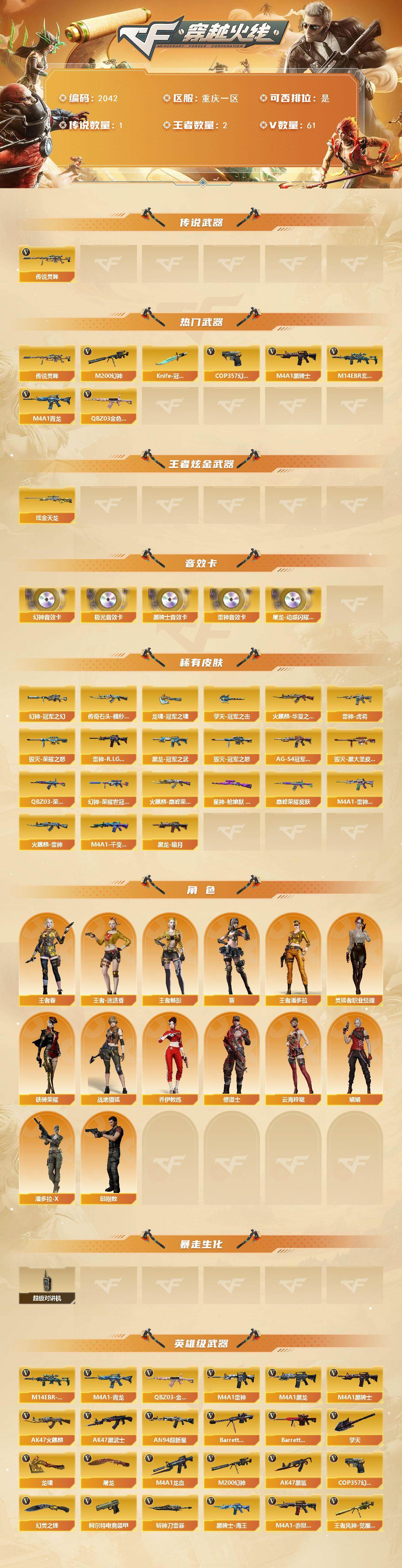 【2042】特31819可排位-可二次【重庆一区/60v/vip1/1传说】【纯白无封号/传说灵眸/幻神三件套/2把幻神2皮肤/2cop柯尔特2把冠军小刀/10套雷/4个四防角色】【m200-幻神2/m200-幻神音效卡/幻神-冠军之幻/m200-幻神-荣耀世冠白鲨】【星神-呛娘默 皮肤】【王者风神】【knife-冠军之刃2】【q03-金色蔷薇/q03-荣耀世冠白鲨/q03-巅峰荣耀皮肤】【m4a1-雷神/m4a1-雷神音效卡/m4a1-雷神-巅峰荣耀皮肤/雷神-r.lgd-cfpls18冠军/雷神-虎将】【柯尔特-电竞装甲/cop 357-幻灵2】【barrett-毁灭/毁灭-荣耀之怒/毁灭-冠军之怒】【ak47-火麒麟/火麒麟-巅峰荣耀/火麒麟-cfstar/火麒麟-华夏之心/火麒麟-雷神】【m4a1-黑骑士/m4a1-黑骑士音效卡/黑骑士-海王/黑骑士-ag-s4冠军典藏】【m4a1-黑龙/黑龙-冠军之武】【ak47-黑武士】【barrett-极光/barrett-极光音效卡】【m4a1-千变-孔明皮肤】【炼狱-悦蓝】【擎天/擎天-冠军之击】【屠龙3/屠龙-动感闪耀 音效卡】【龙啸2/龙啸-冠军之啸/龙啸-烈火龙威】【王者春/王者潘多拉/王者-魅影/王者-迷迭香/云海玲珑/乔伊教练/修道士/妲己/娟娟/潘多拉-x/铁骑荣耀/幻影】【m14ebr-玄武/m4a1-青龙/m4a1-龙血】【ak47-黑鲨】【an94-超新星】【colt1911-小故障/colt 1911-大黄蜂4/新usp-呛王排位奖励2】【斩神刀】【斯泰尔-巧克力/轻型军用手斧-镜】【高爆手蕾-雷暴/闪光丹-雷暴/盐雾蛋-雷暴】【高爆手蕾-幻灵8/闪光丹-幻灵7/盐雾蛋-幻灵8】【闪光丹-电竞装甲/盐雾蛋-电竞装甲】【炫金天龙】【语音特效-云海游龙/语音特效-机器人】【烟雾保护头盔/闪光护目镜/超级对讲机/炫彩背包/防弹头盔5/防弹衣5/c4工具钳3/手蕾包3/防化服】截图展示段位不代表实际段位,如赛季更新等不/拒因素发生变化、时限道具不保证所剩时间