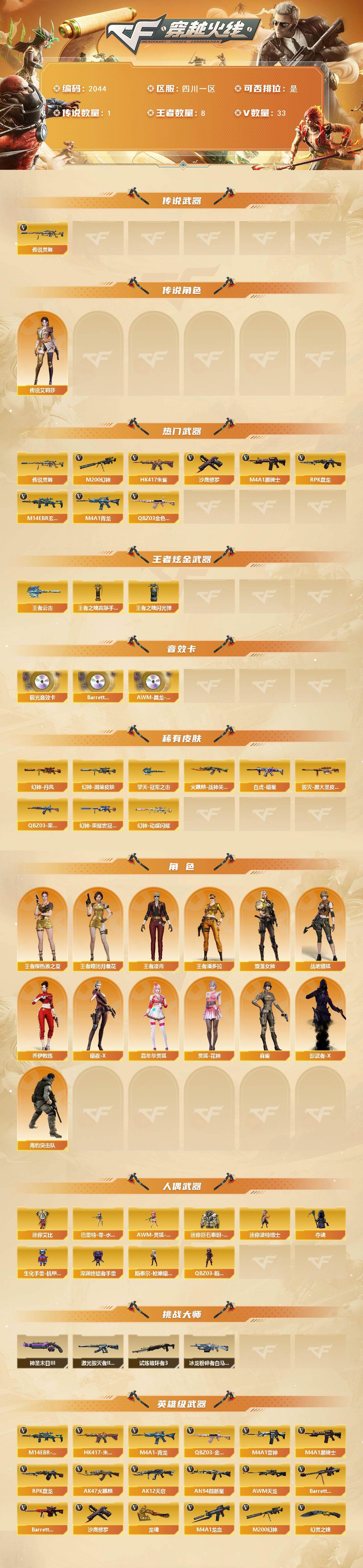 【2044】特18247可排位-可二次【四川一区/31v/vip1/2传说】【纯白无封号/传说艾莉莎/传说灵眸/幻神三件套/2把幻神4皮肤】【m200-幻神2/m200-幻神-荣耀世冠白鲨/幻神-周瑜皮肤/幻神-丹凤/幻神-动感闪耀 皮肤】【白虎之魄/王者白虎/王者风神】【scar light-白虎-暗星】【q03-金色蔷薇/q03-荣耀世冠白鲨】【m4a1-雷神】【barrett-毁灭】【ak47-火麒麟/火麒麟-cfstar/火麒麟-战神关羽】【m4a1-黑骑士】【hk417-朱雀】【无影-神兵利器】【awm-天龙】【barrett-极光/barrett-极光音效卡】【rpk-盘龙】【炼狱-悦蓝】【沙鹰-修罗/修罗-cfstar】【天神-动感闪耀】【擎天-冠军之击/擎天-惨叫迹】【屠龙-动感闪耀】【龙啸】【王者潘多拉/王者凌霄/王者樱-热浪之夏/王者-瞳-闭月羞花/暗夜-x/堕落女神/木兰/乔伊教练/灵狐-花神/麻雀/影武者-x】【m14ebr-玄武/m4a1-青龙/m4a1-龙血】【ak12-天启】【an94-超新星】【colt1911-小故障/colt 1911-大黄蜂/新usp-呛王排位奖励2】【斩魔刀】【神圣爆裂者-末日iii/激光毁灭者iii-白马银呛2/冰龙粉碎者-白马银呛】【斯泰尔-呛娘暗刃】【芭蕾特-零-水下丽影/夺魂/斯泰尔-呛娘暗刃】【王者云击】【高爆手蕾-幻灵2/闪光丹-幻灵2/盐雾蛋-幻灵2】【超级护目镜/烟雾保护头盔/闪光护目镜/防弹头盔2/防弹衣2/c4工具钳2/手蕾包2/防化服】截图展示段位不代表实际段位,如赛季更新等不/拒因素发生变化、时限道具不保证所剩时间