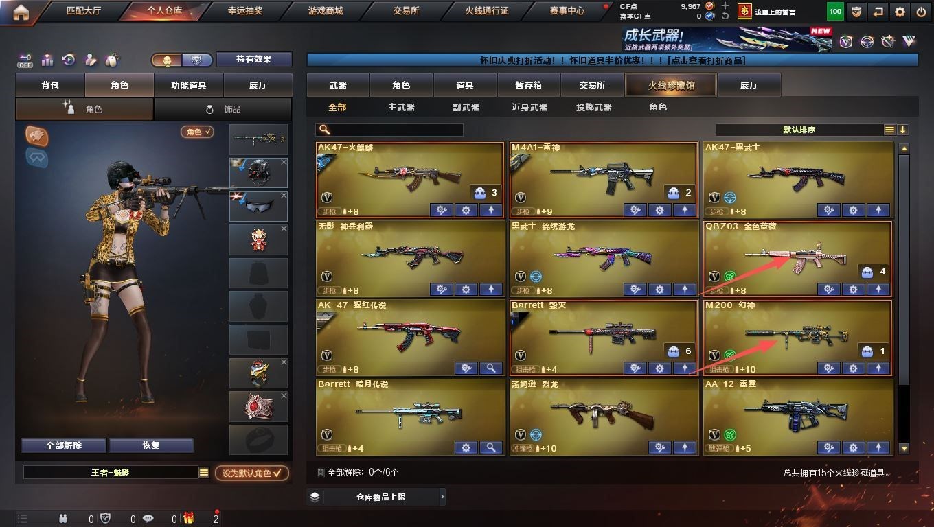 CFD524285号重庆一区 15v vip6 【m200幻神】【qbz03金色蔷薇】【毁灭毁灭音效卡】【火麒麟 雷神 黑武士 无影神兵利器 黑武士锦绣游龙 猩红传说 毁灭 暗月传说 烈龙 aa12雷霆】——【屠龙 擎天 王者冰封】——【角色】【4防王者魅影】【暗夜x】【潘多拉x】