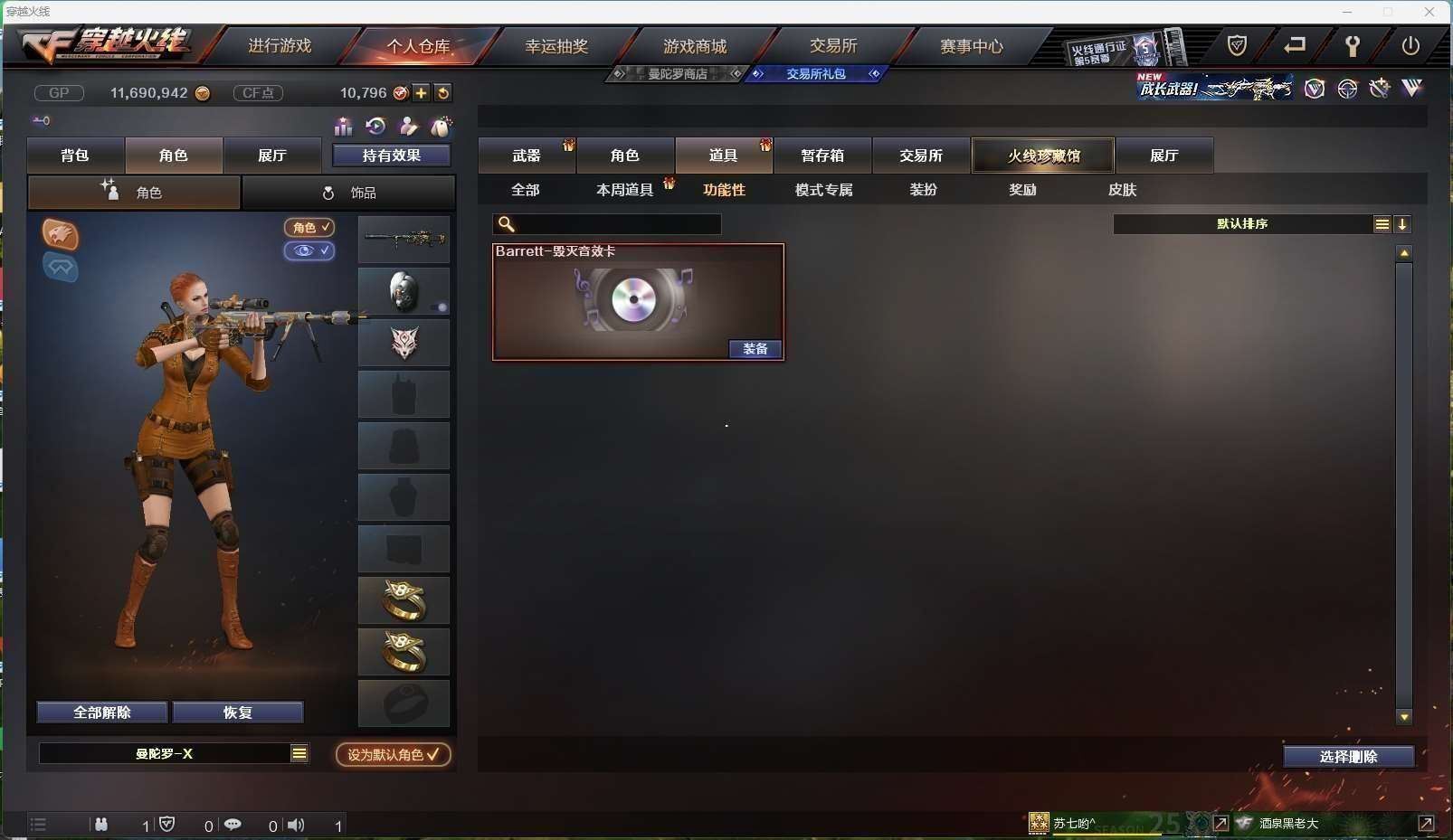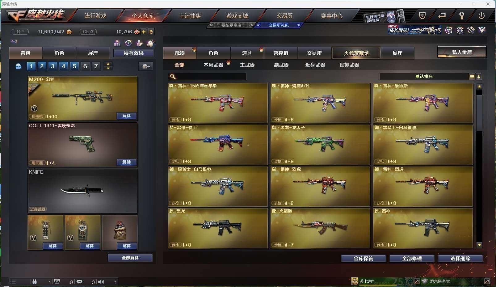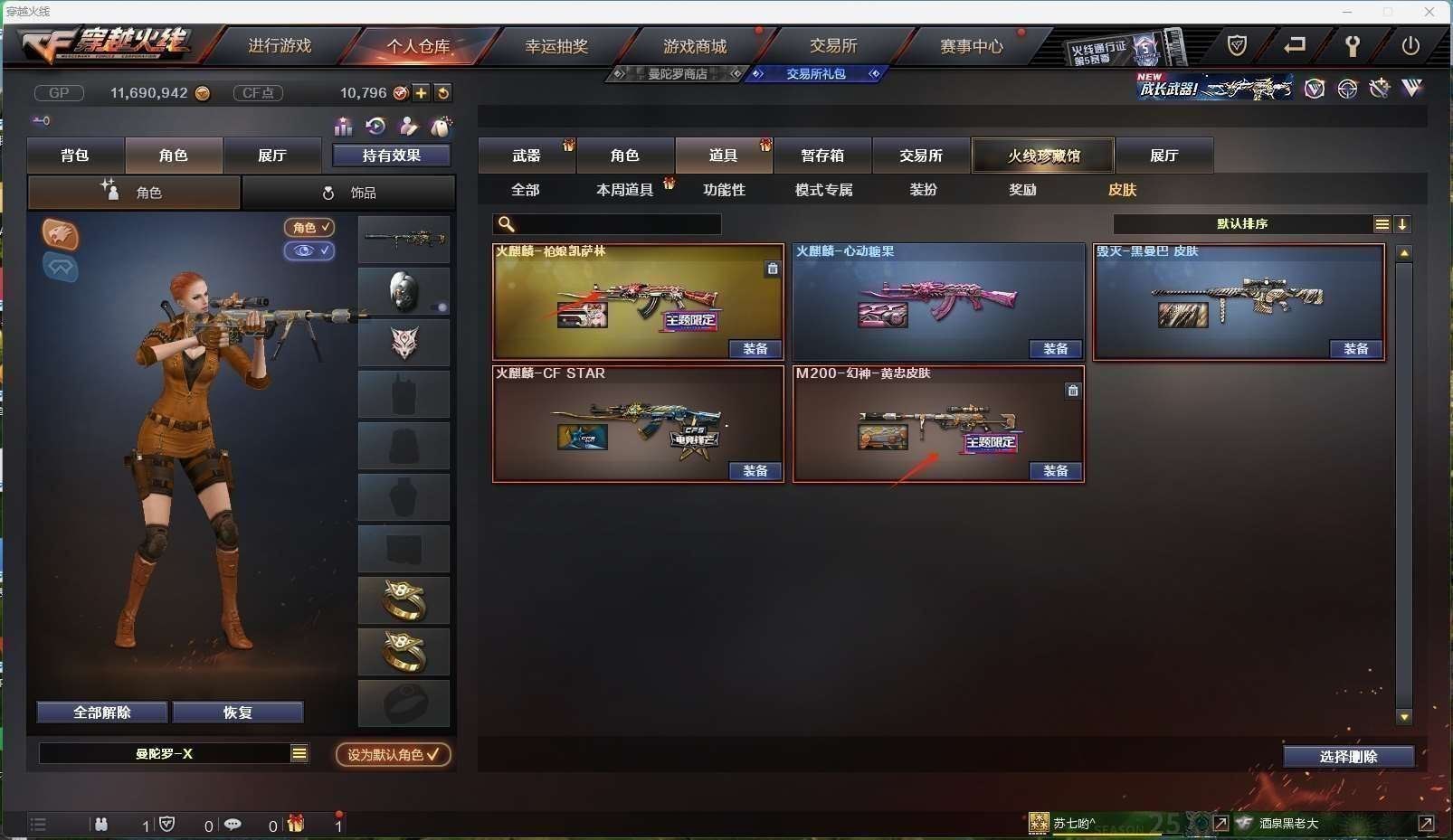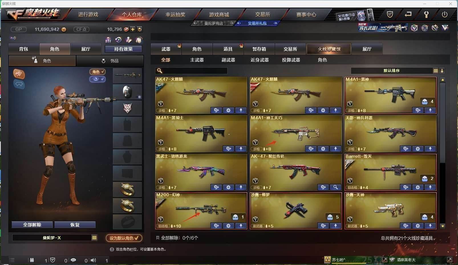 CFD524299号安徽一区21v vip5 【m200幻神黄忠皮肤】 【m4a1神工天巧】【毁灭毁灭音效卡】【火麒麟呛娘皮肤】【雷神 黑骑士 黑武士锦绣游龙 无影神兵利器 】——【天神 修罗】——【龙啸】——【神工天巧投掷武器套装2】——【角色】【暗夜x 电竞少女 灵狐者x 曼陀罗x 斯沃特x】