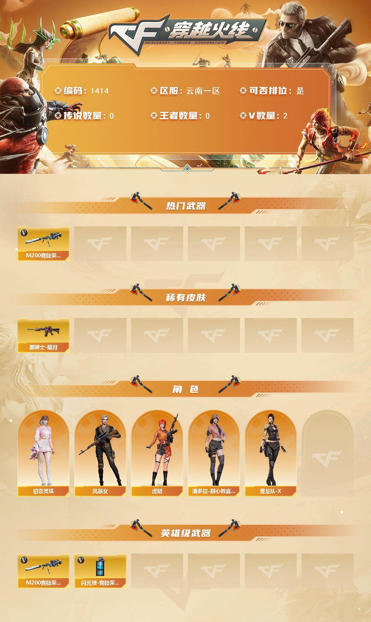 [16208875]云南一区-2v-0王者-0炫金 【热门武器】:m200-竞技荣光 【皮肤】:黑骑士-暗月 【角色】:初恋灵狐,风暴女,虎妞,潘多拉-甜心教官,潜龙队-x 【英雄级武器】:m200-竞技荣光,闪光丹-竞技荣光 【道具】:cfs限定背包,云山科技背包,黄金超能特工背包,绿色巨人,灵魂忍者,迷雾幽灵,夺命之镰,防化服3,ep战队名片,ep战队喷图,防弹头盔8,防弹衣8,c4工具钳8,手蕾包8 【特殊呛械】: