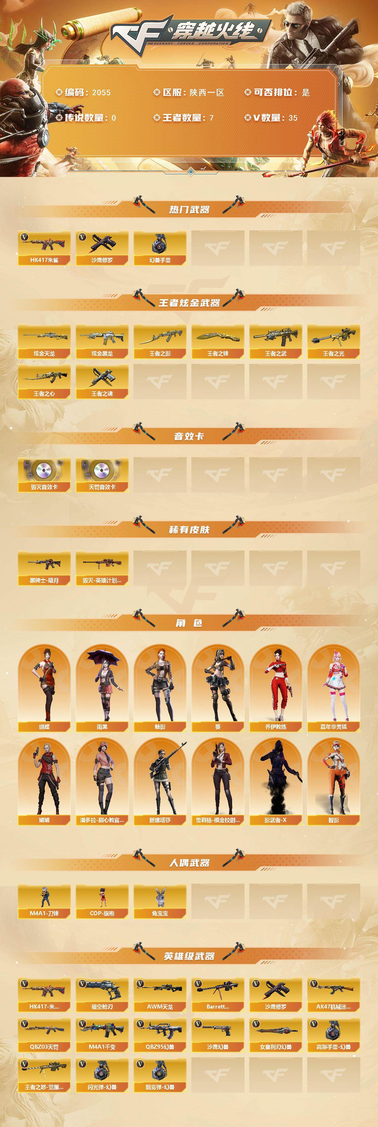【2055】贝34950可排位-可二次【陕西一区/37v/vip3】【纯白无封号/5套幻兽套蝴蝶角色/星神-长生圣莲】【破空呛刃】【q03-天罚/q03-天罚音效卡】【沙鹰-幻兽5】【王者之心/王者之影/王者之光/王者之魂/王者之锋/王者之武】【barrett-毁灭/barrett-毁灭音效卡】【火麒麟-cfstar】【hk417-朱雀】【awm-天龙/天龙-cfstar】【m4a1-千变】【沙鹰-修罗/修罗-cfstar】【女皇利刃-幻兽】【蝴蝶/魅影/雨棠/乔伊教练/娟娟/救世主-x/影武者-x/新娜塔莎/堕天使】【q95-幻兽/ak47-机械迷城2】【m4a1-刀锋/cop-旗袍/兔宝宝】【高爆手蕾-幻兽5/闪光丹-幻兽5/盐雾蛋-幻兽5】【炫金黑龙/炫金天龙】【透明头盔/透明护目镜/运动护目镜/超级背包/炫彩背包/防弹头盔3/防弹衣3/c4工具钳3/手蕾包3/防化服3】截图展示段位不代表实际段位,如赛季更新等不/拒因素发生变化、时限道具不保证所剩时间。标题未写送点卷默认不送