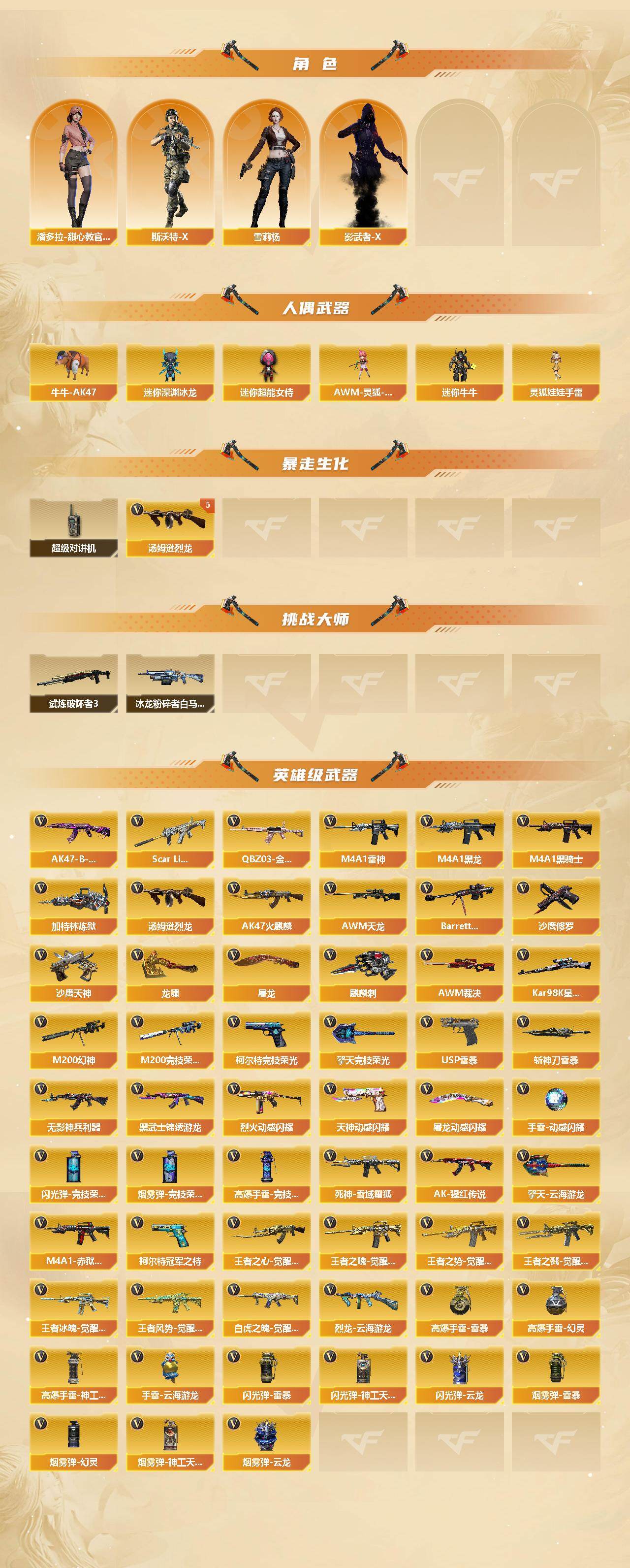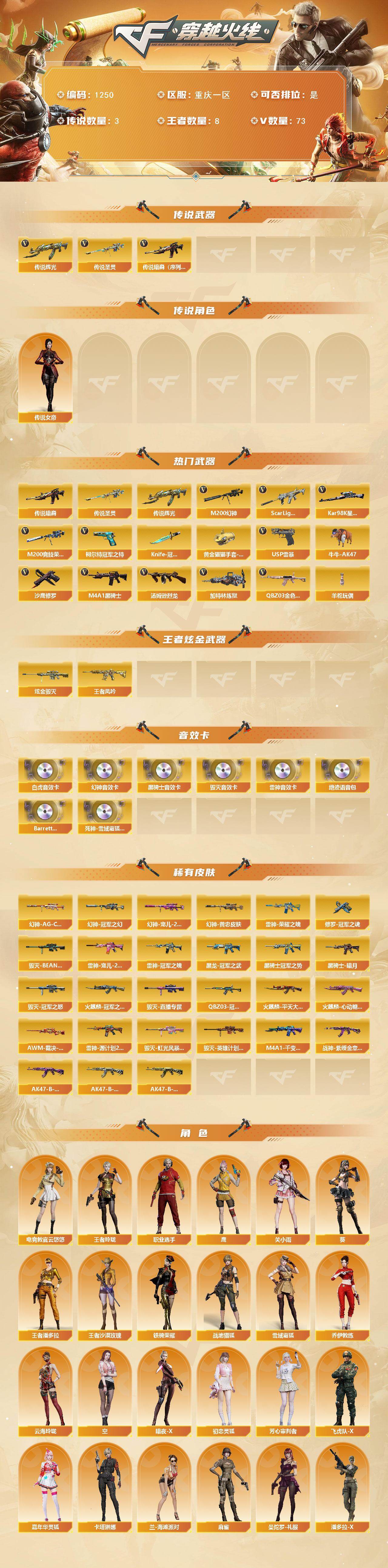 [16210524]重庆一区-73v-8王者-1炫金 【传说武器】:传说暗裔(序列号版),传说辉光,传说圣灵 【传说角色】:传说女帝 【热门武器】:传说暗裔,传说圣灵,传说辉光,q03-金色蔷薇2,scar light-白虎,m200-幻神,m200-竞技荣光,柯尔特-冠军之特2,kar98k-星神,牛牛-ak47,m4a1-黑骑士,汤姆逊-烈龙5,加特林-炼狱,羊驼玩偶,usp-雷暴,沙鹰-修罗3,knife-冠军之刃2,黄金猫猫手套-白鲨 【王者炫金武器】:王者凤吟,炫金毁灭 【音效卡】:m200-幻神音效卡,m4a1-雷神音效卡,m4a1-黑骑士音效卡,barrett-毁灭音效卡,scar light-白虎音效卡,绝迹语音包,barrett-碧霄极光音效卡,死神-雪域霜狐-怀旧音效卡 【皮肤】:m200-幻神-黄忠皮肤,幻神-冠军之幻,幻神-宠儿-2021mvp,幻神-ag-cfpl s24冠军 皮肤,q03-冠军之薇,awm-裁决-凤灵皮肤,雷神-荣耀之魄,雷神-冠军之魄,雷神-宠儿-2019mvp,雷神-源计划2.0专属 皮肤,火麒麟-冠军之心,火麒麟-平天大圣,火麒麟-心动糖果,毁灭-冠军之怒2,毁灭-bean-2020mvp,毁灭-直播专属,毁灭-虹光风暴 皮肤,毁灭-英雄计划 皮肤,m4a1-千变-孔明皮肤,黑龙-冠军之武,黑骑士-暗月,黑骑士-冠军之势,战神-紫绶金章皮肤,ak47-b-常胜将军-曹操,ak47-b-常胜将军-刘备,ak47-b-常胜将军-孙权,修罗-冠军之魂3 【角色】:葵,电竞教官-云悠悠,鹰,关小雨,战地猎狐,王者玲珑,王者潘多拉,王者沙漠玫瑰,雪域霜狐,乔伊教练,云海玲珑,空,暗夜-x,初恋灵狐,芳心审判者,飞虎队-x,嘉年华灵狐,卡塔琳娜,兰-海滩派对,麻雀,曼陀罗-礼服,潘多拉-x,潘多拉-甜心教官,斯沃特-x,铁骑荣耀,雪莉杨,影武者-x,职业选手 【人偶武器】:awm-灵狐-15周年嘉年华,牛牛-ak47,迷你深渊冰龙,迷你牛牛,迷你超能女侍,灵狐娃娃手蕾 【暴走生化】:超级对讲机 【挑战大师】:冰龙粉碎者-白马银呛,试炼破坏者iii 【英雄级武器】:ak47-火麒麟,m4a1-黑龙,m4a1-雷神3,m4a1-黑骑士,scar light-白虎,无影-神兵利器,黑武士-锦绣游龙,死神-雪域霜狐,q03-金