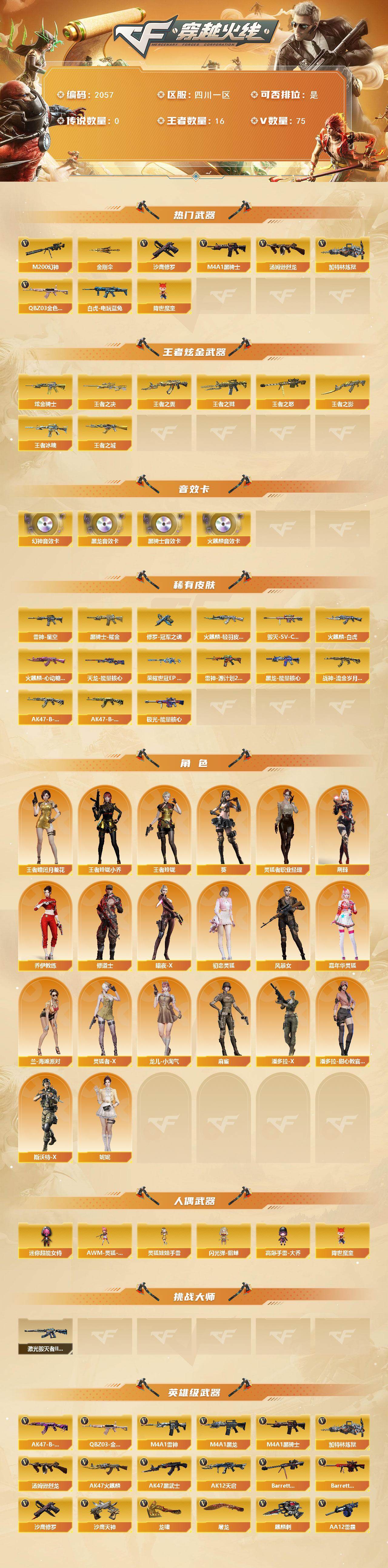 【2057】贝40588可排位-可二次【四川一区/80v/vip5】【纯白无封号/四防妮妮/幻神三件套/ep套/ep柯尔特/网剧套/7手呛/8套雷/3四防角色/火麒麟三件套/黑骑士三件套】【m200-幻神/m200-幻神音效卡/幻神-荣耀世冠ep 皮肤】【q03-金色蔷薇】【m4a1-雷神2/雷神-星空】【barrett-毁灭/毁灭-sv-cfpls16冠军】【ak47-火麒麟2/ak47-火麒麟音效卡/火麒麟-cfstar2/火麒麟-白虎/火麒麟-轻羽皮肤/火麒麟-心动糖果】【m4a1-黑骑士/m4a1-黑骑士音效卡/黑骑士-海王/黑骑士耀金皮肤】【m4a1-黑龙/黑龙-能量核心】【无影-神兵利器】【ak47-黑武士/黑武士-cf网剧冠军2】【天龙-cfstar/天龙-能量核心2】【barrett-极光/极光-能量核心】【汤姆逊-烈龙】【加特林-炼狱】【沙鹰-修罗/修罗-cfstar/修罗-冠军之魂】【沙鹰-天神2/天神-动感闪耀/天神-cf网剧冠军2】【麒麟刺】【擎天-cf网剧冠军2】【屠龙/屠龙-动感闪耀/屠龙-秘银】【龙啸/龙啸-烈火龙威】【王者玲珑-小乔/王者玲珑/王者-瞳-闭月羞花/龙儿-小淘气/暗夜-x/兰-海滩派对/木兰/乔伊教练/修道士/麻雀/潘多拉-x/斯沃特-x/堕天使/复仇者】【白虎-电玩蓝兔/ak47-b-常胜将军/ak47-b-身先士卒/ak47-b-战士/ak47-b-战神2/ak-47-猩红传说】【aa-12-雷霆/ak12-天启】【barrett-暗月传说3】【colt1911-小故障/colt 1911-大黄蜂4/新usp-呛王排位奖励5】【金刚伞/金刚伞-电玩红兔】【激光毁灭者iii-白马银呛】【王者之心/王者之影/王者炎心/王者之魄/王者之戮/王者冰魄/王者之决/王者之击/王者之啸】【高爆手蕾-竞技荣光/闪光丹-竞技荣光2/盐雾蛋-竞技荣光】【闪光丹-雷霆王者】【高爆手蕾-神工天巧/闪光丹-神工天巧】【盐雾蛋-幻灵】【炫金骑士】【烟雾保护头盔/闪光护目镜/超级背包/防弹头盔3/防弹衣5/c4工具钳4/手蕾包4/防化服3】截图展示段位不代表实际段位,如赛季更新等不/拒因素发生变化、时限道具不保证所剩时间。标题未写送点卷默认不送