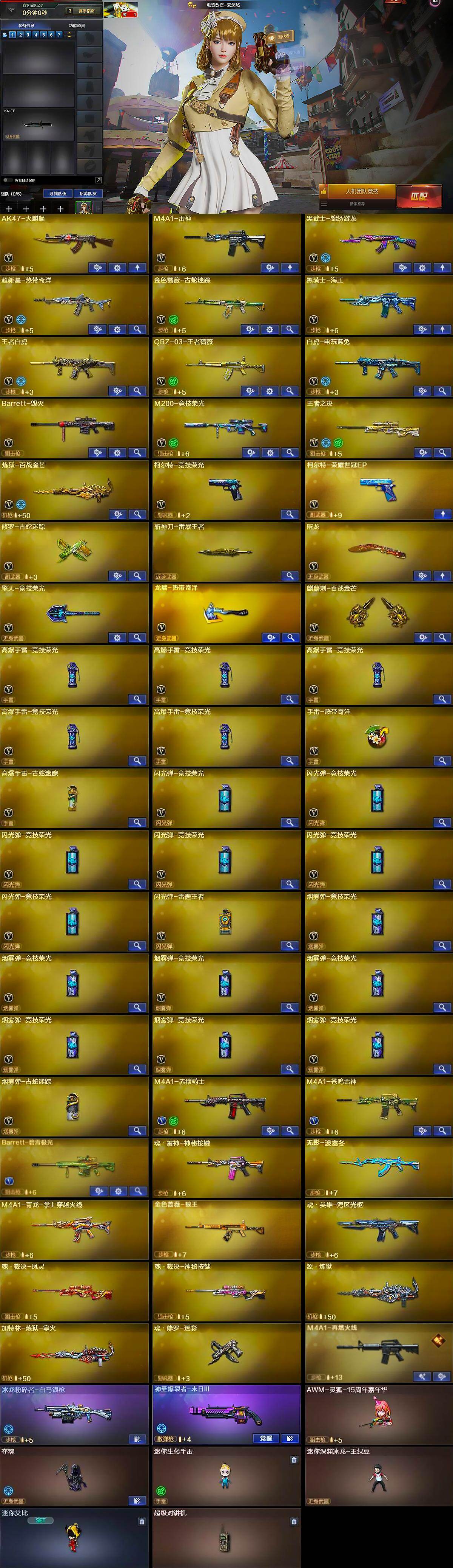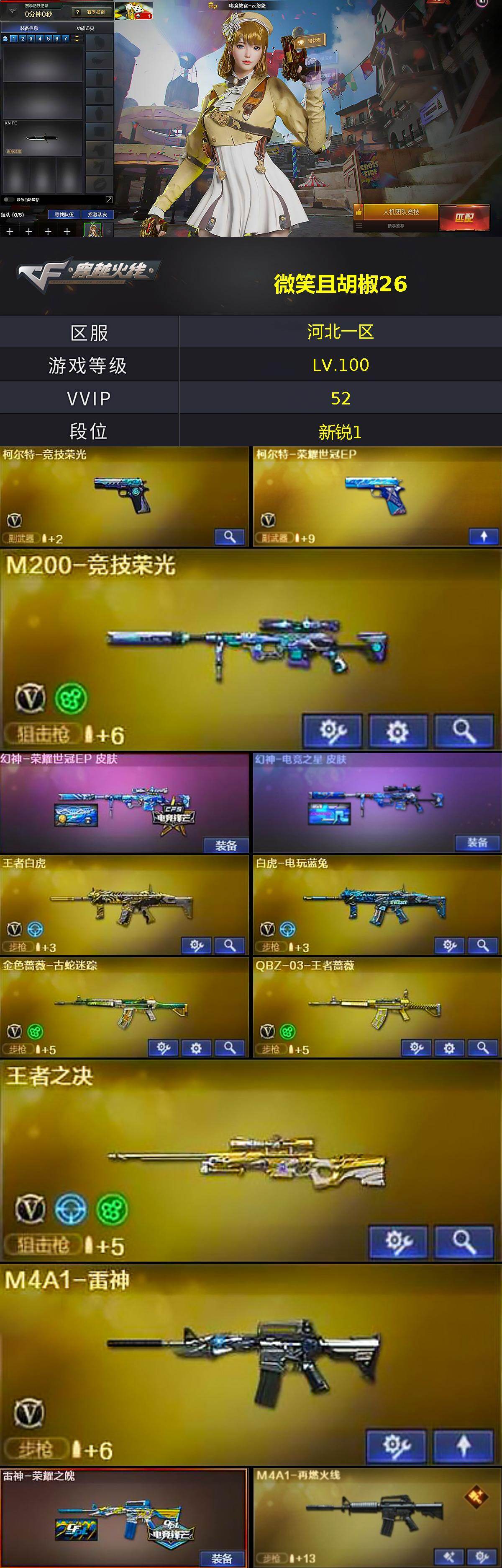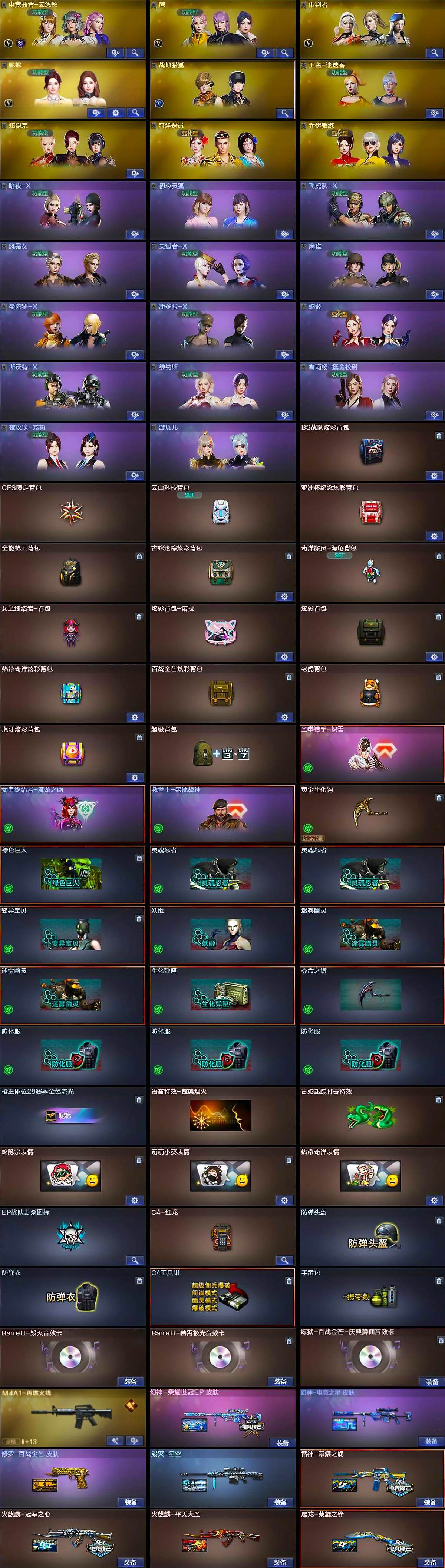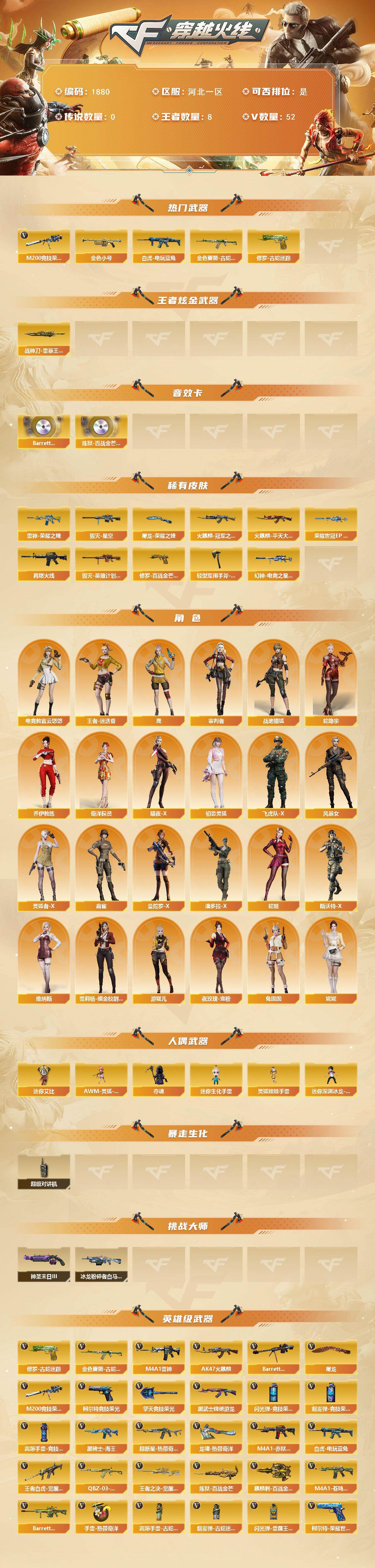 [16249233]河北一区-50v-8王者武器数-0炫金武器数 【热门武器】:金色蔷薇-古蛇迷踪,修罗-古蛇迷踪,m200-竞技荣光,白虎-电玩蓝兔,金色小号 【王者炫金武器】:斩神刀-雷暴王者 【音效卡】:barrett-碧霄极光音效卡,炼狱-百战金芒-庆典舞曲音效卡 【皮肤】:幻神-荣耀世冠ep 皮肤,幻神-电竞之星 皮肤,雷神-荣耀之魄,m4a1-再燃火线,火麒麟-冠军之心,火麒麟-平天大圣,毁灭-星空,毁灭-英雄计划 皮肤,修罗-百战金芒 皮肤,屠龙-荣耀之锋,轻型军用手斧-再燃火线 【角色】:电竞教官-云悠悠,鹰,审判者,妮妮,战地猎狐,王者-迷迭香,蛇隐宗,奇洋探员,乔伊教练,暗夜-x,初恋灵狐,飞虎队-x,风暴女,灵狐者-x,麻雀,曼陀罗-x,潘多拉-x,蛇姬,斯沃特-x,兔囡囡,维纳斯,雪莉杨-摸金校尉,夜玫瑰-宠粉,游珑儿 【人偶武器】:awm-灵狐-15周年嘉年华,夺魂,迷你生化手蕾,迷你深渊冰龙-王绿豆,迷你艾比,灵狐娃娃手蕾 【暴走生化】:超级对讲机 【挑战大师】:冰龙粉碎者-白马银呛,神圣爆裂者-末日iii 【英雄级武器】:ak47-火麒麟,m4a1-雷神,黑武士-锦绣游龙,超新星-热带奇洋,金色蔷薇-古蛇迷踪,黑骑士-海王,王者白虎-觉醒版,q-03-王者蔷薇-觉醒版,白虎-电玩蓝兔,barrett-毁灭,m200-竞技荣光,王者之决-觉醒版,炼狱-百战金芒,柯尔特-竞技荣光,柯尔特-荣耀世冠ep,修罗-古蛇迷踪,屠龙,擎天-竞技荣光,龙啸-热带奇洋,麒麟刺-百战金芒,高爆手蕾-竞技荣光5,手蕾-热带奇洋,高爆手蕾-古蛇迷踪,闪光丹-竞技荣光6,闪光丹-雷霆王者-觉醒版,盐雾蛋-竞技荣光7,盐雾蛋-古蛇迷踪,m4a1-赤狱骑士,m4a1-苍鸣雷神,barrett-碧霄极光 【道具】:bs战队炫彩背包,cfs限定背包,云山科技背包,亚洲杯纪念炫彩背包,全能呛王背包,古蛇迷踪炫彩背包,奇洋探员-海龟背包,女皇终结者-背包,炫彩背包-诺拉,炫彩背包,热带奇洋炫彩背包,百战金芒炫彩背包,老虎背包,虎牙炫彩背包,超级背包,圣拳猎手-炽雪,女皇终结者-魔龙之吻,救世主-黑桃战神,黄金生化钩,绿色巨人,灵魂忍者2,变异宝贝,妖姬,迷雾幽灵2,生化弹匣,夺命之镰,防化服3,呛王排位29赛季金色流光,语音特效-盛典烟火,古蛇迷踪打击特效,蛇隐宗表情,萌萌小