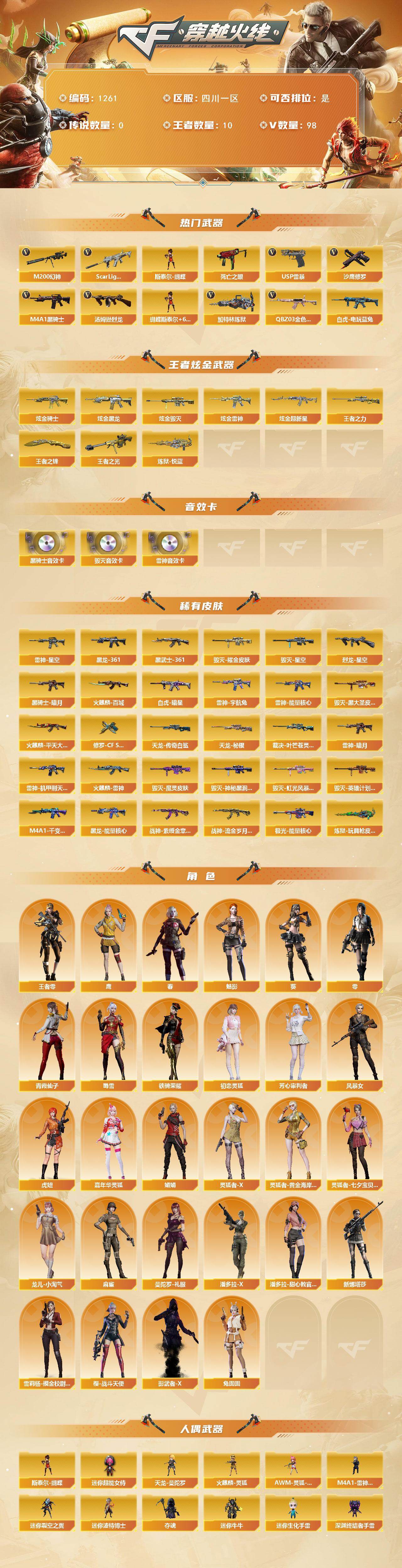 [16249637]四川一区-98v-10王者-9炫金 【热门武器】:q03-金色蔷薇,scar light-白虎,m200-幻神2,死亡之眼,白虎-电玩蓝兔,m4a1-黑骑士,汤姆逊-烈龙6,加特林-炼狱4,斯泰尔-蝴蝶,usp-雷暴,沙鹰-修罗2 【王者炫金武器】:王者之光3,王者之力,炼狱-悦蓝,王者之锋,炫金骑士2,炫金黑龙,炫金雷神,炫金超新星,炫金毁灭4 【音效卡】:m4a1-雷神音效卡,m4a1-黑骑士音效卡,barrett-毁灭音效卡 【皮肤】:scar light-白虎-暗星,裁决-叶芒苍灵 皮肤,烈龙-星空,雷神-暗月,雷神-能量核心,雷神-星空,雷神-机甲刑天皮肤,雷神-宇航兔皮肤,火麒麟-雷神,火麒麟-平天大圣2,火麒麟-百城,毁灭耀金皮肤,毁灭-星空,毁灭-黑大圣皮肤,毁灭-魔灵皮肤,毁灭-神秘黑洞皮肤,毁灭-虹光风暴 皮肤,毁灭-英雄计划 皮肤,m4a1-千变-孔明皮肤,黑龙-能量核心,m4a1-黑龙-361,黑骑士-暗月,ak47-黑武士-361,战神-紫绶金章皮肤,战神-流金岁月皮肤,天龙-秘银,awm-天龙-传奇白鲨,极光-能量核心,炼狱-玩具呛皮肤,修罗-cf star 【角色】:零,葵,魅影,春,鹰,王者-零,初恋灵狐,芳心审判者,风暴女2,虎妞,嘉年华灵狐,娟娟,灵狐者-x,灵狐者-黄金海岸,灵狐者-七夕宝贝,龙儿-小淘气,麻雀,曼陀罗-礼服,潘多拉-x,潘多拉-甜心教官,青霞仙子,蜀雪,铁骑荣耀,兔囡囡,新娜塔莎,雪莉杨-摸金校尉,樱-战斗天使,影武者-x 【人偶武器】:天龙-曼陀罗,火麒麟-灵狐,m4a1-雷神-精英刀锋2,斯泰尔-蝴蝶,awm-灵狐-15周年嘉年华,迷你裂空之翼,迷你波特博士,夺魂2,迷你牛牛,迷你生化手蕾,深渊终结者手蕾,迷你超能女侍 【暴走生化】:死亡之眼,超级对讲机 【挑战大师】:暴君乱世-超越max,神圣爆裂者iii,冰龙粉碎者-白马银呛3,激光毁灭者iii-白马银呛2,激光毁灭者iii,试炼破坏者iii,阐释者iii2 【英雄级武器】:ak47-火麒麟2,m4a1-黑龙5,m4a1-雷神3,m4a1-黑骑士,m4a1-死神2,ak47-黑武士,ak12-天启,an94-超新星,ak47-机械迷城,ak47-黑鲨5,m4a1-龙血,ak47-雷暴,scar light-白虎
