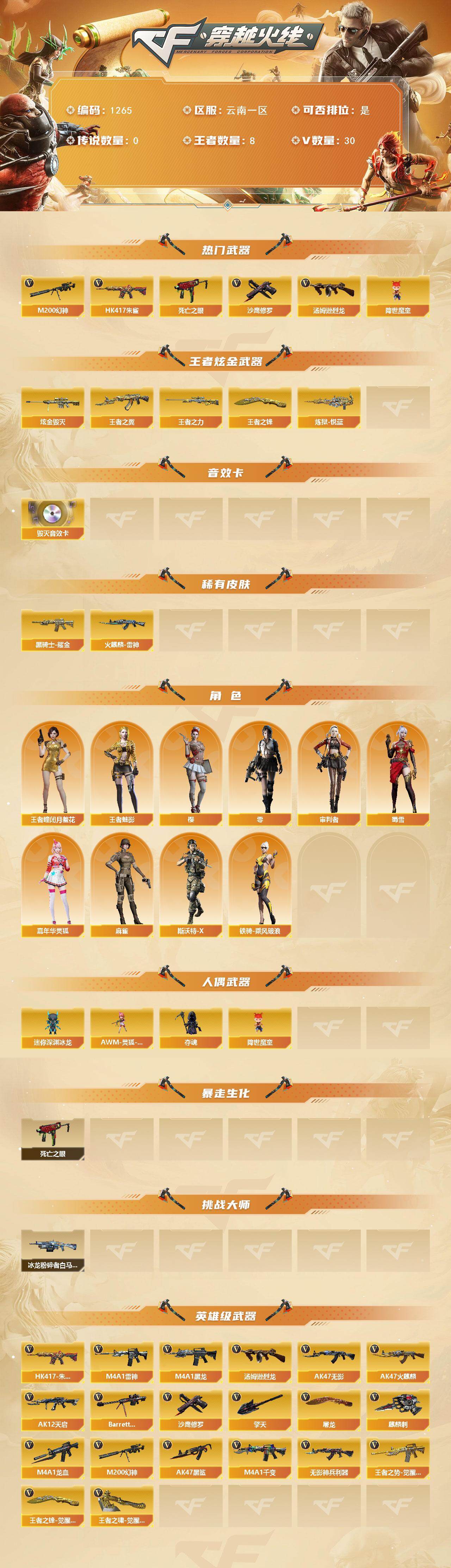 [16268822]云南一区-30v-8王者-1炫金 【热门武器】:hk417-朱雀,m200-幻神,死亡之眼,汤姆逊-烈龙,降世魔童,沙鹰-修罗 【王者炫金武器】:王者之翼,王者之力,炼狱-悦蓝,王者之锋2,炫金毁灭 【音效卡】:barrett-毁灭音效卡 【皮肤】:火麒麟-雷神,黑骑士耀金皮肤 【角色】:零,樱,审判者,王者-瞳-闭月羞花,王者-魅影,嘉年华灵狐,麻雀,斯沃特-x,蜀雪,铁骑-乘风破浪 【人偶武器】:awm-灵狐-15周年嘉年华,迷你深渊冰龙,夺魂,降世魔童 【暴走生化】:死亡之眼 【挑战大师】:冰龙粉碎者-白马银呛 【英雄级武器】:m4a1-千变2,ak47-火麒麟4,m4a1-黑龙,m4a1-雷神,ak47-无影,ak12-天启3,ak47-黑鲨,m4a1-龙血2,hk417-朱雀,无影-神兵利器,王者之势-觉醒版,barrett-毁灭2,m200-幻神,汤姆逊-烈龙,沙鹰-修罗,屠龙2,擎天,麒麟刺,王者之锋-觉醒版,王者之啸-觉醒版 【道具】:黄金生化钩,夺命之镰,防化服,金色流光-呛王排位2,星辰流光-呛王排位,呛王排位28赛季金色流光,呛王排位29赛季金色流光,防弹头盔,防弹衣,c4工具钳,手蕾包 【特殊呛械】:1烈龙