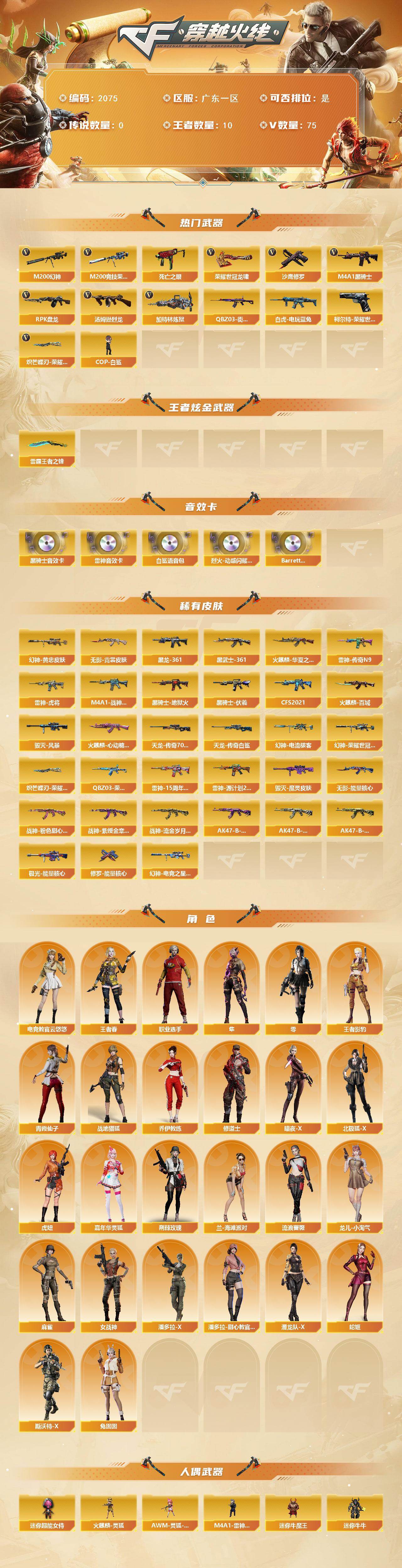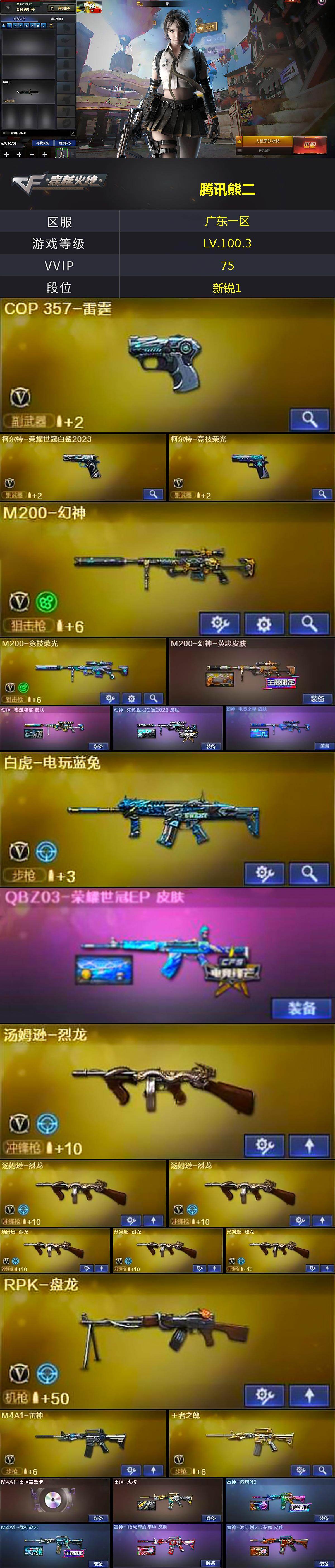 【2075】特10833可排位-可二次【广东一区/77v/vip6】【纯白无封号/幻神四皮肤/竞技荣光套/6烈龙毒刺/9手呛拉满/3四防角色】【m200-幻神/m200-幻神-黄忠皮肤/幻神-电流骇客 皮肤/幻神-荣耀世冠白鲨2023 皮肤】【m200-竞技荣光】【炽芒蝶刃-荣耀世冠白鲨2023 皮肤】【柯尔特-竞技荣光/柯尔特-荣耀世冠白鲨2023】【m4a1-雷神/m4a1-雷神音效卡/m4a1-雷神-白鲨皮肤2/雷神-传奇n9/m4a1-战神赵云/雷神-虎将】【隼】【glock18-武圣/雷霆之契】【barrett-毁灭/毁灭-风暴2/毁灭-魔灵皮肤】【ak47-火麒麟2/火麒麟-百城/火麒麟-cfstar3/火麒麟-心动糖果/火麒麟-华夏之心2】【m4a1-黑骑士2/m4a1-黑骑士音效卡/黑骑士-cfs2021/黑骑士-地狱火/黑骑士-伏羲2】【m4a1-黑龙-361】【烈火-动感闪耀 音效卡】【ak47-无影/无影-神兵利器/无影-霓裳皮肤/无影-能量核心】【ak47-黑武士-361】【awm-天龙/天龙-cfstar/awm-天龙-传奇70kg/awm-天龙-传奇白鲨】【barrett-极光/barrett-极光音效卡/极光-能量核心】【m4a1-死神3】【汤姆逊-烈龙6】【rpk-盘龙】【加特林-炼狱/炼狱-悦蓝】【死亡之眼/迷你生化手蕾】【沙鹰-修罗2/修罗-cfstar2/修罗-能量核心】【沙鹰-天神2/天神-动感闪耀】【擎天/擎天-竞技荣光4】【屠龙2/屠龙-动感闪耀】【荣耀世冠-龙啸/龙啸-烈火龙威】【电竞教官-云悠悠/职业选手/王者春/王者影豹/龙儿-小淘气/暗夜-x/兰-海滩派对/女战神/木兰/乔伊教练/修道士/兔囡囡/荆棘玫瑰/麻雀/青霞仙子/妲己/潘多拉-x/斯沃特-x/幻影/堕天使/复仇者】【m4a1-武圣】【白虎-电玩蓝兔/ak47-b-战士/ak47-b-战神2/ak-47-猩红传说2】【ak47-机械迷城】【barrett-暗月传说】【colt1911-小故障/colt 1911-大黄蜂3/柯尔特-萌杀2/新usp-呛王排位奖励4】【雷霆王者之锋/斩神刀/金刚伞-电玩红兔】【黑龙吞噬者/斯泰尔-巧克力/轻型军用手斧-镜】【m4a1-雷神-精英刀锋/m4a1-小黄鸡/cop-白鲨/火麒麟-灵狐】【王者之心/王者之魄/王者之势/王者之戮/王者之武】【高爆手蕾-竞技荣光3/闪光丹-竞技荣光2/盐雾蛋-竞技荣光3】【高爆手蕾-雷霆王者/闪光丹-雷霆王者】【高爆手蕾-幻灵/闪光丹-幻灵/盐雾蛋-幻灵3】【盐雾蛋-荣耀世冠白鲨2023】【白鲨语音包/语音特效-机器人】【超级背包/防弹头盔6/防弹衣7/c4工具钳3/手蕾包2/防化服2】截图展示段位不代表实际段位,如赛季更新等不/拒因素发生变化、时限道具不保证所剩时间