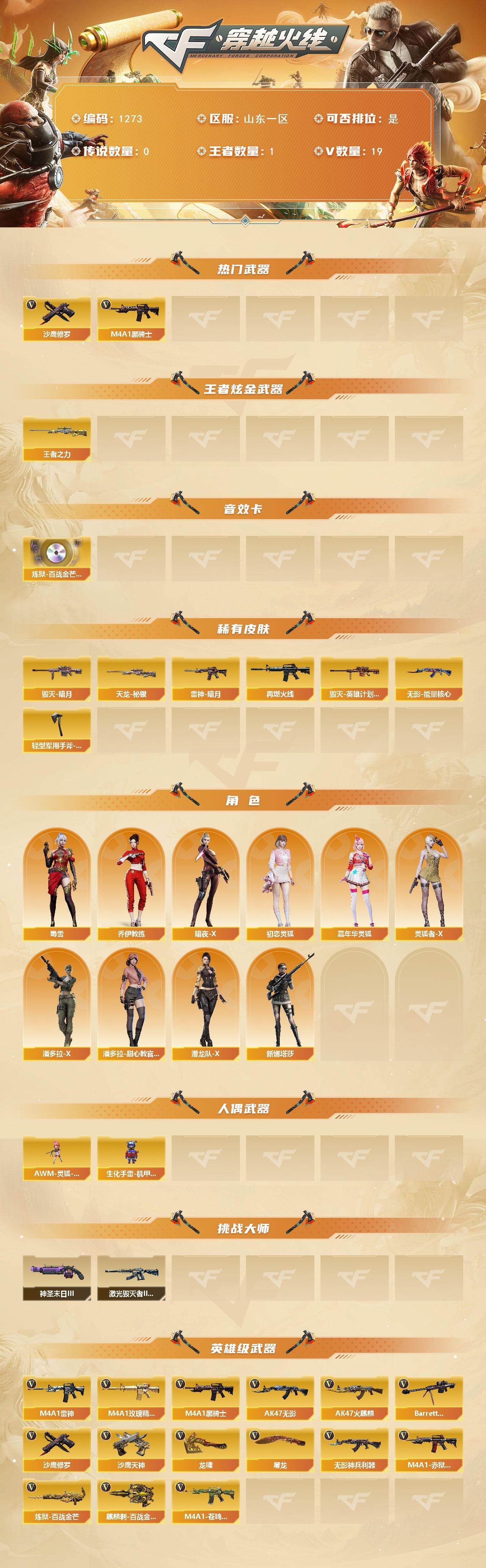 [16276121]山东一区-19v-1王者-0炫金 【热门武器】:m4a1-黑骑士,沙鹰-修罗 【王者炫金武器】:王者之力 【音效卡】:炼狱-百战金芒-庆典舞曲音效卡 【皮肤】:雷神-暗月,m4a1-再燃火线,毁灭-暗月,毁灭-英雄计划 皮肤,无影-能量核心,天龙-秘银,轻型军用手斧-再燃火线 【角色】:乔伊教练,暗夜-x,初恋灵狐,嘉年华灵狐,灵狐者-x,潘多拉-x,潘多拉-甜心教官,潜龙队-x,蜀雪,新娜塔莎 【人偶武器】:awm-灵狐-15周年嘉年华,生化手蕾-机甲核心 【挑战大师】:激光毁灭者iii-白马银呛,神圣爆裂者-末日iii2 【英雄级武器】:ak47-火麒麟,m4a1-雷神,m4a1-黑骑士,ak47-无影,无影-神兵利器,m4a1-玫瑰精灵,barrett-毁灭,炼狱-百战金芒,沙鹰-修罗,沙鹰-天神3,屠龙,龙啸,麒麟刺-百战金芒,m4a1-赤狱骑士,m4a1-苍鸣雷神 【道具】:bs战队炫彩背包,云山科技背包,亚洲杯纪念炫彩背包,全能呛王背包,战舰背包,炫彩背包,百战金芒炫彩背包,背包-洛丽塔,女皇终结者-魔龙之吻,救世主-黑桃战神,黄金生化钩,绿色巨人,灵魂忍者,迷雾幽灵,夺命之镰,防化服3,金色流光-呛王排位,呛王排位29赛季金色流光,语音特效-盛典烟火,萌萌小葵表情,动感闪耀表情,防弹头盔4,防弹衣5,c4工具钳4,手蕾包4 【特殊呛械】:1黑骑士