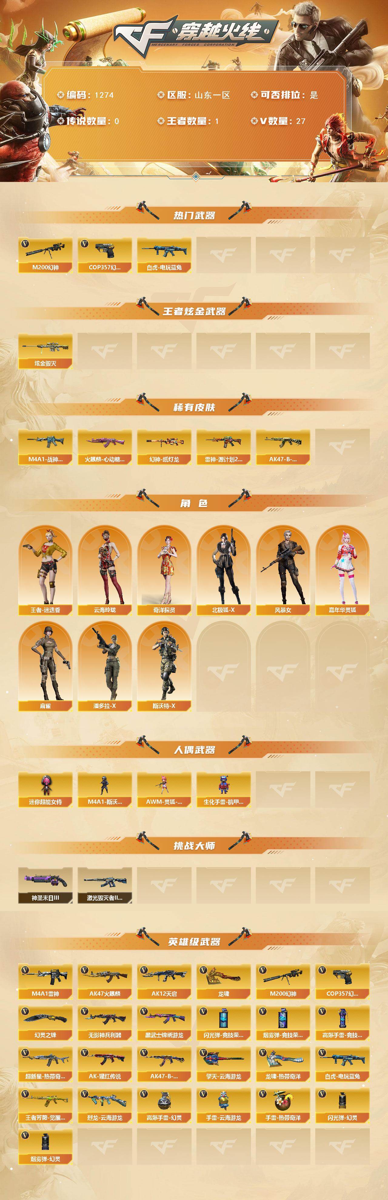 [16280613]山东一区-27v-1王者-1炫金 【热门武器】:m200-幻神,白虎-电玩蓝兔,cop 357-幻灵 【王者炫金武器】:炫金毁灭 【皮肤】:幻神-纸灯龙皮肤,m4a1-战神赵云,雷神-源计划2.0专属 皮肤,火麒麟-心动糖果,ak47-b-常胜将军-孙权 【角色】:王者-迷迭香,奇洋探员,云海玲珑,北极狐-x,风暴女,嘉年华灵狐,麻雀,潘多拉-x,斯沃特-x 【人偶武器】:awm-灵狐-15周年嘉年华,生化手蕾-机甲核心,m4a1-斯沃特,迷你超能女侍 【挑战大师】:激光毁灭者iii-白马银呛,神圣爆裂者-末日iii 【英雄级武器】:ak47-火麒麟2,m4a1-雷神,ak12-天启,无影-神兵利器,黑武士-锦绣游龙,超新星-热带奇洋,ak-47-猩红传说2,ak47-b-战神,白虎-电玩蓝兔,王者芳薇-觉醒版,m200-幻神,烈龙-云海游龙,cop 357-幻灵,龙啸,幻灵之锋,擎天-云海游龙,龙啸-热带奇洋,高爆手蕾-幻灵,高爆手蕾-竞技荣光,手蕾-云海游龙,手蕾-热带奇洋,闪光丹-幻灵,闪光丹-竞技荣光,盐雾蛋-幻灵,盐雾蛋-竞技荣光 【道具】:云海游龙炫彩背包,全能呛王背包,奇洋探员-海龟背包,热带奇洋炫彩背包,超级背包,夺命之镰,防化服,金色流光-呛王排位2,星辰流光-呛王排位,呛王排位28赛季金色流光,呛王排位29赛季金色流光,电玩兔兔表情,热带奇洋表情,云海游龙表情,防弹头盔2,防弹衣2,c4工具钳2,手蕾包2 【特殊呛械】: