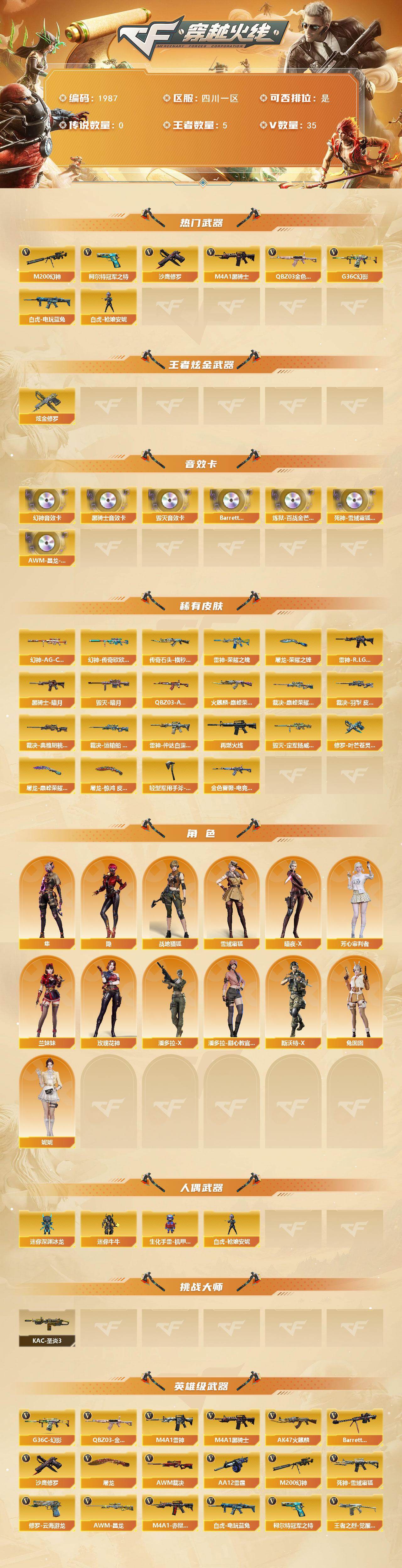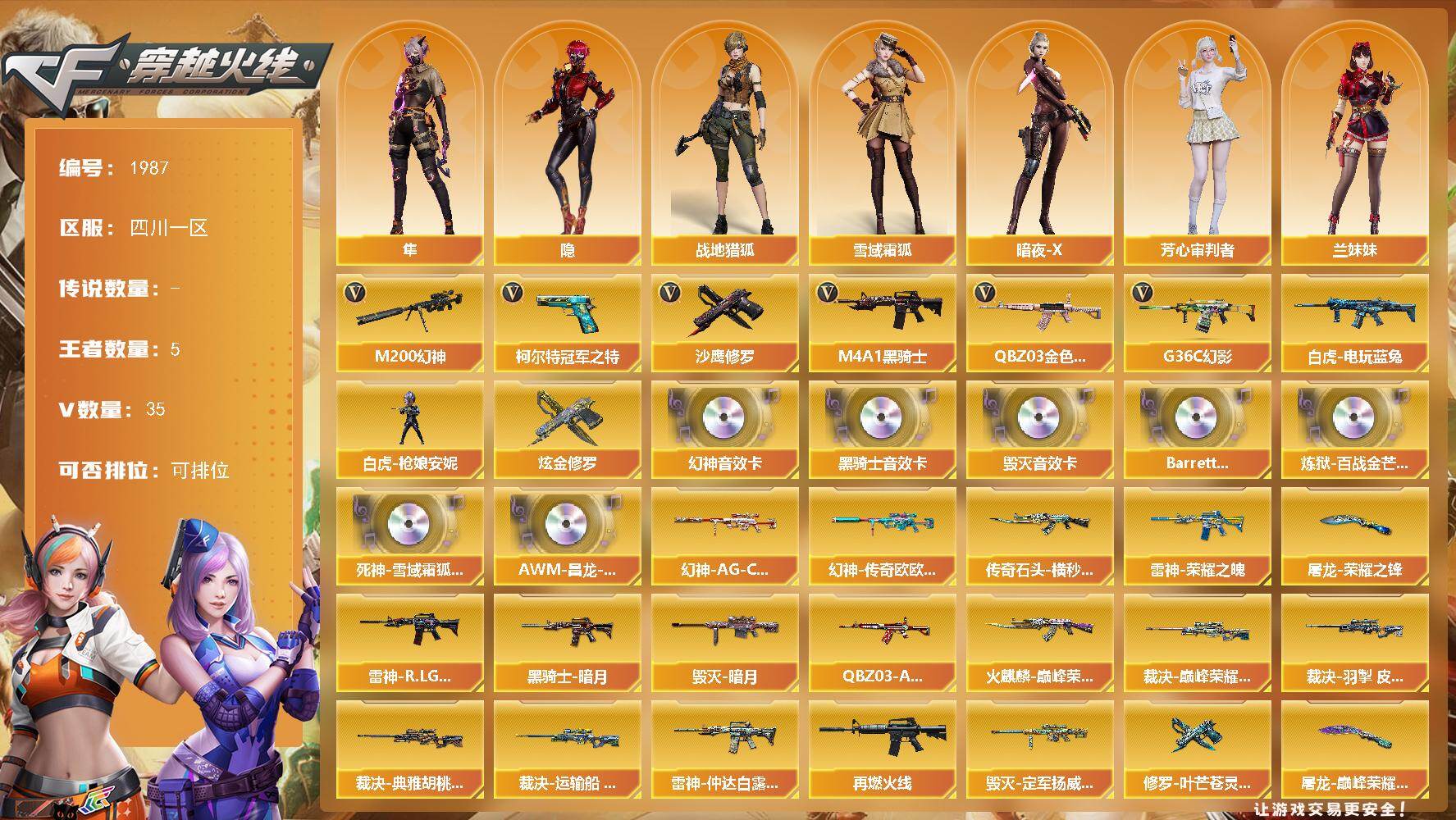 【1987】38710可排位-可二次【四川一区/33v/vip4】【纯白无封号/幻神三件套/妮妮角色/ep柯尔特冠军之特】【m200-幻神/m200-幻神音效卡/幻神-传奇欧欧 皮肤/幻神-ag-cfpls24冠军】【王者星神/王者风神】【g36c-幻影】【柯尔特-冠军之特】【q03-金色蔷薇/q03-ag-cfpls19冠军】【m4a1-雷神2/雷神-荣耀之魄/雷神-r.lgd-cfpls18冠军】【隼】【barrett-毁灭/barrett-毁灭音效卡/毁灭-暗月】【ak47-火麒麟/ak47-火麒麟音效卡/火麒麟-巅峰荣耀/火麒麟-cfstar】【m4a1-黑骑士/m4a1-黑骑士音效卡】【天龙-cfstar】【awm-裁决】【沙鹰-修罗/修罗-cfstar/修罗-云海游龙】【屠龙2/屠龙-荣耀之锋】【隐/暗夜-x/兔囡囡/潘多拉-x/斯沃特-x】【白虎-电玩蓝兔/scar light-像素】【aa-12-雷霆】【colt 1911-大黄蜂】【迷你深渊冰龙5】【kac-圣炎切割者iii】【白虎-呛娘安妮】【闪光丹-雷霆】【高爆手蕾-雷暴王者2】【炫金修罗】【防弹头盔3/防弹衣3/c4工具钳3/手蕾包3/防化服3】截图展示段位不代表实际段位,如赛季更新等不/拒因素发生变化、时限道具不保证所剩时间