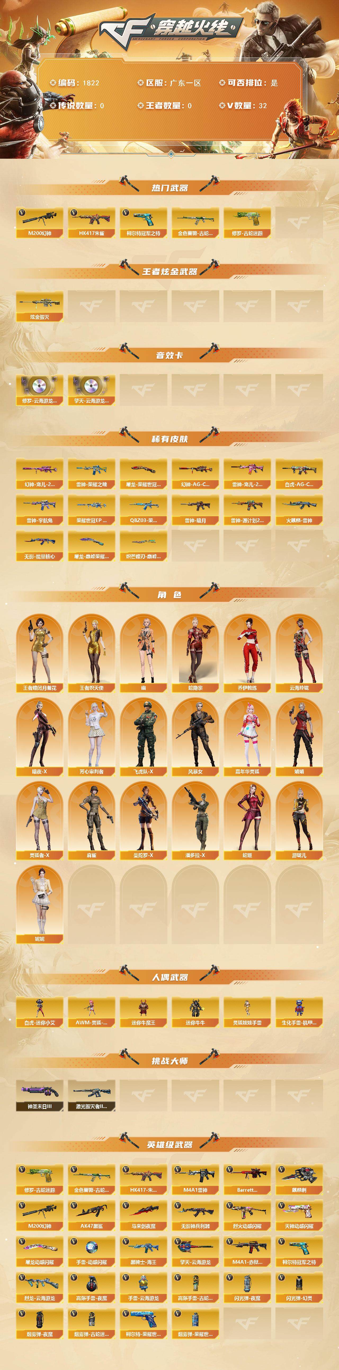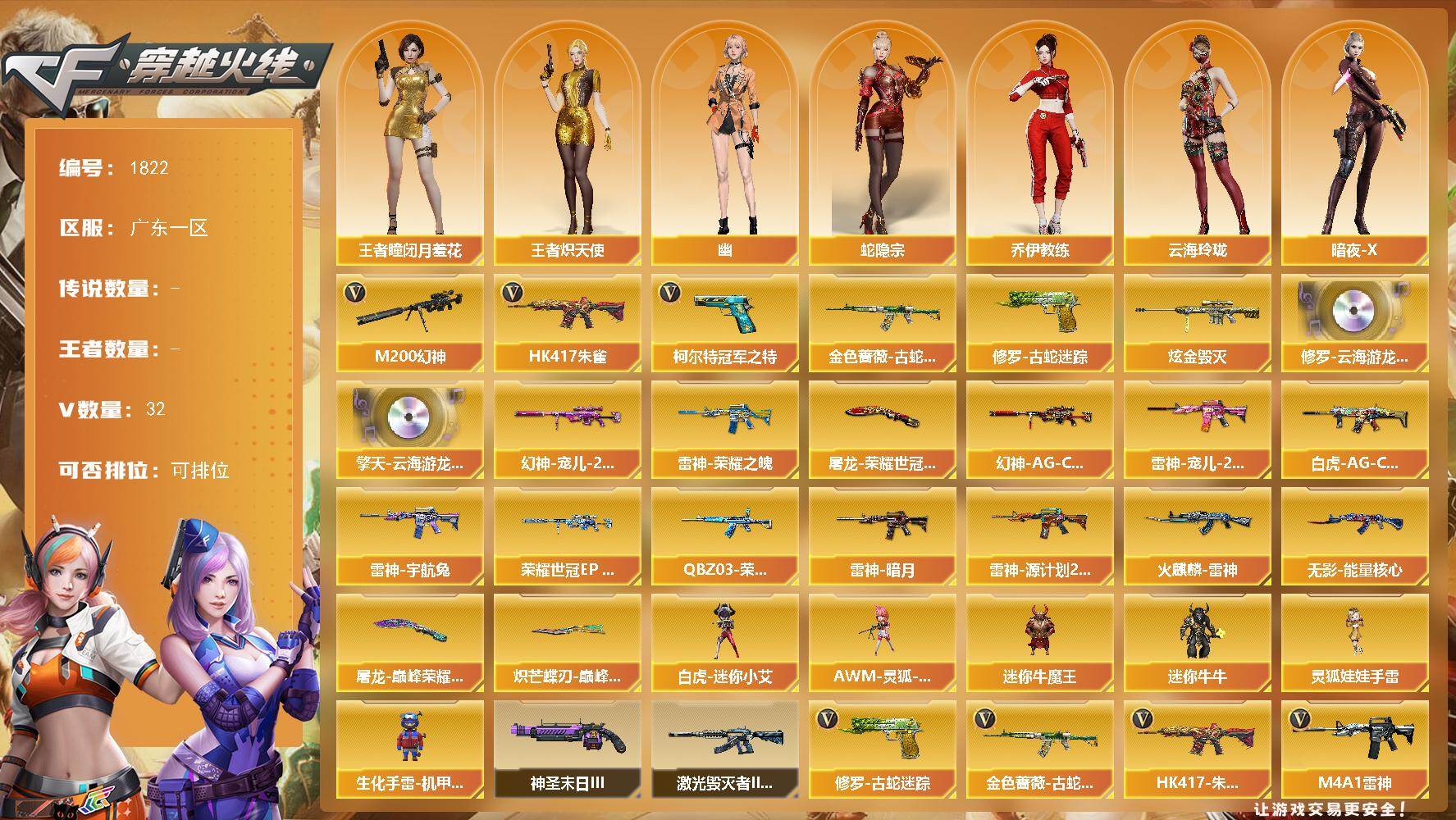 【1822】特24555可排位-可二次【广东一区/32v/vip6】【四防妮妮/ep活动全打穿/幻神三皮肤/3把ep柯尔特冠军之特/ep小刀/4个ep盐雾蛋/雷神三件套】【m200-幻神/幻神-荣耀世冠ep,皮肤/幻神-宠儿-2021mvp/幻神-ag-cfpls17冠军】【柯尔特-冠军之特3柯尔特-荣耀世冠ep】【白虎-迷你小艾】【白虎-ag-cfpls20冠军】【m4a1-雷神2/m4a1-雷神-动感闪耀音效卡/雷神-荣耀之魄/雷神-宠儿-2019mvp/雷神-宇航兔皮肤/雷神-暗月】【火麒麟-cfstar/火麒麟-雷神】【黑骑士-海王】【hk417-朱雀】【无影-神兵利器/无影-能量核心】【barrett-极光】【烈龙-云海游龙】【修罗-云海游龙音效卡/修罗-cfstar2】【天神-动感闪耀】【麒麟刺】【擎天-云海游龙音效卡/擎天-云海游龙】【屠龙-荣耀世冠ag/屠龙-动感闪耀】【龙啸-烈火龙威】【王者炽天使/王者-瞳-闭月羞花/暗夜-x/幽/木兰/云海玲珑/乔伊教练/麻雀/妲己/娟娟/潘多拉-x/救世主-x/堕天使/复仇者】【ak47-黑鲨】【colt1911-小故障2/colt,1911-大黄蜂2/新usp-呛王排位奖励4】【斩神刀/马来剑-夜魔】【神圣爆裂者-末日iii/激光毁灭者iii-白马银呛】【斯泰尔-巧克力2】【手蕾-云海游龙】【闪光丹-幻灵】【高爆手蕾-夜魔/闪光丹-夜魔/盐雾蛋-夜魔】【炫金毁灭】【语音特效-云海游龙】【超级护目镜/烟雾保护头盔/闪光护目镜/超级背包/防弹头盔4/防弹衣4/c4工具钳4/手蕾包4/防化服2】截图展示段位不代表实际段位,如赛季更新等不/拒因素发生变化、时限道具不保证所剩时间 【稀有套装】:雷神三件套