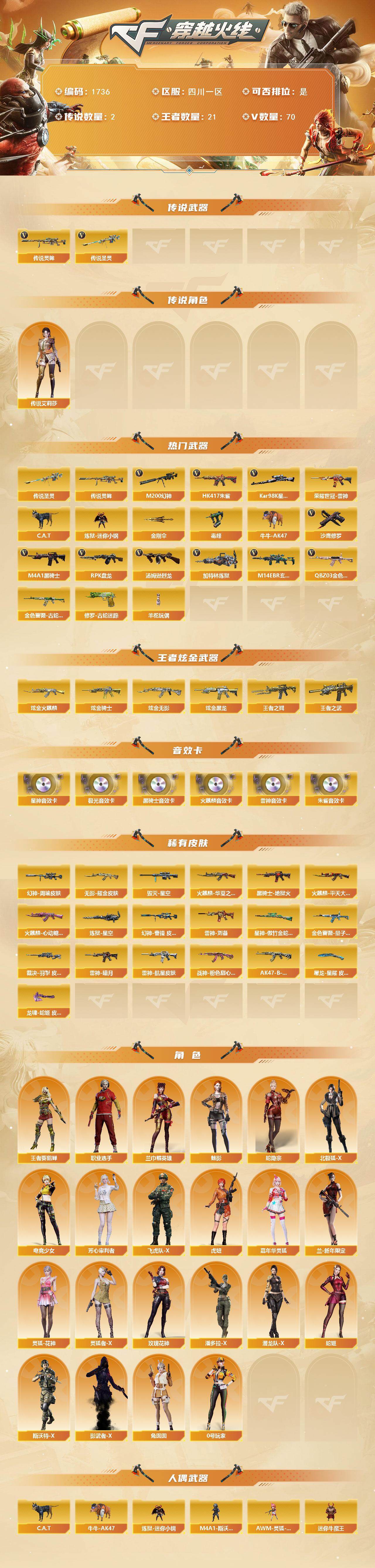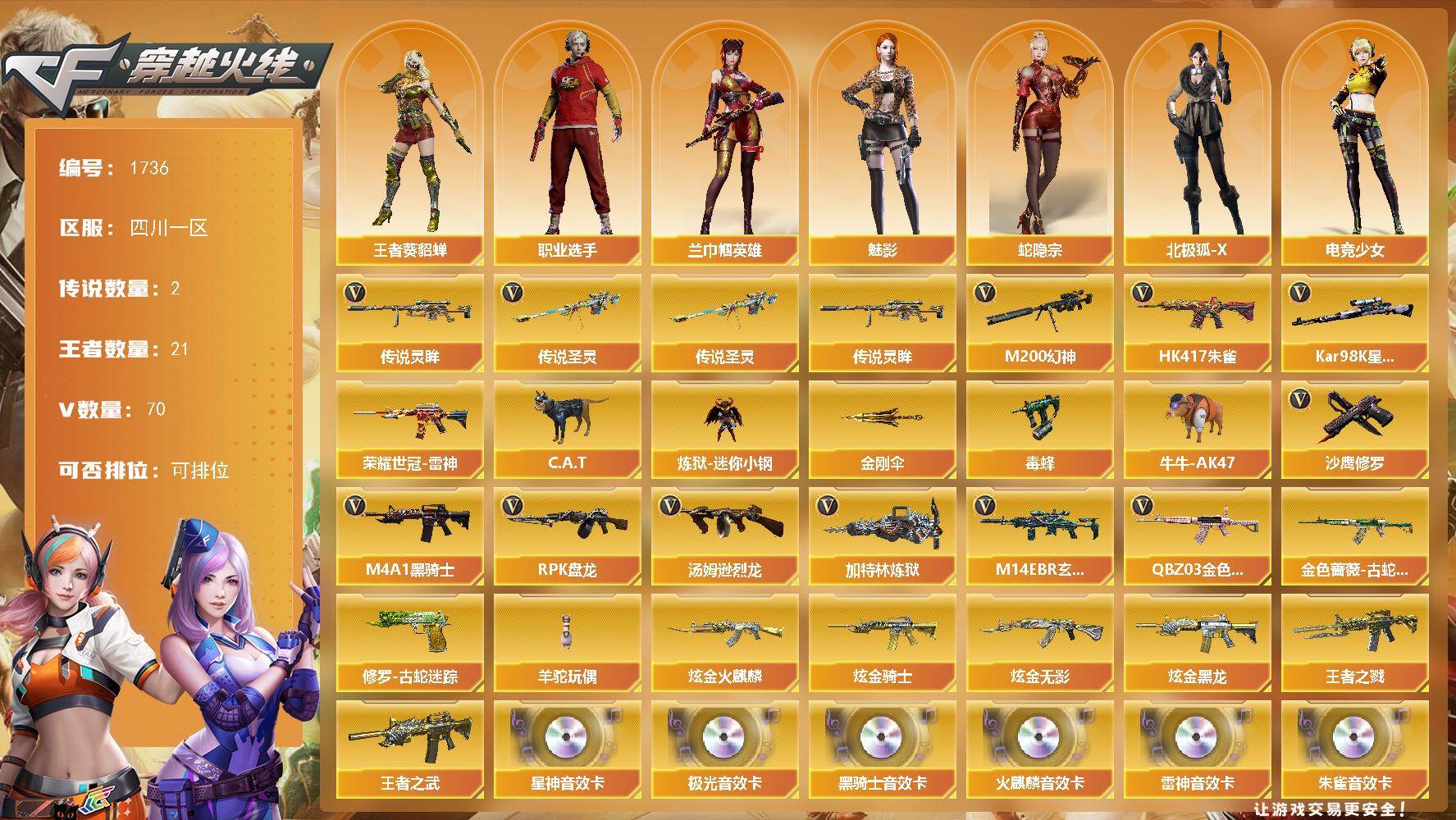 【1736】特12279可排位-可二次【四川一区/90v/vip6/3传说】【纯白无封号/传说艾莉莎/传说圣灵/传说灵眸/5烈龙毒蜂/星神三件套/幻神带皮/裁决带皮/8手呛拉满/7套雷/雷神三件套/火麒麟三件套/黑骑士三件套/a背包拓展】【m200-幻神/幻神-曹操 皮肤/幻神-周瑜皮肤】【kar98k-星神/kar98k-星神音效卡】【awm-裁决/裁决-羽掣 皮肤】【白虎之魄】【q-03-王者蔷薇/q03-金色蔷薇2/金色蔷薇-量子蔷薇 皮肤】【王者之心/王者之戮/王者之啸/王者之武2】【m4a1-雷神/m4a1-雷神音效卡/雷神-航星皮肤/雷神-暗月】【cop 357-雷霆王者】【barrett-毁灭/毁灭-星空】【ak47-火麒麟2/ak47-火麒麟音效卡/火麒麟-cfstar2/火麒麟-心动糖果/火麒麟-华夏之心/火麒麟-平天大圣2】【m4a1-黑骑士/m4a1-黑骑士音效卡/黑骑士-海王/黑骑士-地狱火】【hk417-朱雀/hk417-朱雀音效卡】【ak47-无影/无影-神兵利器】【黑武士-cf网剧冠军/黑武士-锦绣游龙】【awm-天龙/天龙-cfstar2】【barrett-极光音效卡】【m4a1-千变】【汤姆逊-烈龙5】【rpk-盘龙】【加特林-炼狱/炼狱-悦蓝/炼狱-星空】【沙鹰-修罗5/修罗-cfstar】【天神-cf网剧冠军】【擎天/擎天-cf网剧冠军】【屠龙2】【龙啸-堕天神/龙啸-烈火龙威】【职业选手/王者-葵-貂蝉/魅影/兰-巾帼英雄/木兰/兔囡囡/兰-新年限定/灵狐-花神/潘多拉-x/斯沃特-x/救世主-x/影武者-x/幻影/堕天使/复仇者】【m14ebr-玄武/m4a1-玫瑰精灵】【ak47-b-常胜将军/ak47-b-身先士卒/ak47-b-战士/ak-47-猩红传说】【ak47-黑鲨】【barrett-暗月传说】【colt1911-小故障/colt 1911-大黄蜂5/柯尔特-萌杀/cop 357-青龙】【雷霆王者之锋/斩魔刀/斩神刀2/金刚伞】【神圣爆裂者-末日iii/激光毁灭者iii-白马银呛/激光毁灭者iii】【炼狱-迷你小钢/斯泰尔-巧克力/轻型军用手斧-镜2】【牛牛-ak47/猫猫手套2/c.a.t/夺魂/m4a1-斯沃特】【高爆手蕾-雷霆王者/闪光丹-雷霆王者/盐雾蛋-雷霆王者3】【高爆手蕾-堕天神3/闪光丹-堕天神3/盐雾蛋-堕天神4】【高爆手蕾-神工天巧/闪光丹-神工天巧2/盐雾蛋-神工天巧3】【高爆手蕾-幻灵2】【炫金火麒麟/炫金无影/炫金黑龙/炫金骑士】【超级护目镜/烟雾保护头盔/闪光护目镜/超级对讲机/超级背包/防弹头盔4/防弹衣4/c4工具钳2/手蕾包3/防化服2】截图展示段位不代表实际段位,如赛季更新等不/拒因素发生变化、时限道具不保证所剩时间1227969939 金额2980