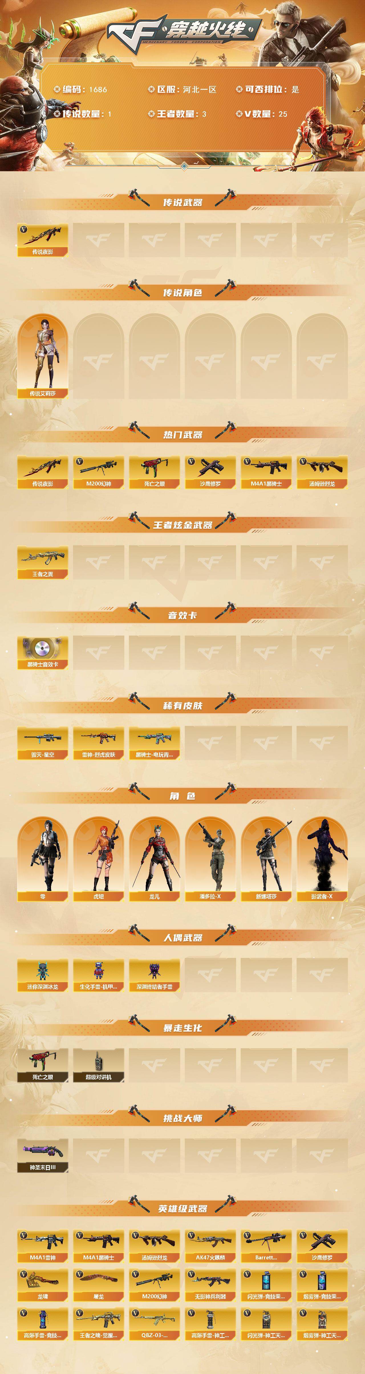 河北一区-27v-3王者武器数-0炫金武器数 【传说武器】:传说夜影 【传说角色】:传说艾莉莎 【热门武器】:传说夜影,m200-幻神,死亡之眼,m4a1-黑骑士,汤姆逊-烈龙4,沙鹰-修罗3 【王者炫金武器】:王者之翼 【音效卡】:m4a1-黑骑士音效卡 【皮肤】:雷神-烈虎皮肤,毁灭-星空,黑骑士-电玩青兔皮肤 【角色】:零,虎妞,龙儿,潘多拉-x,新娜塔莎,影武者-x 【人偶武器】: