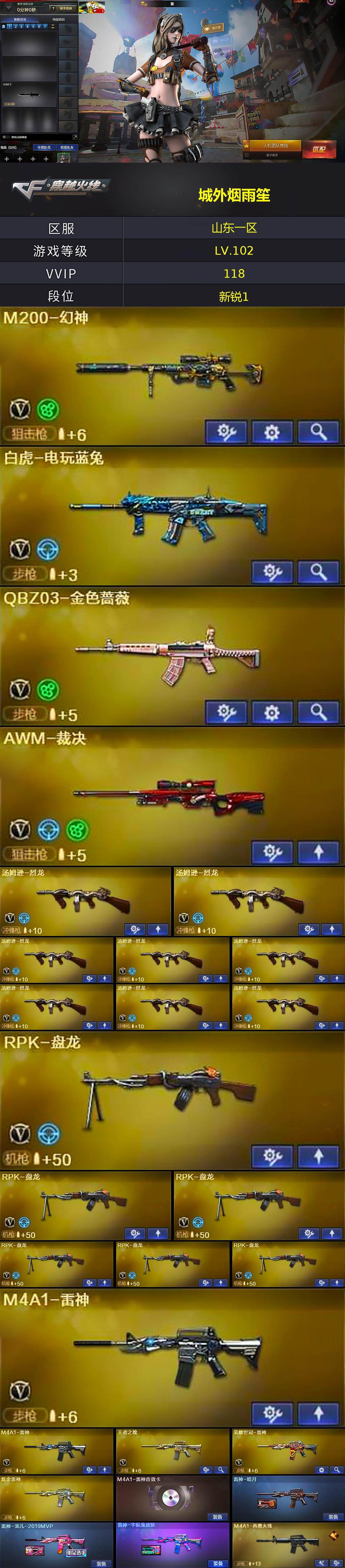 [16314466]山东一区-121v-9王者武器数-7炫金武器数 【热门武器】:q03-金色蔷薇,m200-幻神,死亡之眼,荣耀世冠-雷神,白虎-电玩蓝兔,m4a1-黑骑士2,汤姆逊-烈龙8,rpk-盘龙6,加特林-炼狱3,沙鹰-修罗6 【王者炫金武器】:王者之幻,王者之翼,玫瑰精灵-悦动2,炼狱-悦蓝,炫金骑士3,炫金无影,炫金黑龙,炫金雷神,炫金天龙 【音效卡】:ak47-火麒麟音效卡,m4a1-雷神音效卡,m4a1-黑骑士音效卡,barrett-毁灭音效卡,barrett-极光音效卡,死神-雪域霜狐-怀旧音效卡 【皮肤】:雷神-暗月,雷神-宠儿-2019mvp,雷神-宇航兔皮肤,m4a1-再燃火线,火麒麟-雷神,毁灭-星空,毁灭-虹光风暴 皮肤,m4a1-千变-孔明皮肤,黑龙-能量核心,黑龙-暗月,黑骑士-暗月,无影-暗月,无影-能量核心,死神-秘银,黑武士-典韦皮肤,天启-暗月,战神-粉色甜心皮肤,ak47-b-常胜将军-曹操,ak47-b-常胜将军-刘备,ak47-b-常胜将军-孙权,天龙-秘银,天龙-能量核心,awm-天龙-传奇白鲨,极光-能量核心,炼狱-星空,修罗-能量核心,天神-暗月,屠龙-惊鸿 皮肤,轻型军用手斧-再燃火线 【角色】:葵,樱,魅影,王者复仇,王者玲珑-小乔,雪域霜狐,暗夜-x,初恋灵狐,芳心审判者,嘉年华灵狐,娟娟,兰妹妹,零-水下丽影,灵狐者-x,龙儿-小淘气,潘多拉-x,潘多拉-甜心教官,潜龙队-x,青霞仙子,斯沃特-x,铁骑荣耀,兔囡囡,樱-战斗天使,影武者-x 【人偶武器】:火麒麟-灵狐,awm-灵狐-15周年嘉年华,cop-旗袍,迷你深渊冰龙,迷你裂空之翼,迷你牛牛2,迷你生化手蕾,闪光丹-小乔,闪光丹-貂蝉,高爆手蕾-大乔,迷你艾比,迷你超能女侍 【暴走生化】:死亡之眼,超级对讲机 【挑战大师】:暴君乱世-超越max,神圣爆裂者iii,激光毁灭者iii2,机甲撕裂者iii,kac-圣炎切割者iii,阐释者iii2 【英雄级武器】:ak47-火麒麟2,m4a1-黑龙3,m4a1-雷神2,m4a1-黑骑士2,ak47-无影2,ak47-黑武士3,an94-超新星,m4a1-武圣,ak47-机械迷城,ak47-黑鲨2,m4a1-龙血2,死神-雪域霜狐,m4a1-玫瑰精灵2,q03-金色蔷薇,王者之