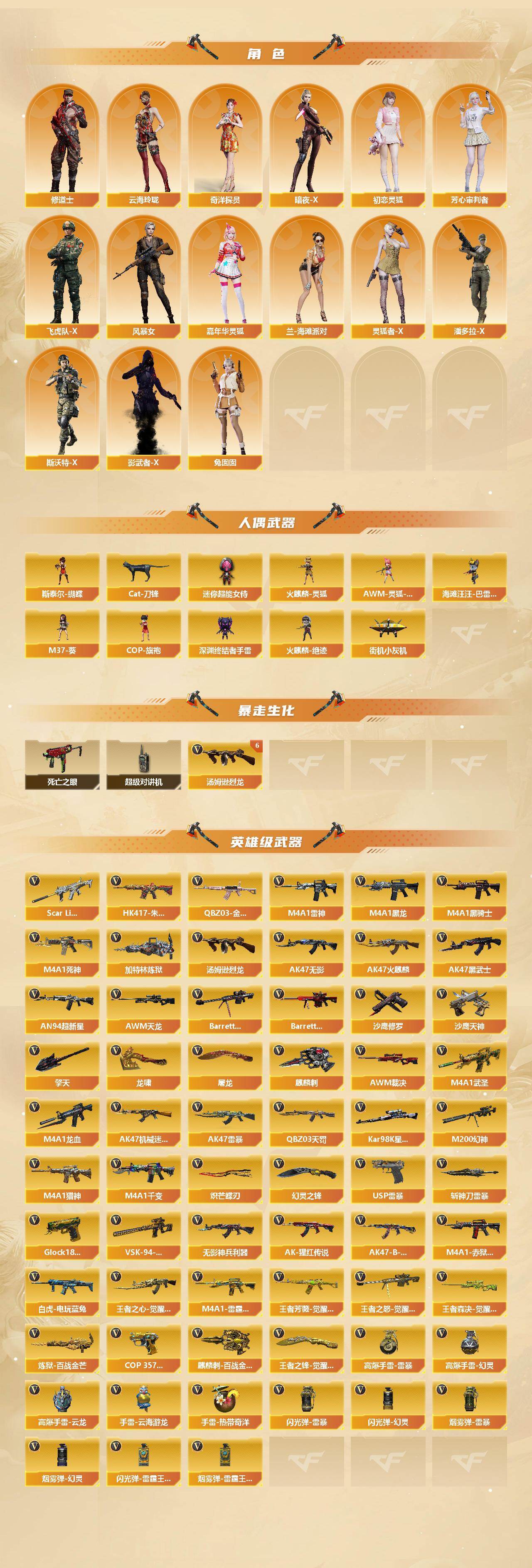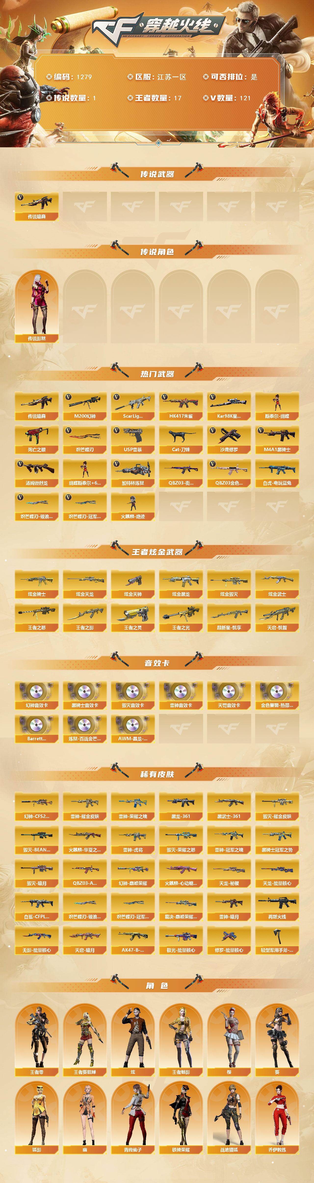 [16316608]江苏一区-121v-17王者-9炫金 【传说武器】:传说暗裔 【传说角色】:传说影煞 【热门武器】:传说暗裔,q03-金色蔷薇,scar light-白虎,hk417-朱雀,m200-幻神2,死亡之眼3,白虎-电玩蓝兔,q03-街机,kar98k-星神,cat-刀锋,m4a1-黑骑士,汤姆逊-烈龙6,加特林-炼狱4,斯泰尔-蝴蝶2,火麒麟-绝迹,usp-雷暴,沙鹰-修罗5,炽芒蝶刃,炽芒蝶刃-破浪逐光 皮肤,炽芒蝶刃-冠军炽芒皮肤 【王者炫金武器】:超新星-悦享,天启-悦智,王者之影,王者之光,王者之怒,王者之灵,炫金骑士,炫金黑龙,炫金武士2,炫金毁灭,炫金天龙,炫金天神3 【音效卡】:q03-金色蔷薇-热带奇洋音效卡,m200-幻神音效卡,m4a1-雷神音效卡2,m4a1-黑骑士音效卡,barrett-毁灭音效卡,q03-天罚音效卡,barrett-碧霄极光音效卡4,炼狱-百战金芒-庆典舞曲音效卡,awm-昌龙-怀旧音效卡2 【皮肤】:幻神-巅峰荣耀,幻神-cfs2022,白虎-白鲨-cfpls23冠军,q03-ag-cfpls19冠军,裁决-巅峰荣耀 皮肤,雷神-暗月,雷神-荣耀之魄,雷神-虎将,雷神-耀金皮肤,雷神-冠军之魄,m4a1-再燃火线,火麒麟-华夏之心2,火麒麟-心动糖果,毁灭-暗月,毁灭-荣耀之怒,毁灭耀金皮肤,毁灭-bean-2020mvp,m4a1-黑龙-361,黑骑士-冠军之势,无影-能量核心,ak47-黑武士-361,天启-暗月2,ak47-b-常胜将军-孙权,天龙-秘银,天龙-能量核心,极光-能量核心,修罗-能量核心,轻型军用手斧-再燃火线,炽芒蝶刃-冠军炽芒皮肤,炽芒蝶刃-破浪逐光 皮肤 【角色】:葵,樱,炫,战地猎狐,王者-葵-貂蝉,王者-零,王者-魅影,狐影,奇洋探员,乔伊教练,修道士,云海玲珑,暗夜-x,初恋灵狐,芳心审判者,飞虎队-x,风暴女,嘉年华灵狐,兰-海滩派对,灵狐者-x,潘多拉-x,青霞仙子,斯沃特-x,铁骑荣耀,兔囡囡,影武者-x,幽 【人偶武器】:火麒麟-绝迹,火麒麟-灵狐,斯泰尔-蝴蝶2,街机小灰机,awm-灵狐-15周年嘉年华,海滩汪汪-芭蕾特,m37-葵,cop-旗袍,cat-刀锋,深渊终结者手蕾,迷你超能女侍 【暴走生化】:死亡之眼3,超级对讲机 【英雄