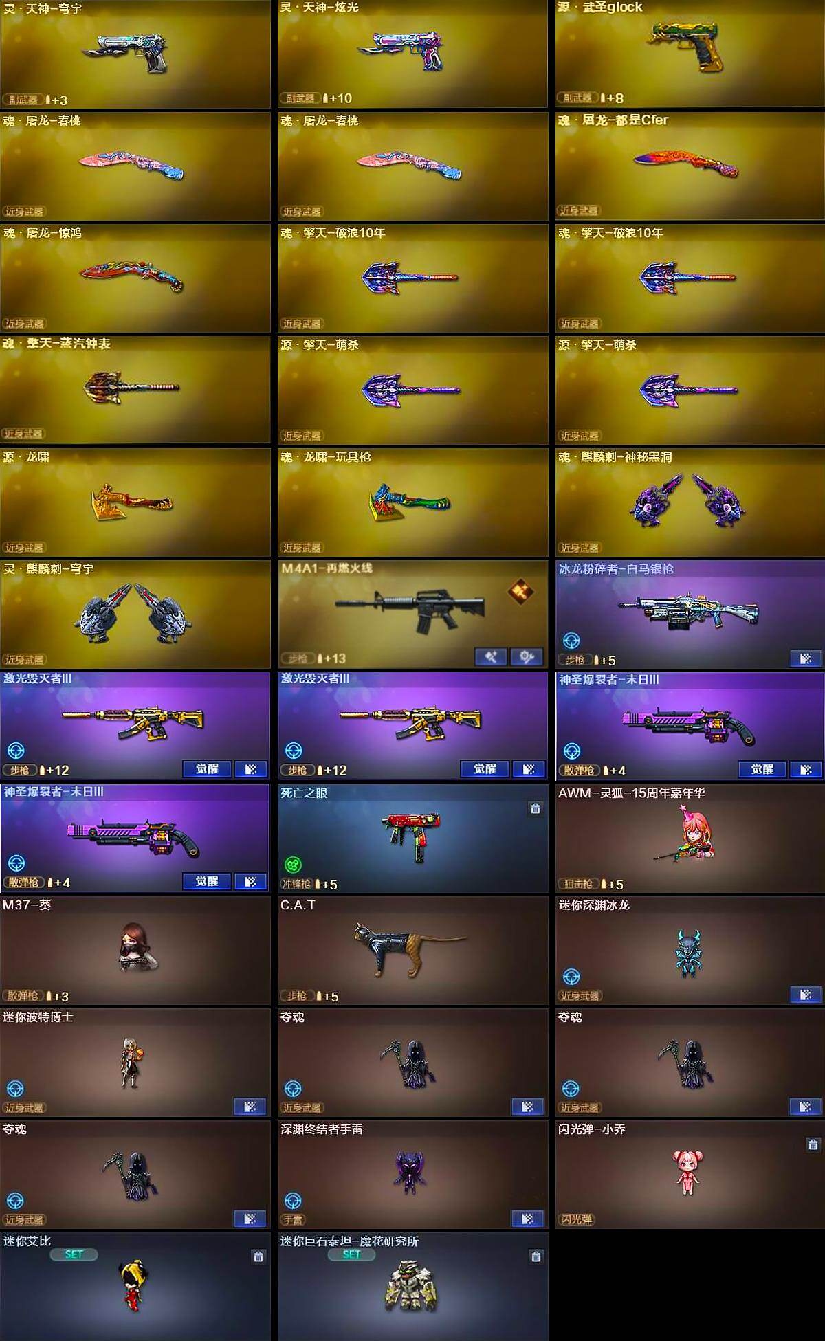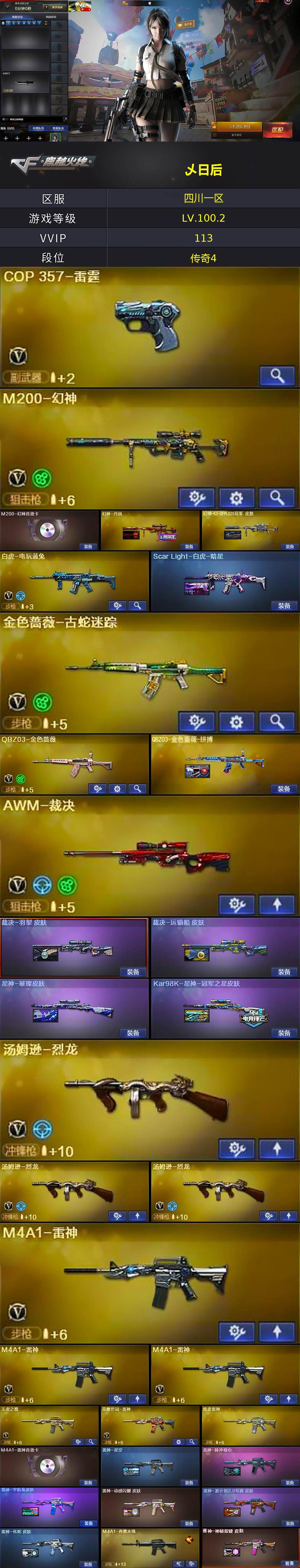 [16317176]四川一区-108v-4王者武器数-6炫金武器数 【热门武器】:q03-金色蔷薇,hk417-朱雀,m200-幻神,金色蔷薇-古蛇迷踪,修罗-古蛇迷踪,死亡之眼,荣耀世冠-雷神,白虎-电玩蓝兔,金色小号,c.a.t,m4a1-黑骑士2,汤姆逊-烈龙3,加特林-炼狱2,沙鹰-修罗3 【王者炫金武器】:王者之势,王者之影,王者之灵,炫金骑士,炫金雷神,炫金超新星2,炫金毁灭,炫金天神 【音效卡】:m200-幻神音效卡,m4a1-雷神音效卡,m4a1-黑骑士音效卡,barrett-毁灭音效卡,炼狱-百战金芒-庆典舞曲音效卡,死神-雪域霜狐-怀旧音效卡 【皮肤】:幻神-丹凤,幻神-kz-cfpls25冠军 皮肤,scar light-白虎-暗星,q03-金色蔷薇-拼搏,裁决-羽掣 皮肤,裁决-运输船 皮肤,裁决-胜者为王 皮肤,星神-璀璨皮肤,kar98k-星神-冠军之星皮肤,雷神-星空,雷神-脉冲核心,雷神-宇航兔皮肤,雷神-动感闪耀 皮肤,雷神-源计划2.0专属 皮肤,雷神-化蛇 皮肤,m4a1-再燃火线,雷神-神秘按键 皮肤,火麒麟-华夏之心,火麒麟-心动糖果,毁灭耀金皮肤,毁灭-星空,毁灭-英雄计划 皮肤,m4a1-千变-孔明皮肤,黑龙-能量核心,黑骑士-破界 皮肤,战神-粉色甜心皮肤,战神-紫绶金章皮肤,战神-流金岁月皮肤,修罗-星空,屠龙-惊鸿 皮肤,龙啸-巅峰荣耀 皮肤,轻型军用手斧-再燃火线 【角色】:零,葵,樱,炫,战地猎狐,王者-瞳-闭月羞花,王者之瞳,堕落女神,雪域霜狐,蛇隐宗,奇洋探员,乔伊教练,云海玲珑,暗夜-x,芳心审判者,飞虎队-x,风暴女,嘉年华灵狐,兰-海滩派对,兰妹妹,0号玩家,零-水下丽影,灵狐者-x,灵狐者-黄金海岸,灵狐者-七夕宝贝,龙儿,曼陀罗-x,曼陀罗-礼服,潘多拉-甜心教官,青霞仙子,蛇姬,斯沃特-x,蜀雪,铁骑-乘风破浪,兔囡囡,维纳斯,新娜塔莎,雪莉杨,夜玫瑰-幻能朋克,影武者-x,游珑儿 【人偶武器】:awm-灵狐-15周年嘉年华,m37-葵,c.a.t,迷你深渊冰龙,迷你波特博士,夺魂3,深渊终结者手蕾,闪光丹-小乔,迷你艾比,迷你巨石泰坦-魔花研究所,灵狐娃娃手蕾 【暴走生化】:死亡之眼 【挑战大师】:冰龙粉碎者-白马银呛,激光毁灭者iii2,神圣爆裂者-末日iii2 【英雄级武器】:ak4